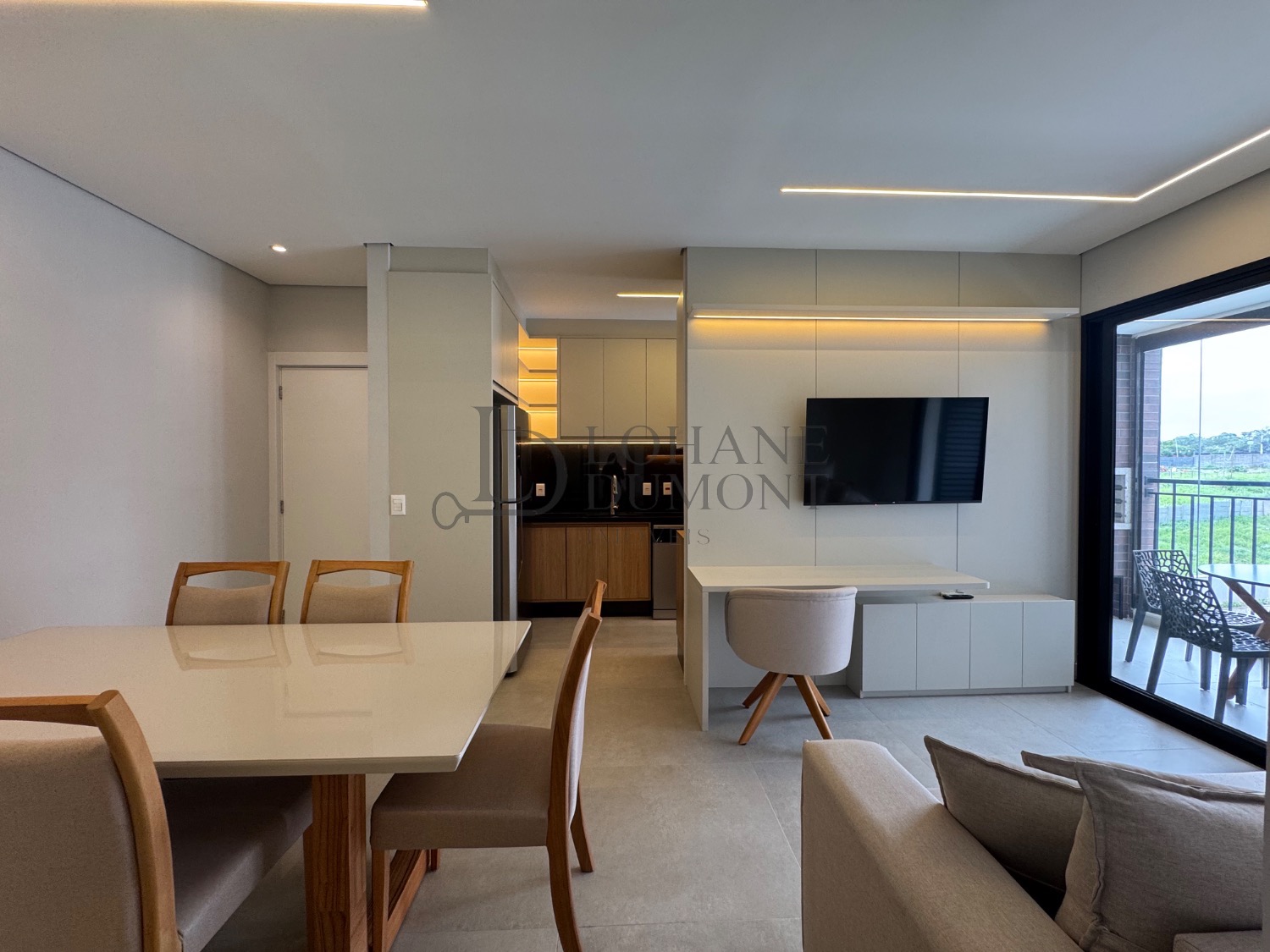 A área social é integrada, com sala de estar e jantar conectadas à cozinha planejada, criando um ambiente funcional, moderno e acolhedor.
