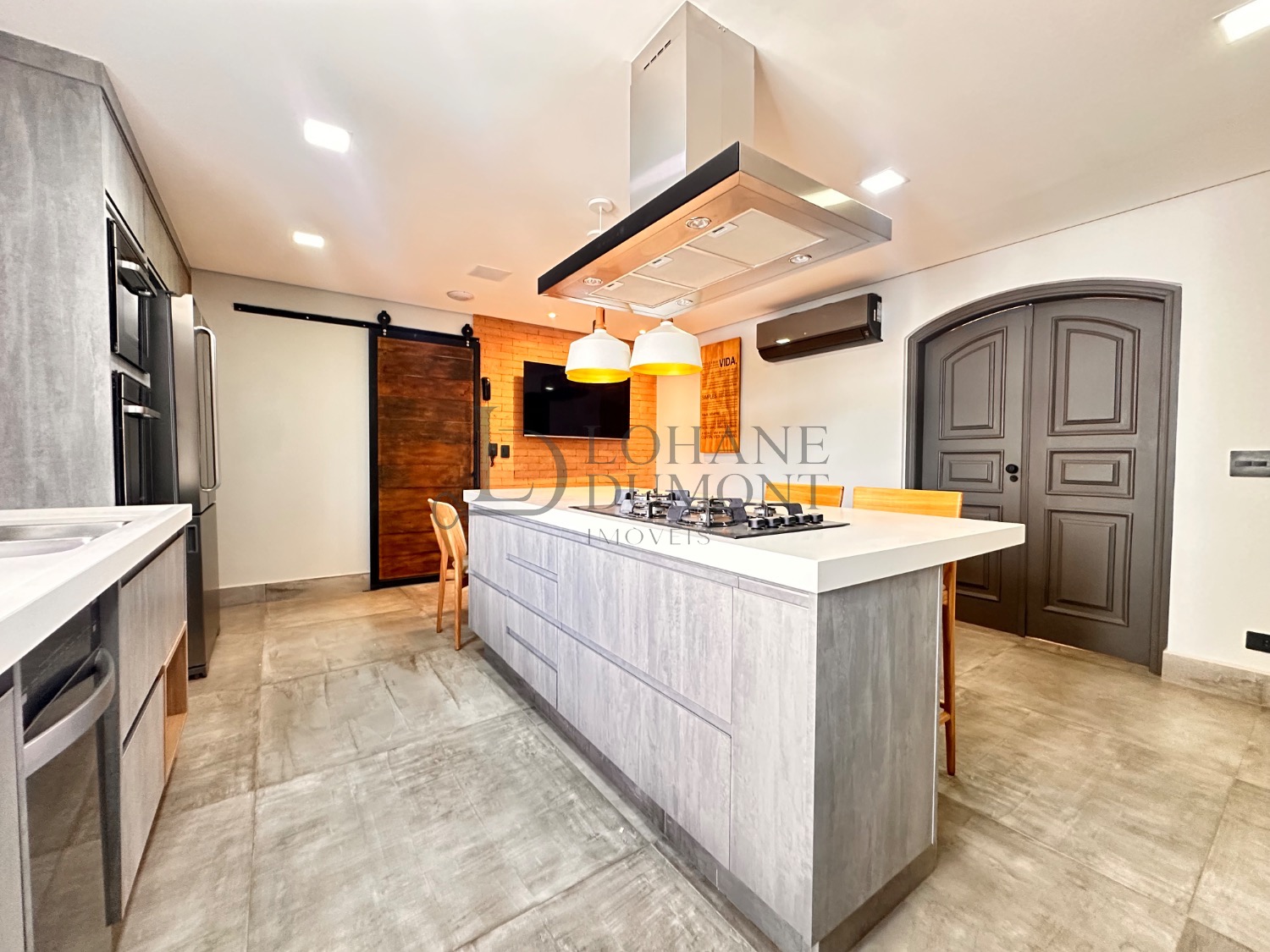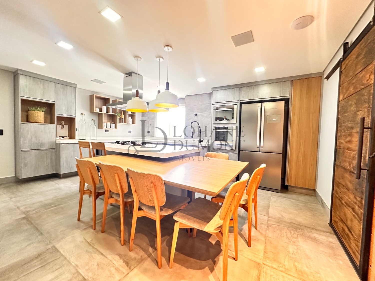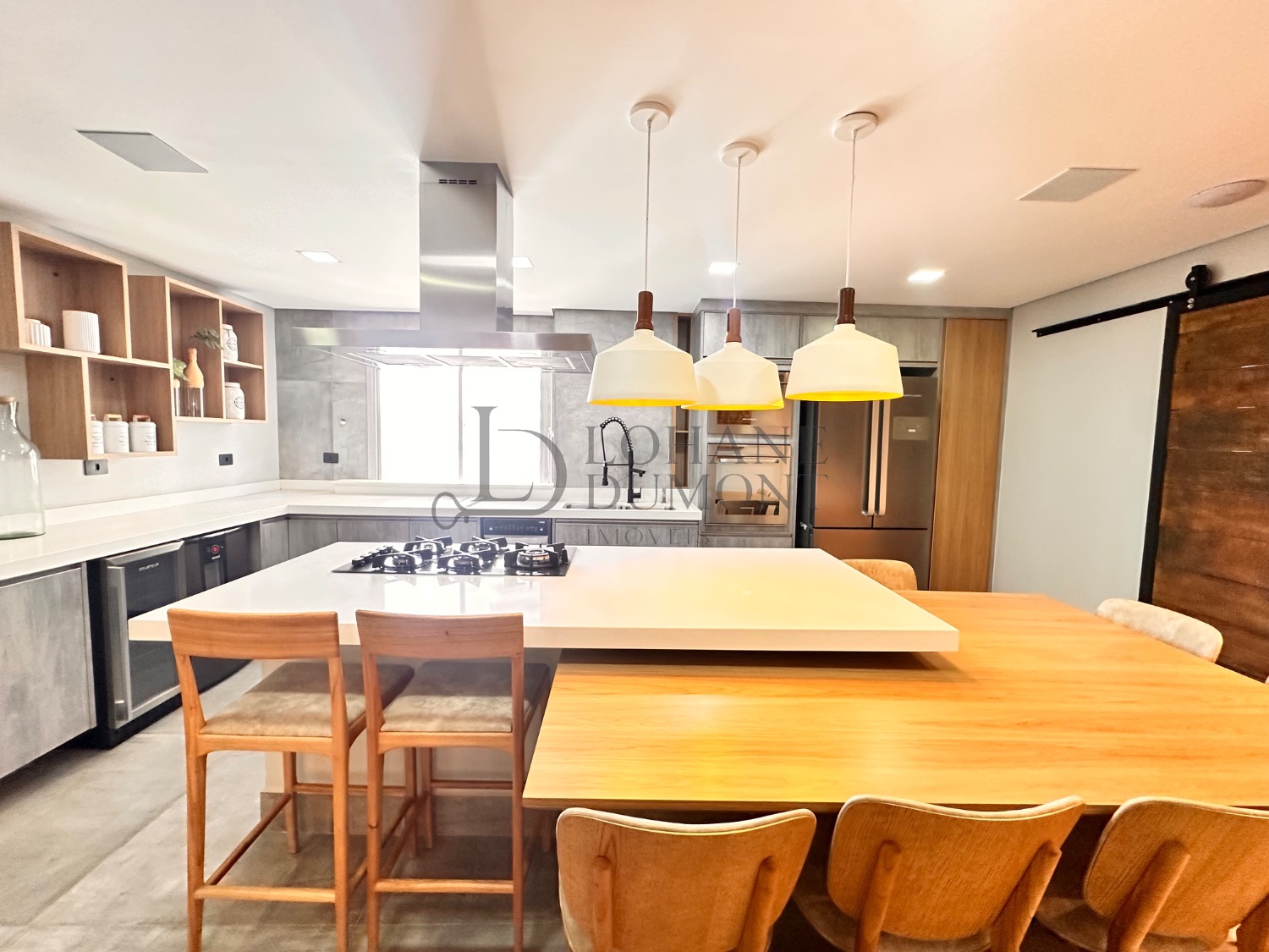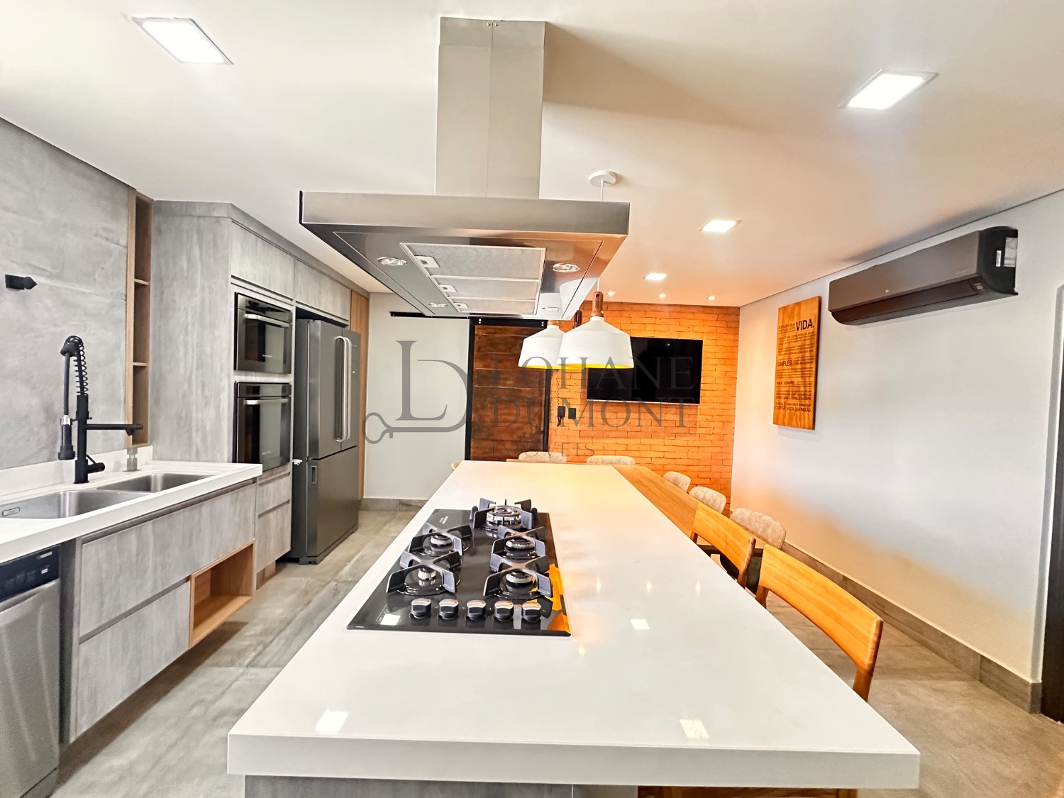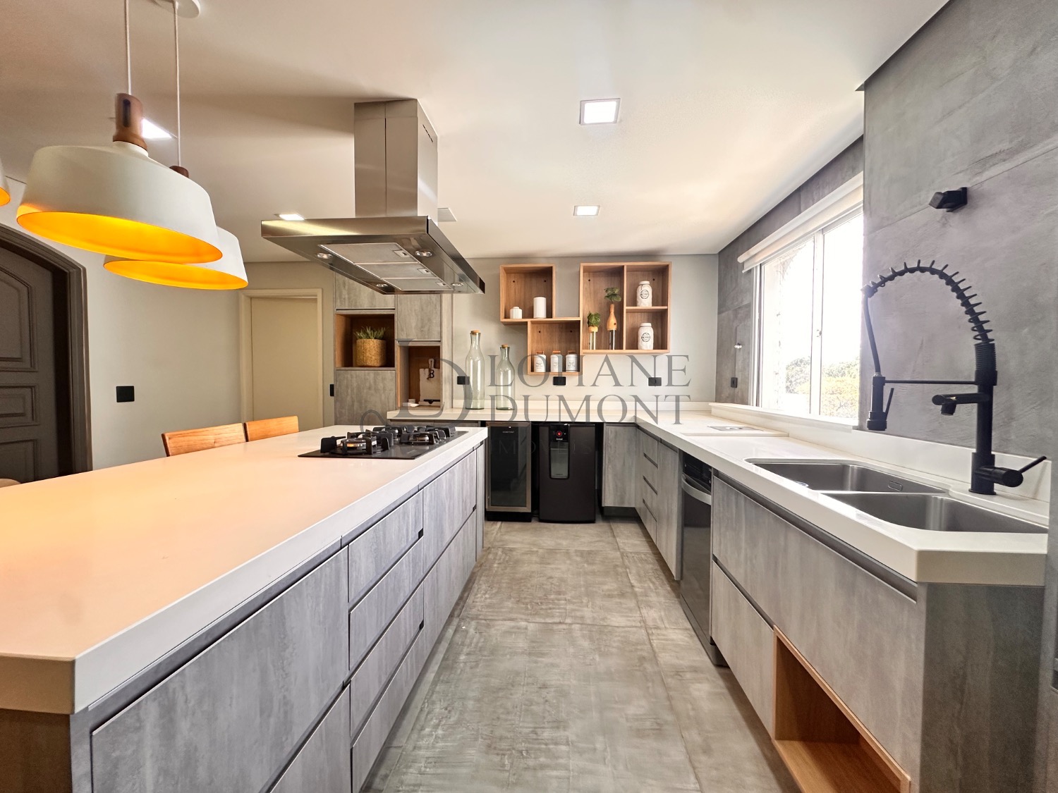 A cozinha é um grande destaque, rica em armários planejados, funcional e moderna, equipada com ilha central, que agrega praticidade e um toque contemporâneo ao espaço. A planta ainda conta com lavabo, despensa e área de serviço independente, garantindo organização e conforto no dia a dia.
