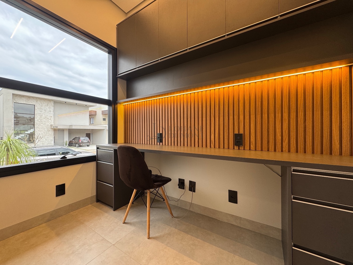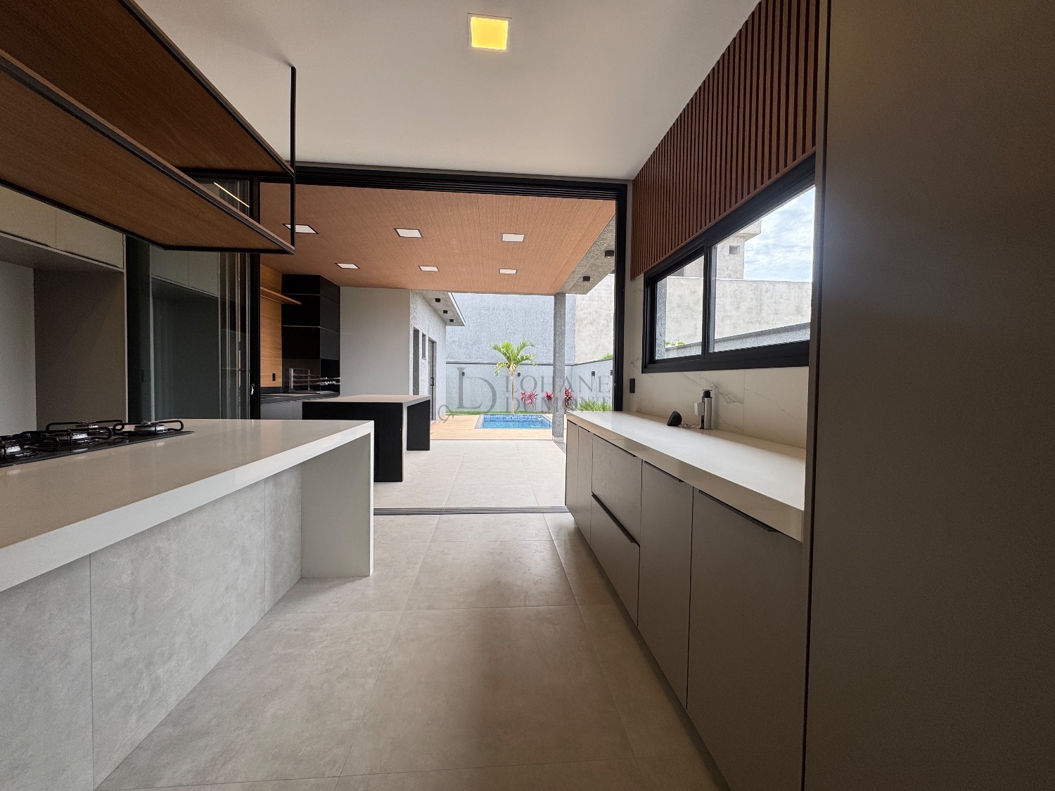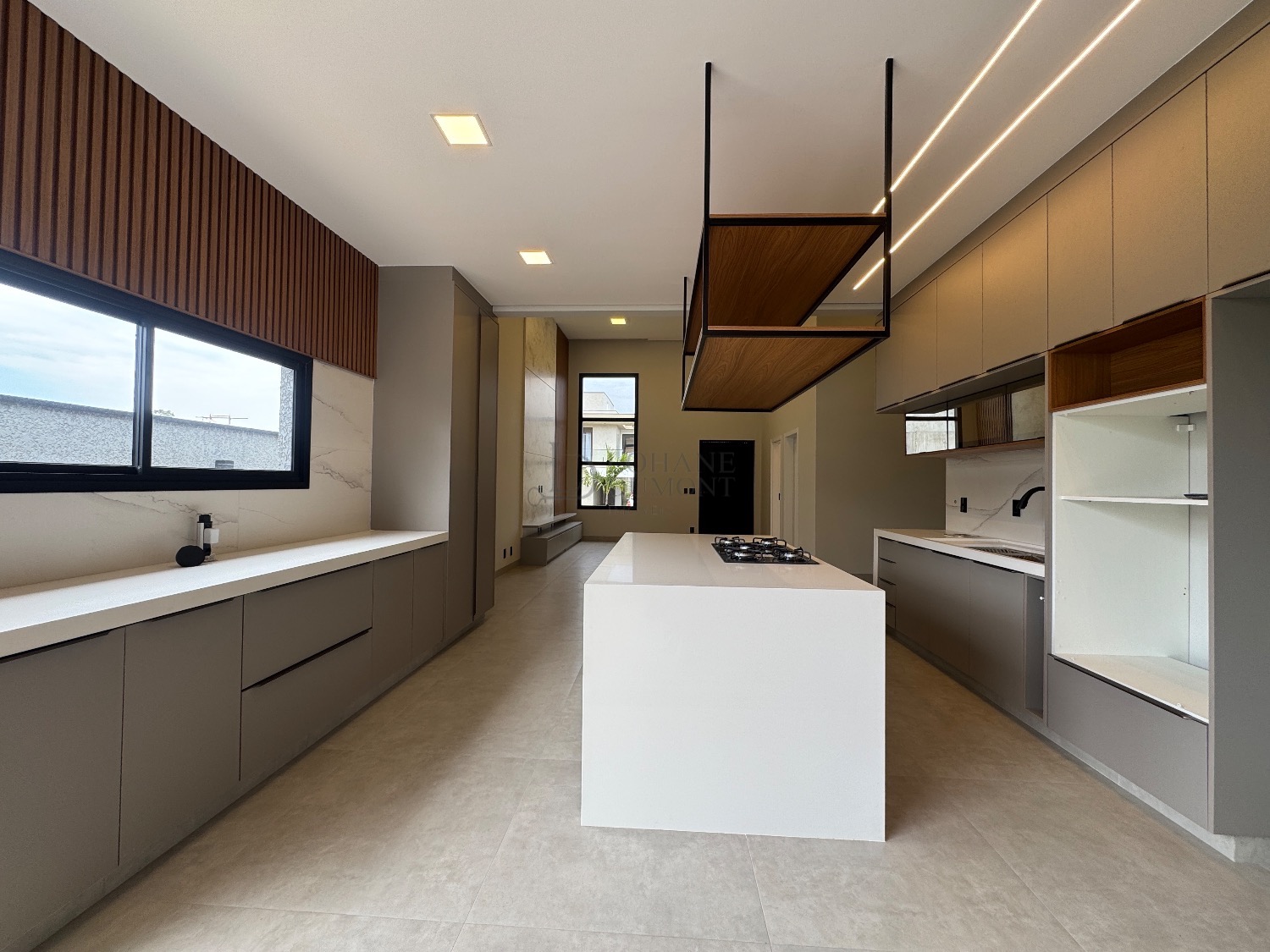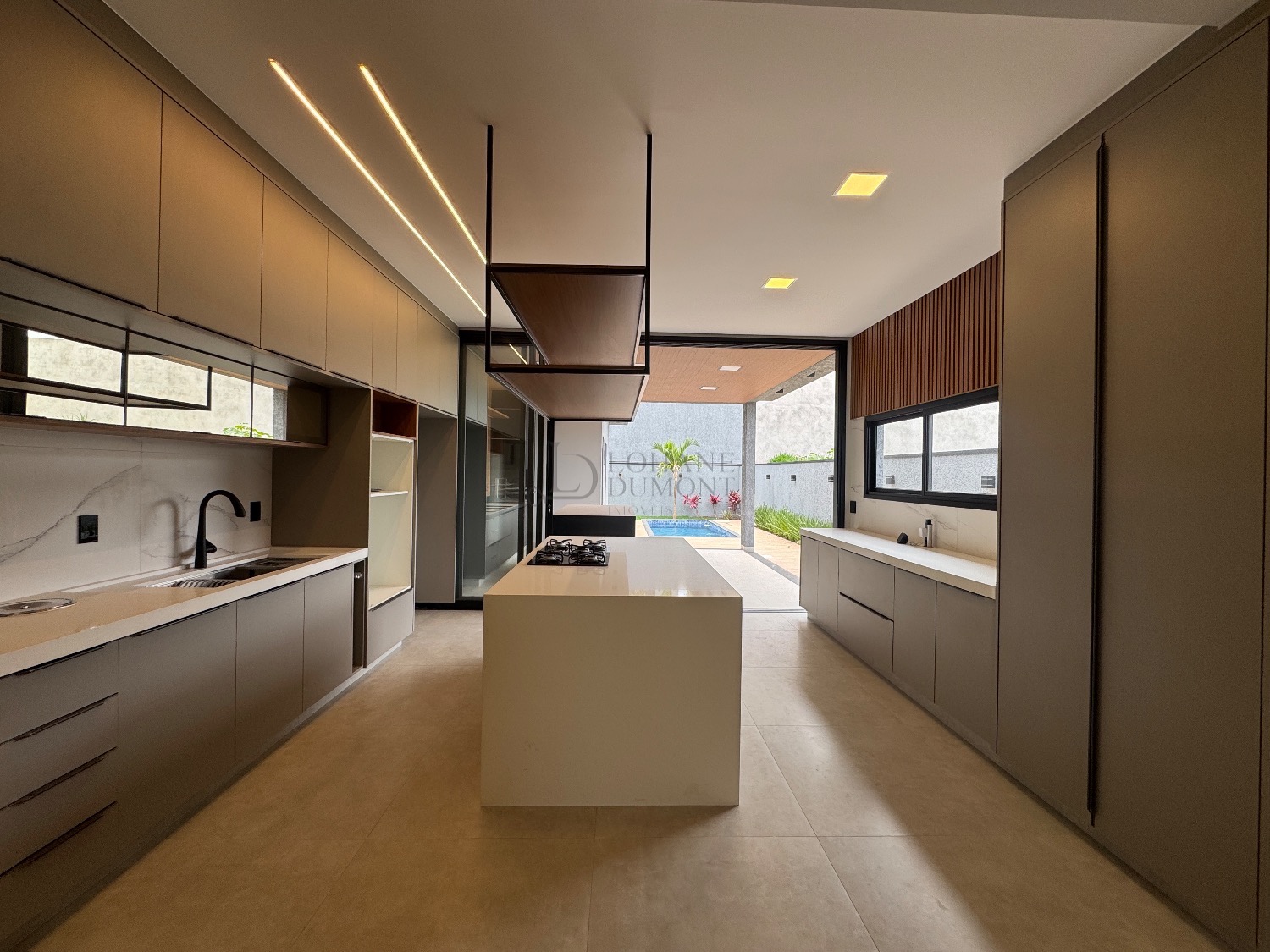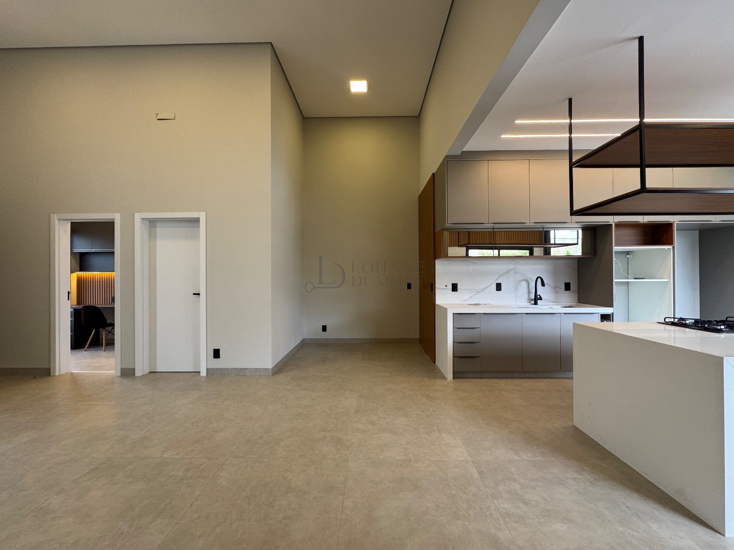 O coração da casa é a elegante cozinha americana com ilha, rica em marcenaria planejada e integrada a uma sala ampla com pé-direito duplo, proporcionando luminosidade e uma sensação incrível de amplitude. O imóvel possui ainda lavabo e um escritório perfeito para home office.