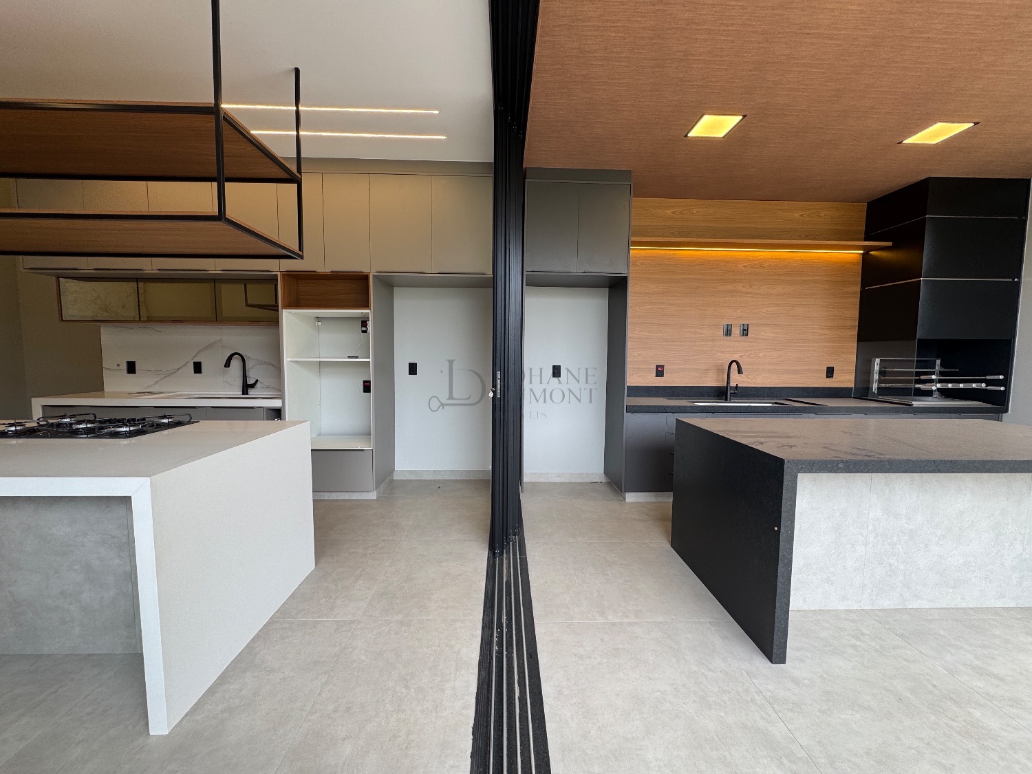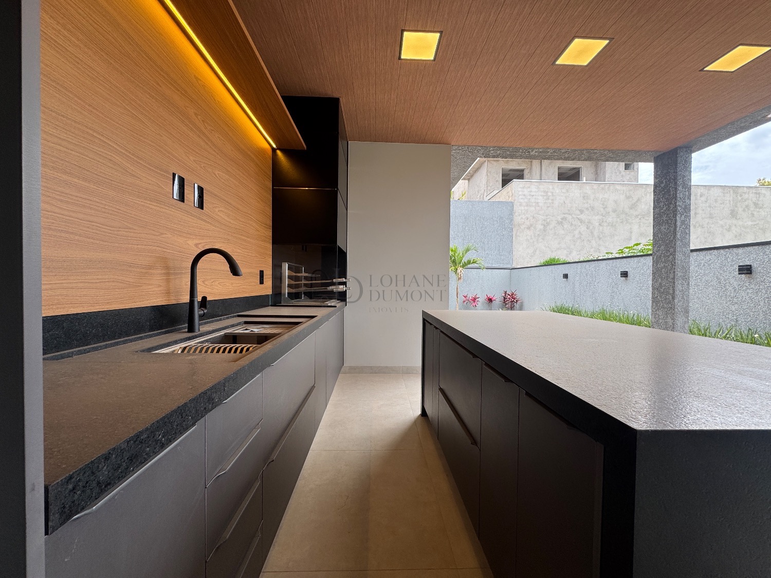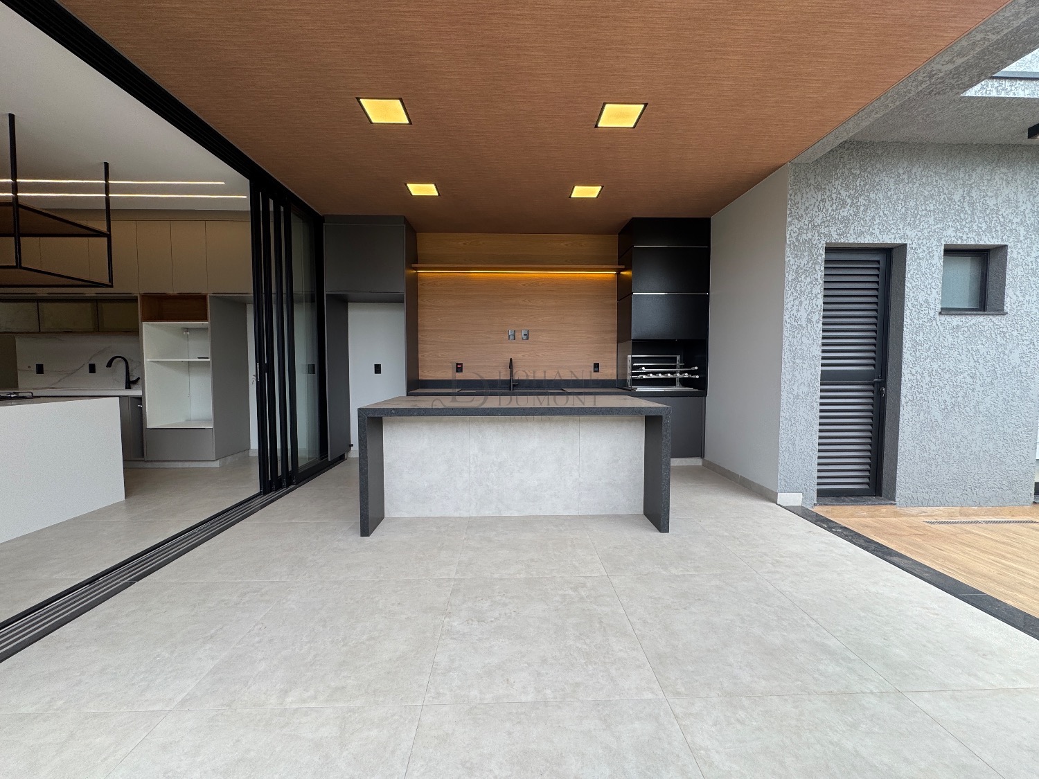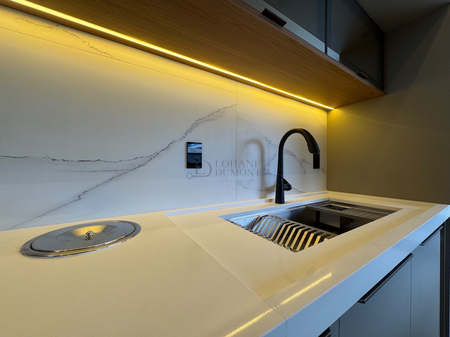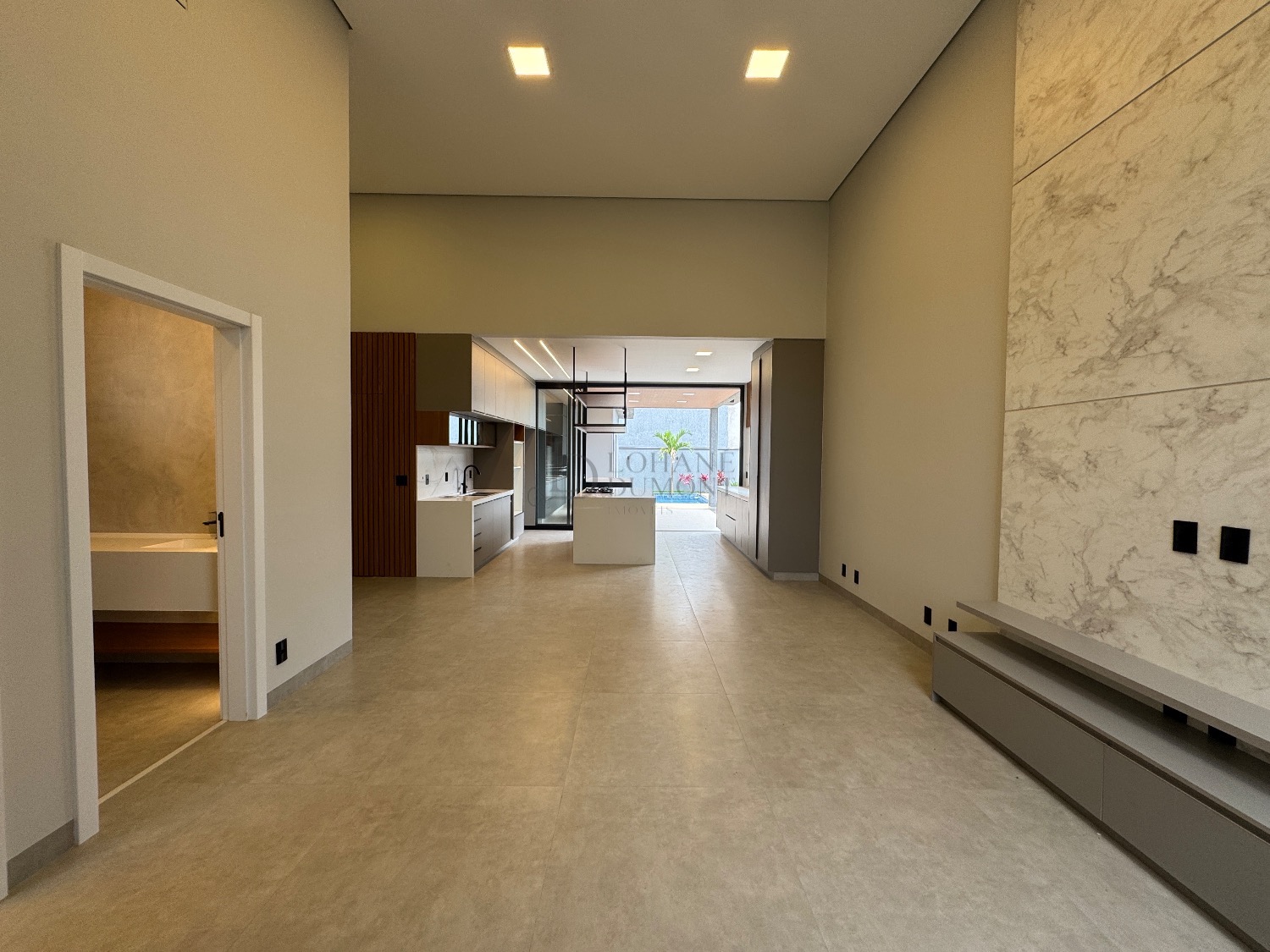 O coração da casa é a elegante cozinha americana com ilha, rica em marcenaria planejada e integrada a uma sala ampla com pé-direito duplo, proporcionando luminosidade e uma sensação incrível de amplitude. O imóvel possui ainda lavabo e um escritório perfeito para home office.