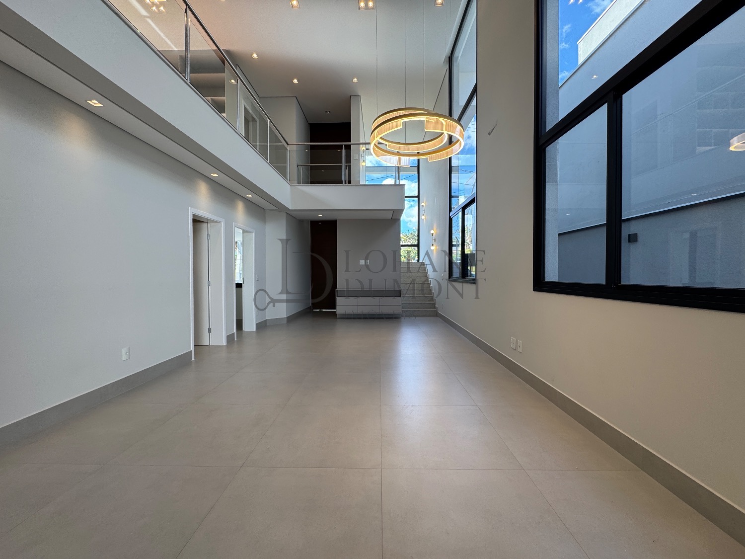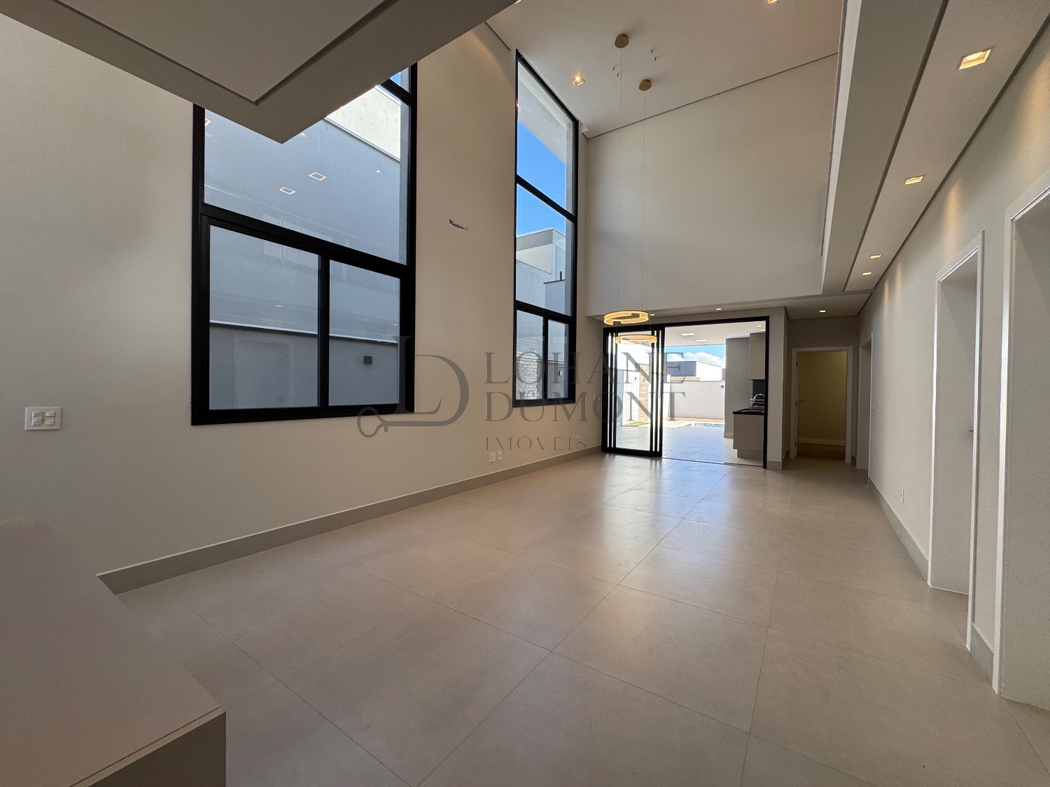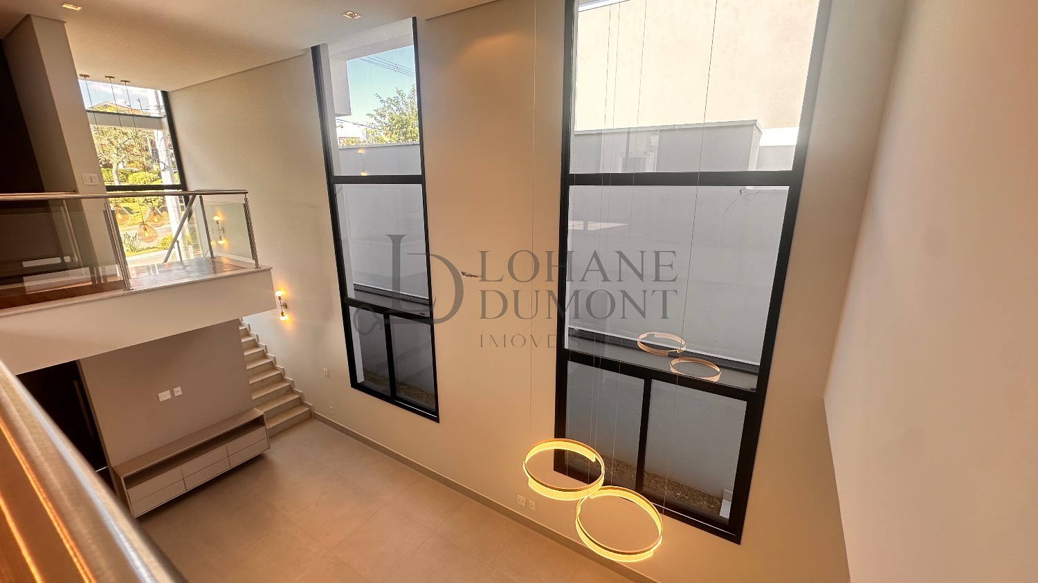O destaque imediato é o living com pé-direito duplo, que conecta sala de estar e jantar em um ambiente amplo, elegante e naturalmente iluminado, valorizado por iluminação em LED e excelente circulação de ar.