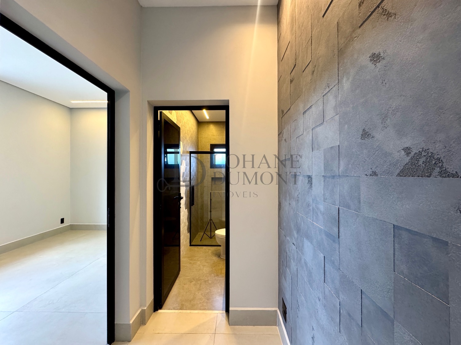 No pavimento superior estão três dormitórios, todos suítes, completos em armários planejados, com persianas elétricas com tela mosquiteira e preparação para ar-condicionado. A suíte master se destaca pelo amplo closet e pela varanda com vista para a área de lazer da casa, criando um ambiente acolhedor e reservado.