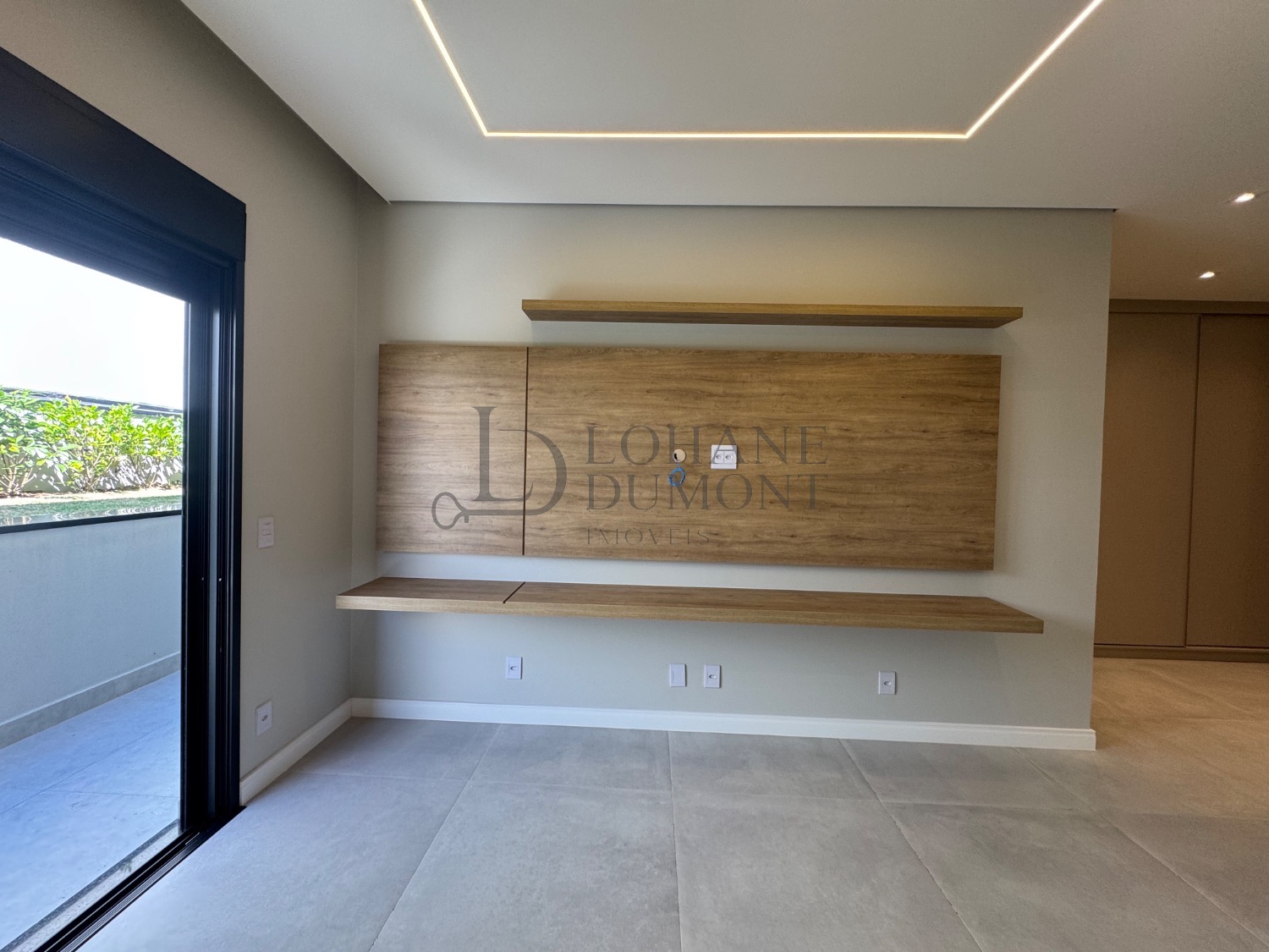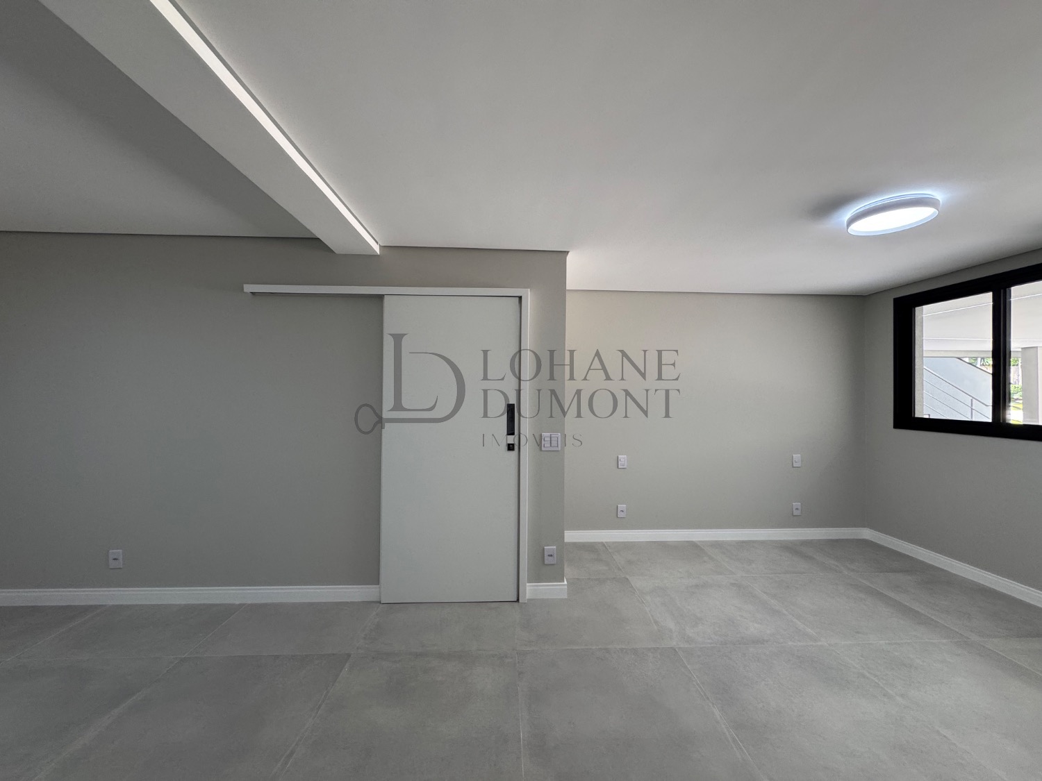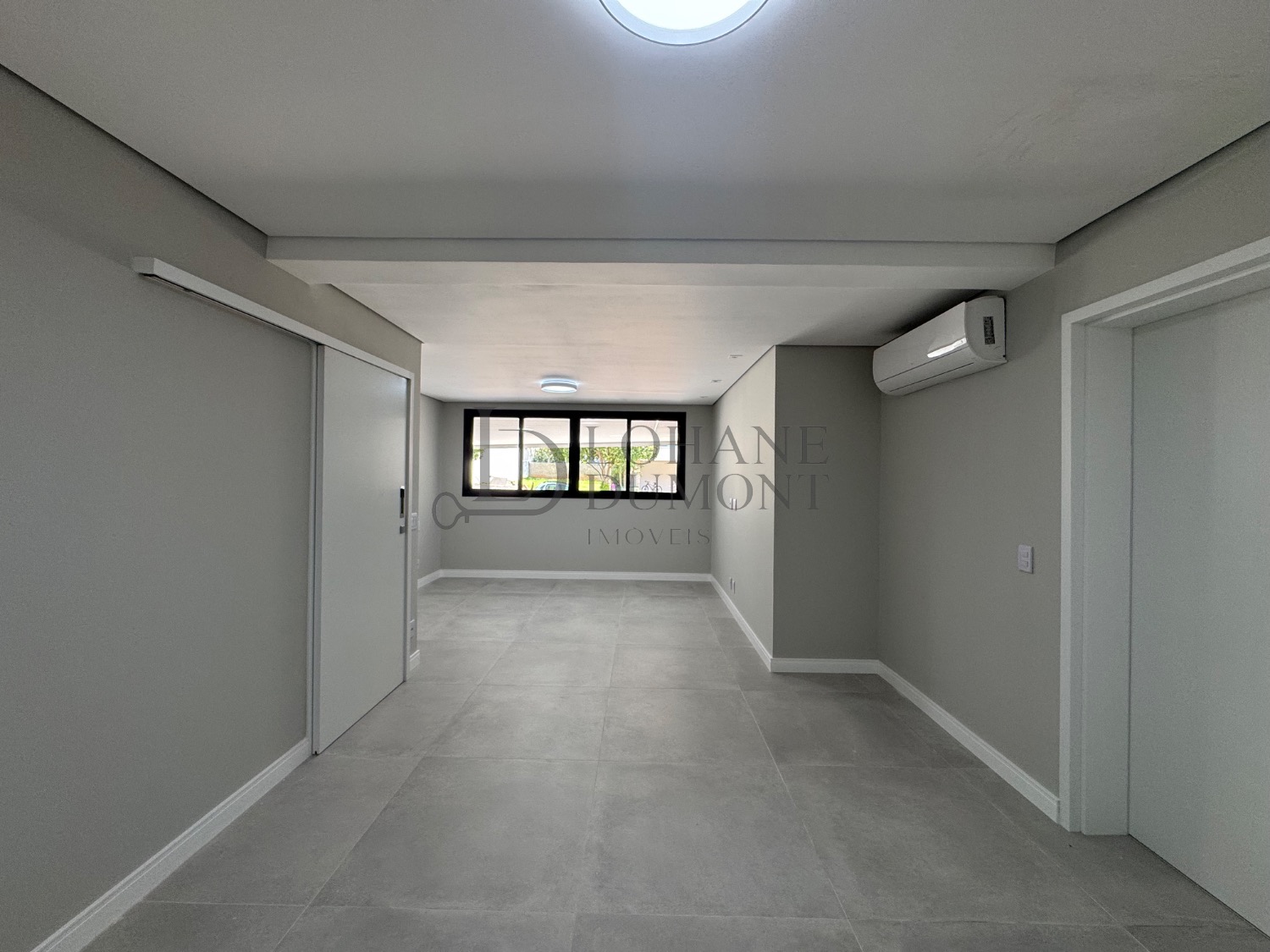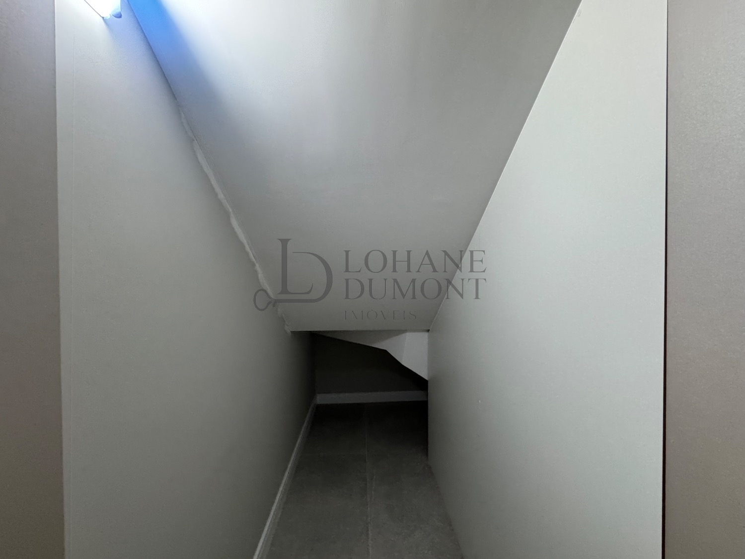 Logo na chegada, o hall social impressiona pelo acabamento elegante, com painel em madeira e iluminação em LED próximo à escada, criando um ambiente acolhedor e sofisticado. No pavimento térreo encontra-se uma suíte ampla com banheiro espaçoso, que pode ser utilizada também como home theater ou suíte para hóspedes. Neste mesmo nível há ainda um espaço de apoio versátil, ideal para home office ou sala de estudos, acompanhado de um depósito que pode ser integrado ao ambiente, ampliando sua funcionalidade.