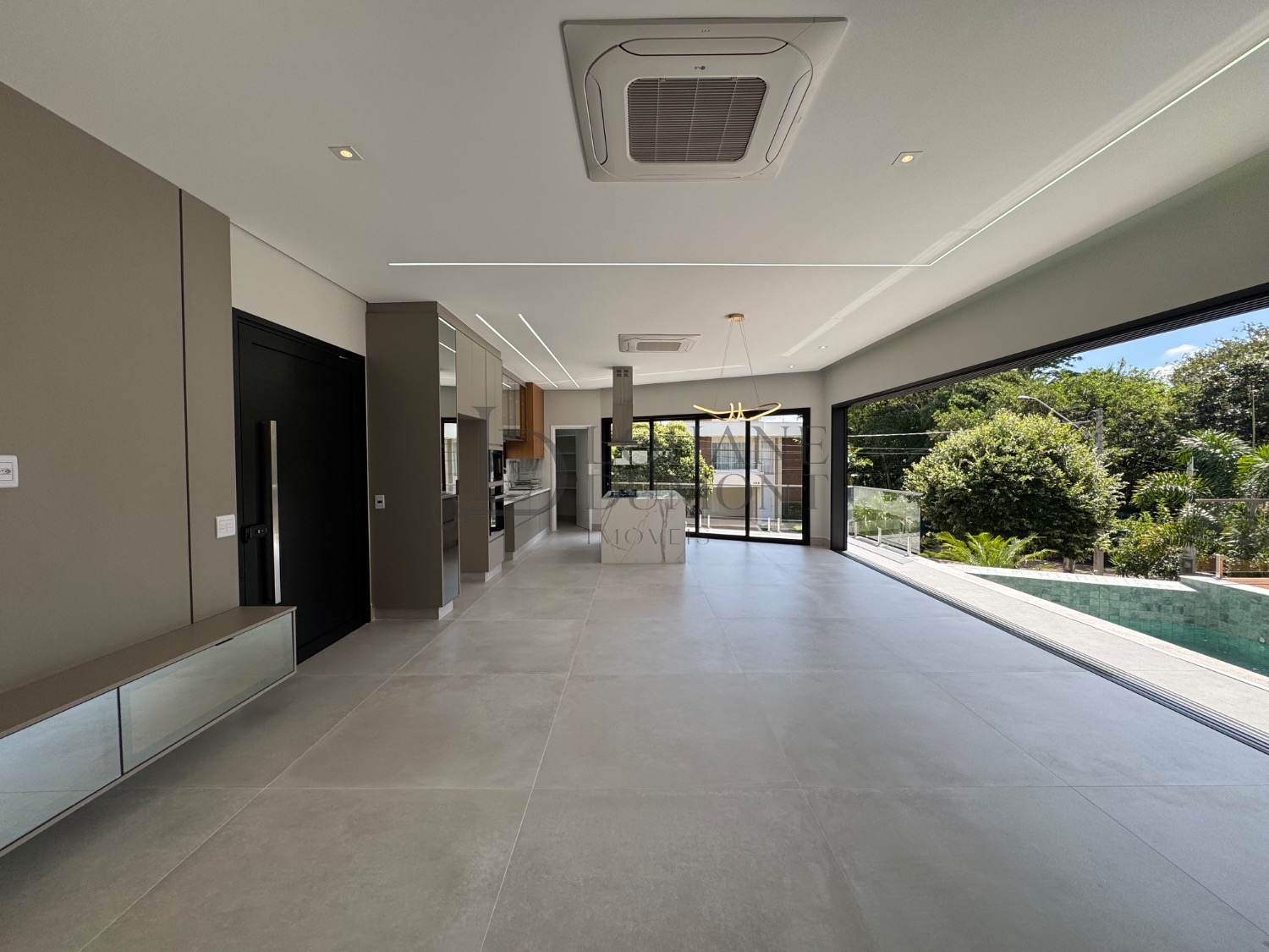 Toda a área social se estende para uma varanda ampla que acompanha a fachada da sala até a área gourmet, proporcionando vista aberta para o paisagismo e para a área de preservação. O jardim arquitetônico contorna a residência, reforçando a sensação de privacidade e conexão com a natureza.