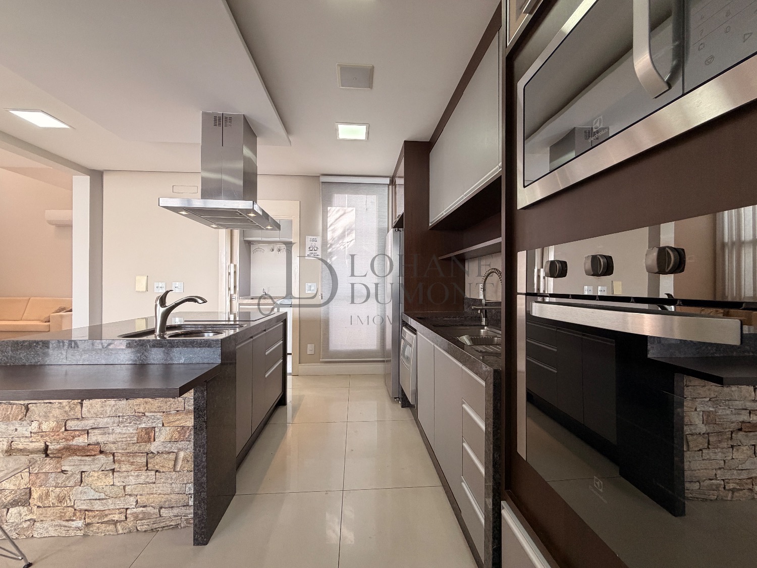 A área social conta com sala de pé-direito alto e um projeto de iluminação completo, integrado a um sistema de som ambiente JBL. Os acabamentos são de extremo bom gosto: banheiros com louças Deca linha Unic, Grohe e Axis; cozinha e área gourmet equipadas com torneiras Kraus (EUA); lavabo em mármore Travertino Romano; escada em mármore Classic Brown e demais banheiros em Crema Menorca.