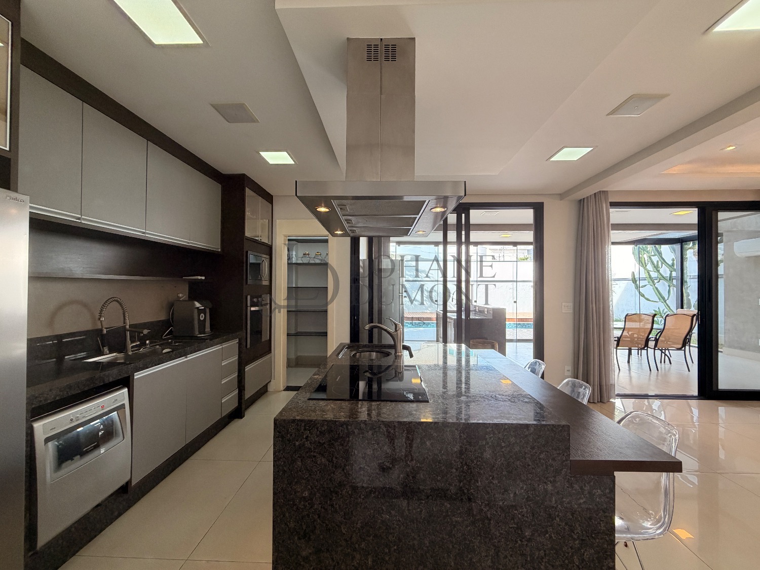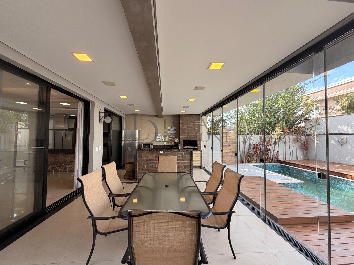 A área externa é sofisticada e funcional, com paisagismo completo e piscina com SPA e hidromassagem, além de deck deslizante sobre trilhos que permite cobrir a piscina quando desejado. A piscina está preparada para aquecimento e conta com iluminação. O imóvel também oferece sistema de aspiração central, aquecimento solar e quatro vagas de garagem, sendo duas cobertas.