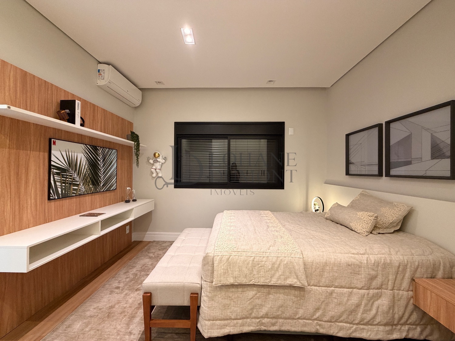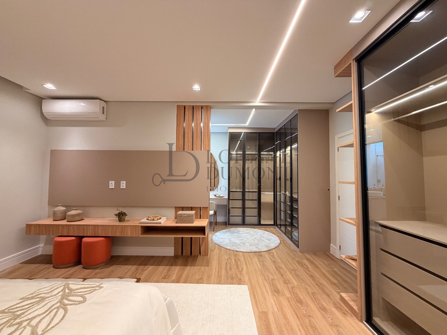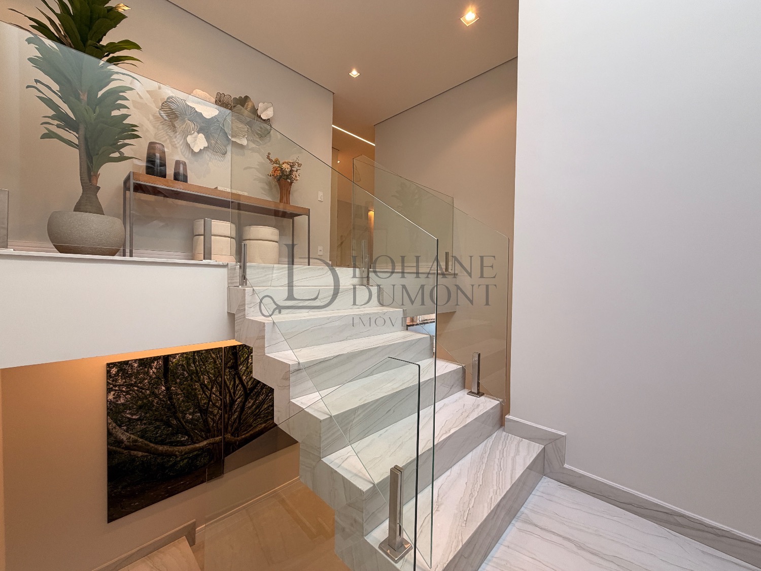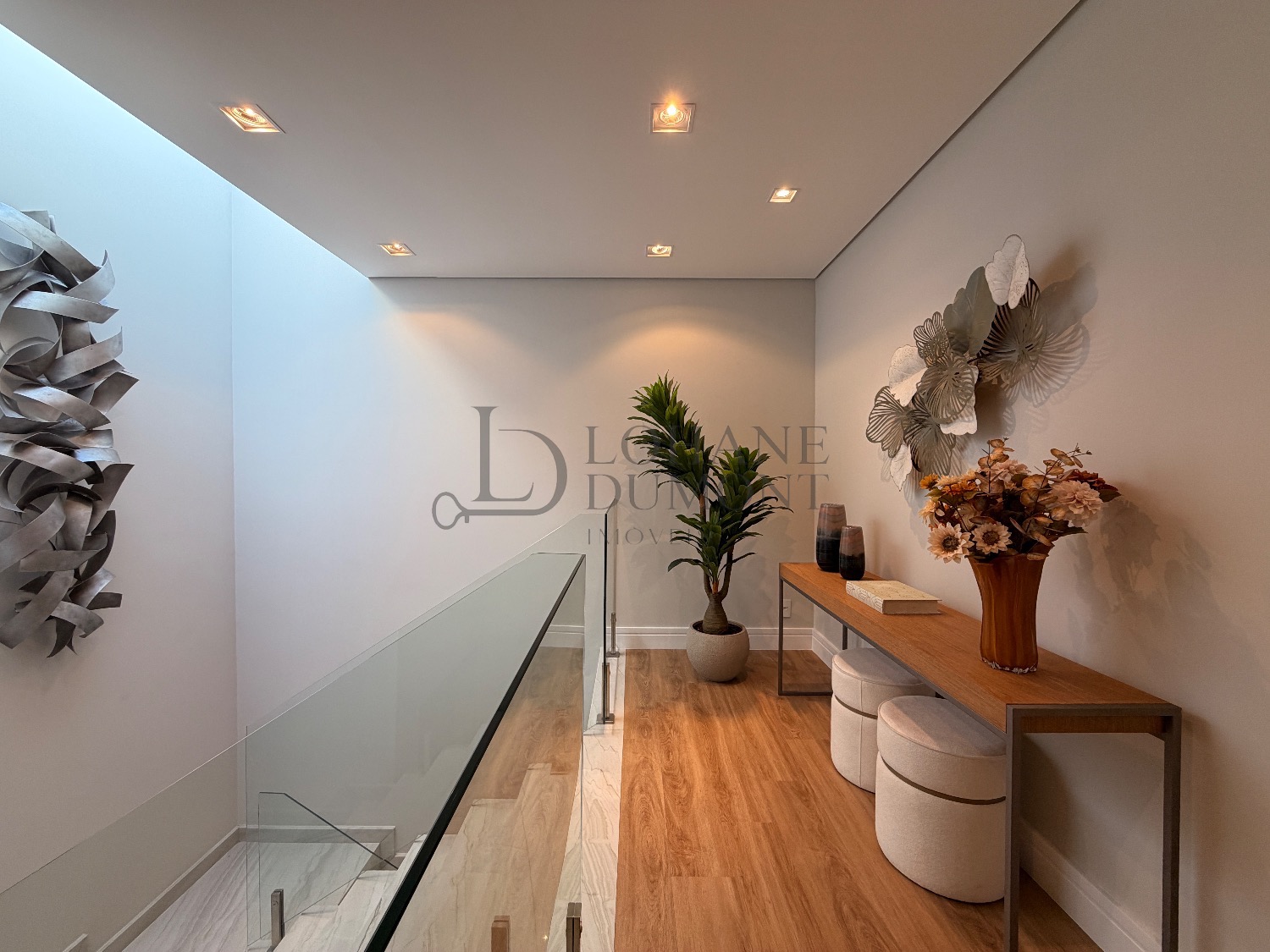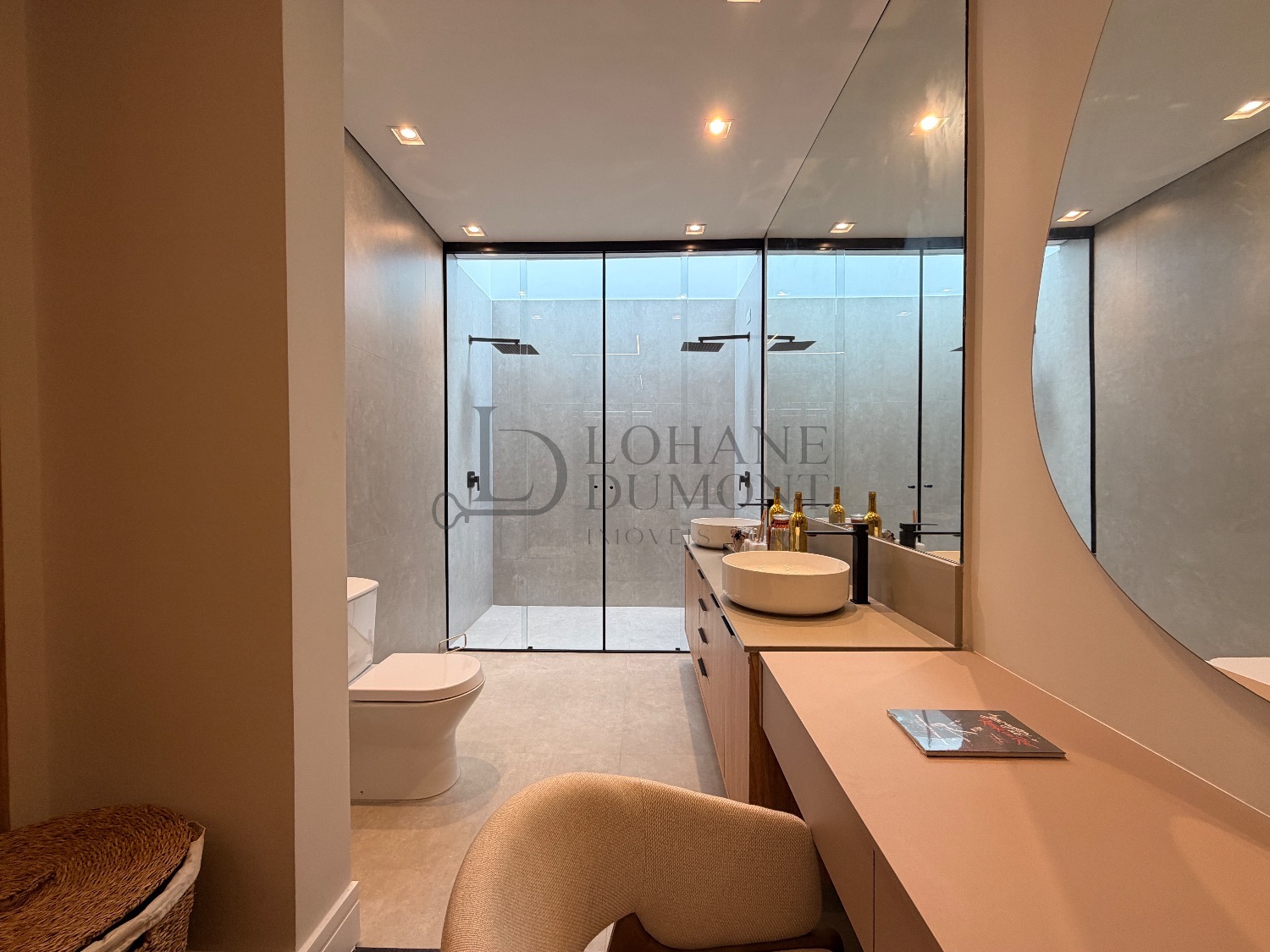 No pavimento superior, a escada é iluminada por uma claraboia que traz luz natural e aconchego aos espaços. São quatro suítes amplas, todas com armários planejados, ar-condicionado instalado e acabamentos de alto padrão. A suíte master se destaca pelo banheiro elegante, com duas duchas, bancada dupla e penteadeira já instalada. Todos os banheiros contam com excelente iluminação natural proveniente das claraboias, reforçando o conforto e a sofisticação do projeto.