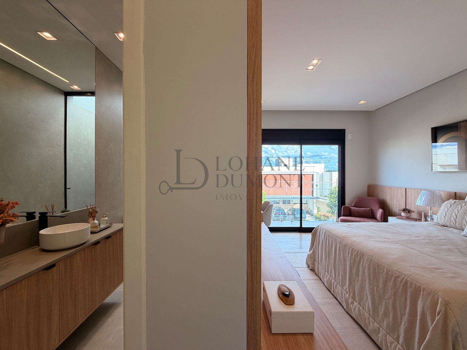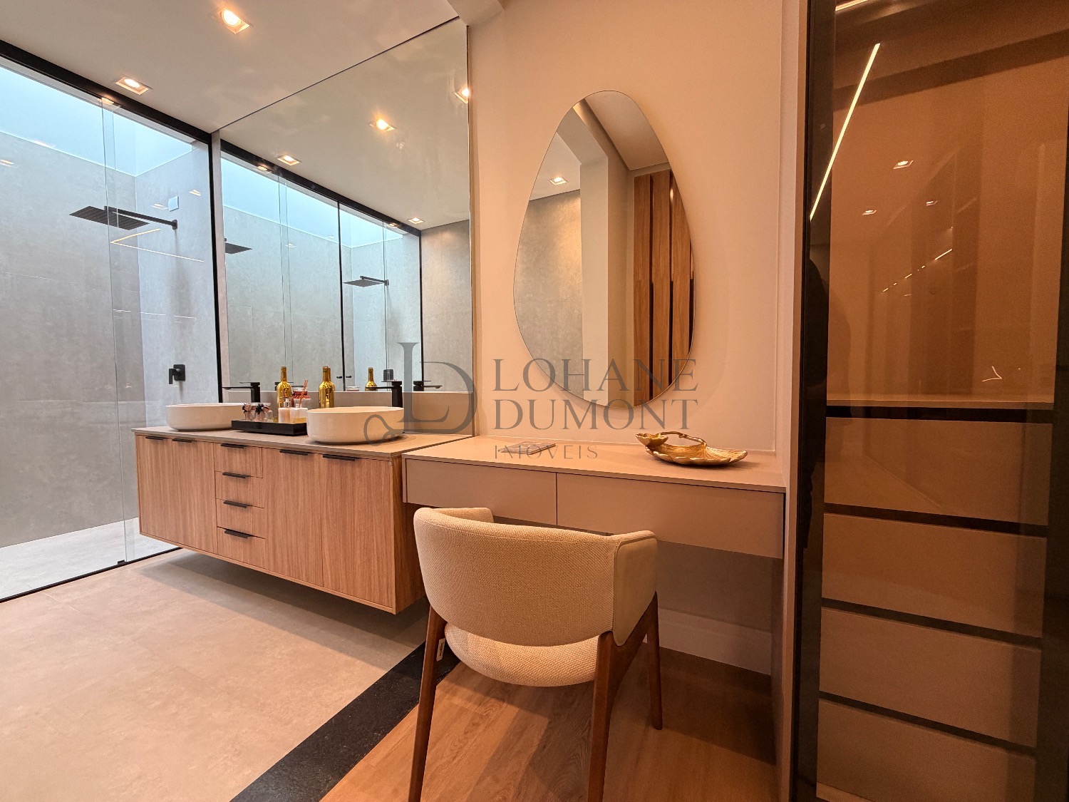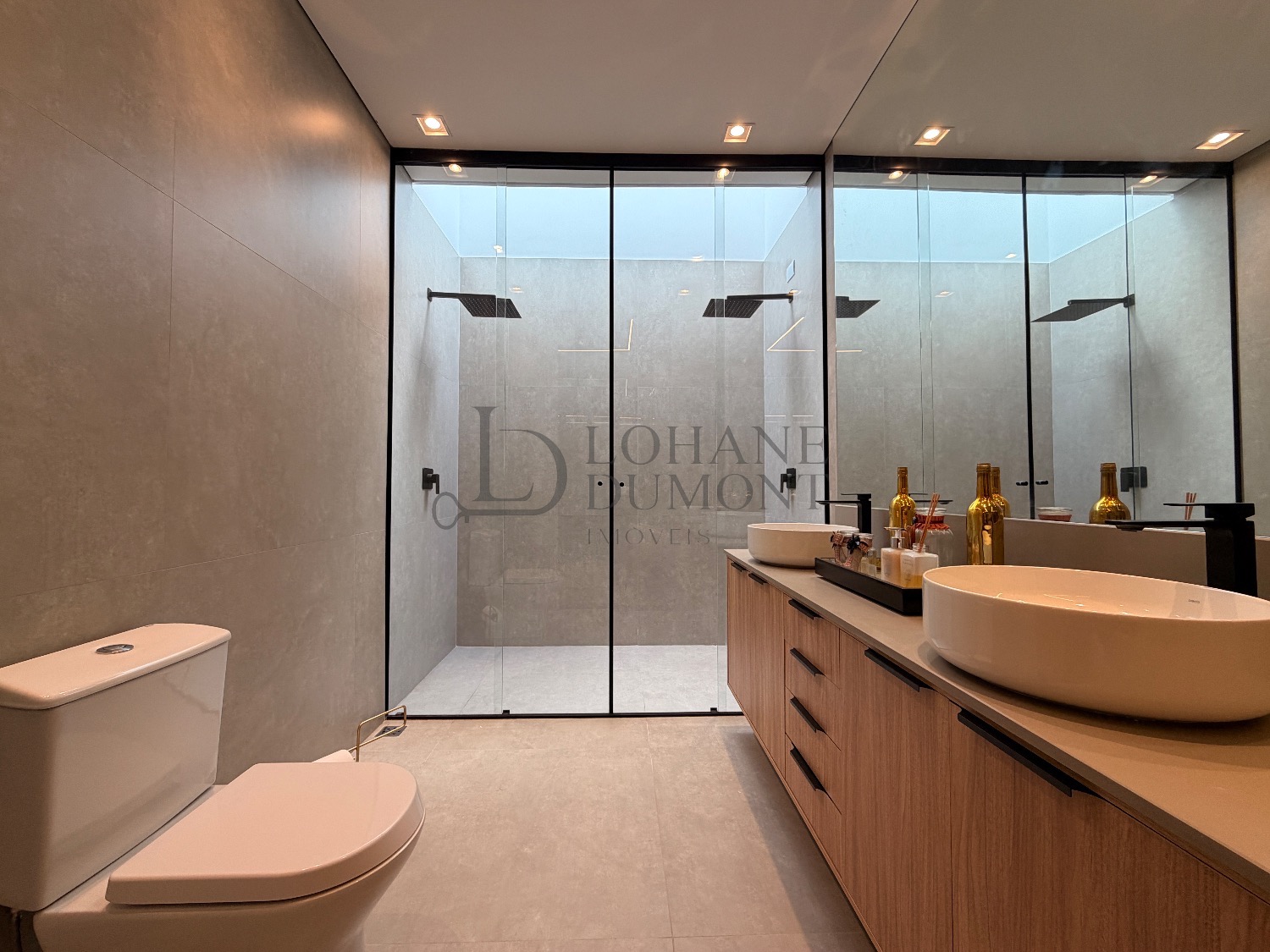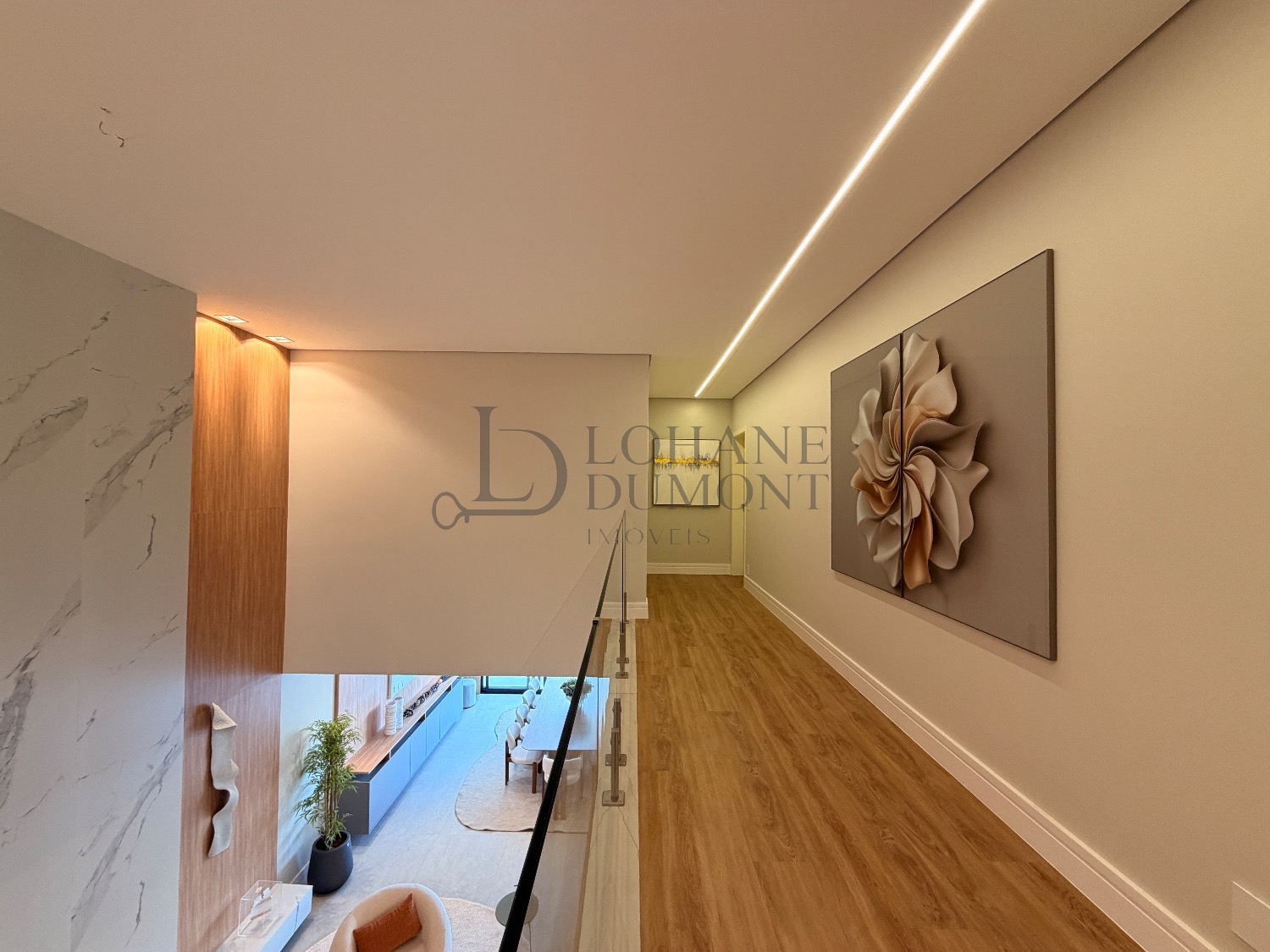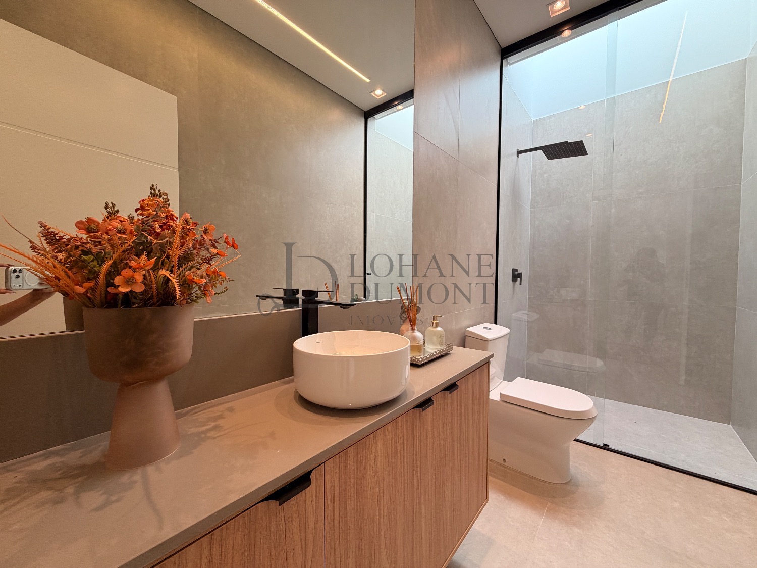 No pavimento superior, a escada é iluminada por uma claraboia que traz luz natural e aconchego aos espaços. São quatro suítes amplas, todas com armários planejados, ar-condicionado instalado e acabamentos de alto padrão. A suíte master se destaca pelo banheiro elegante, com duas duchas, bancada dupla e penteadeira já instalada. Todos os banheiros contam com excelente iluminação natural proveniente das claraboias, reforçando o conforto e a sofisticação do projeto.
