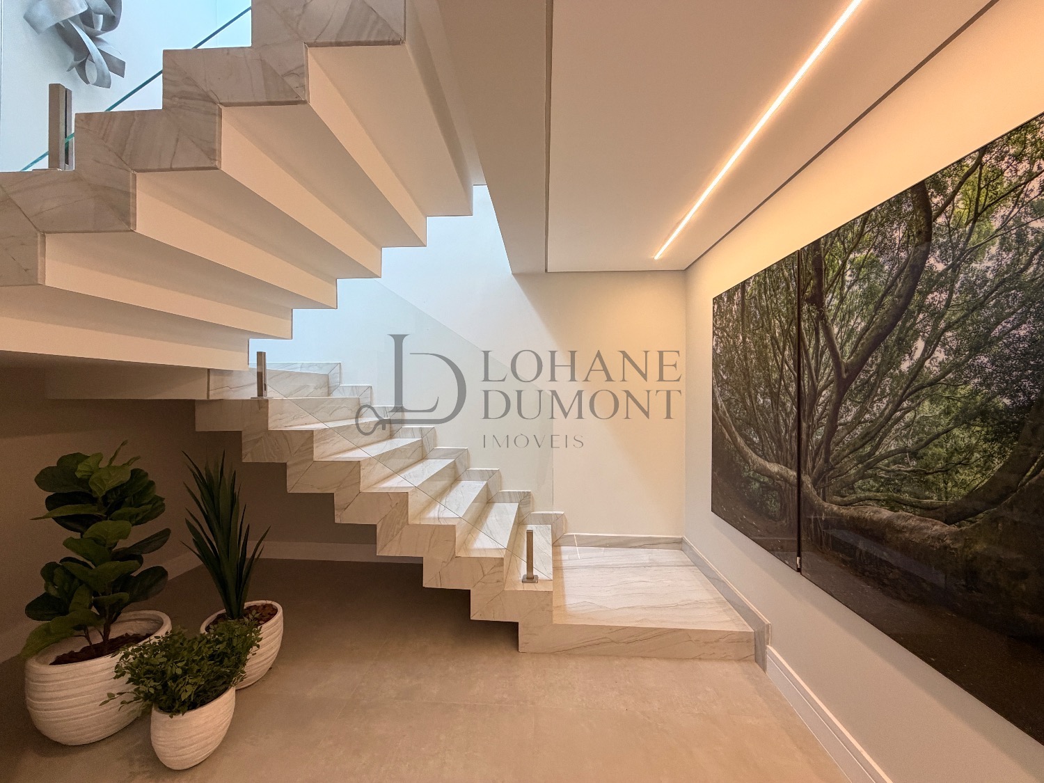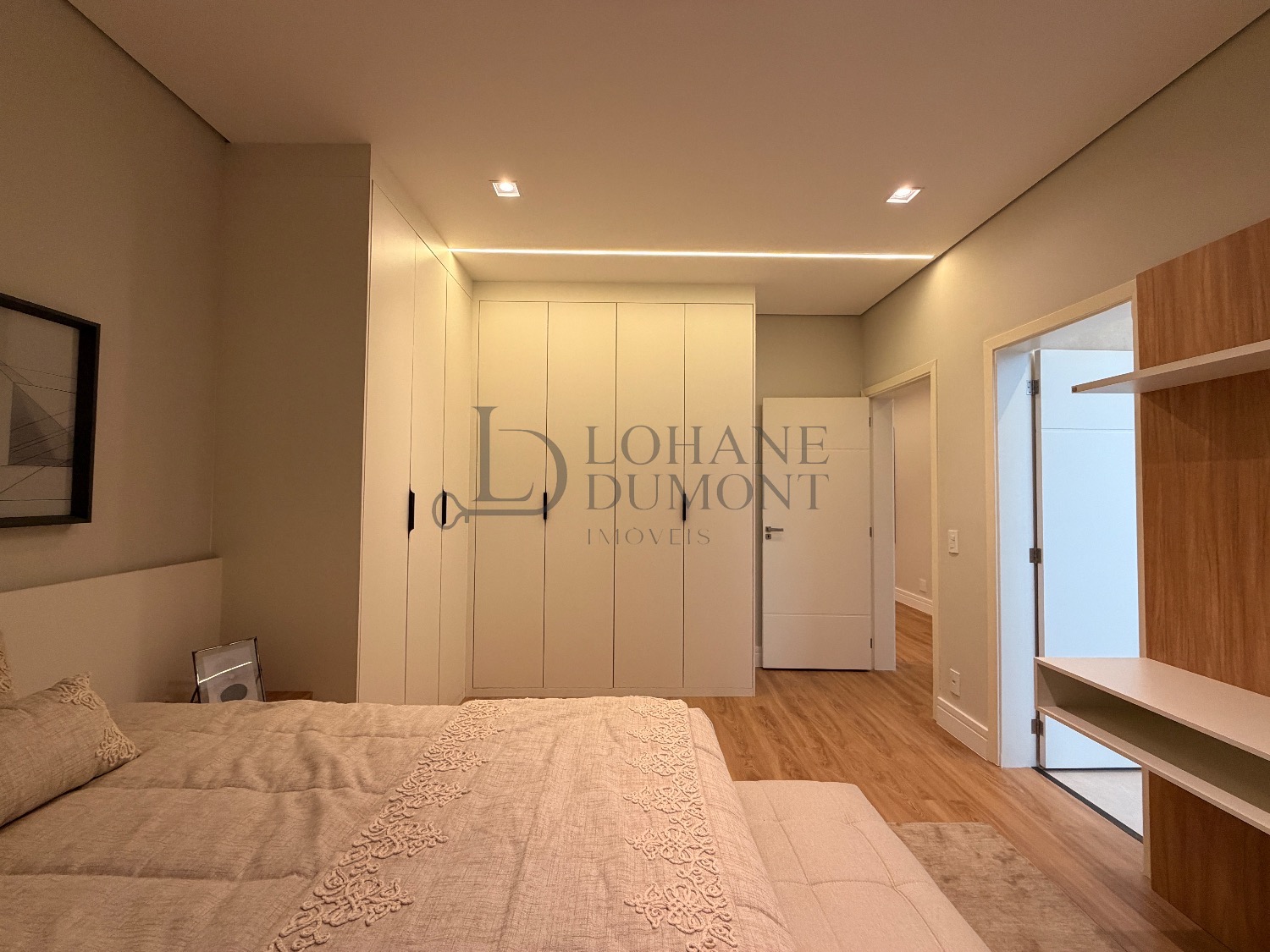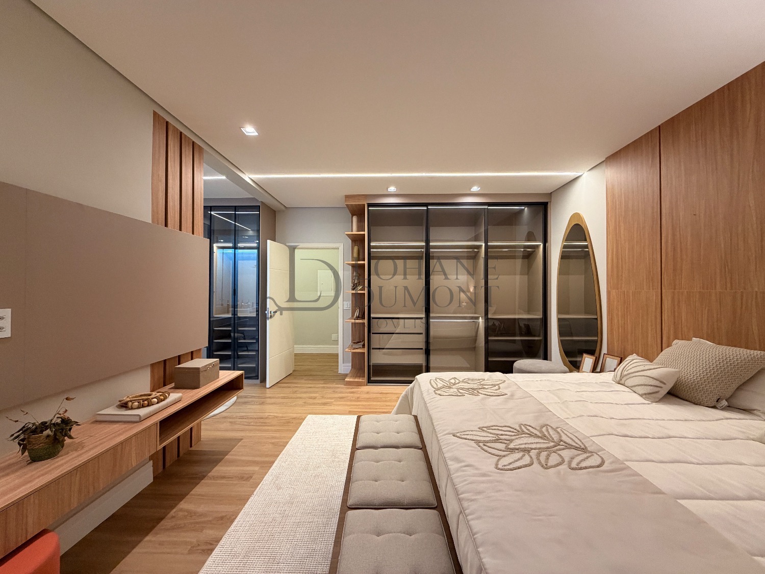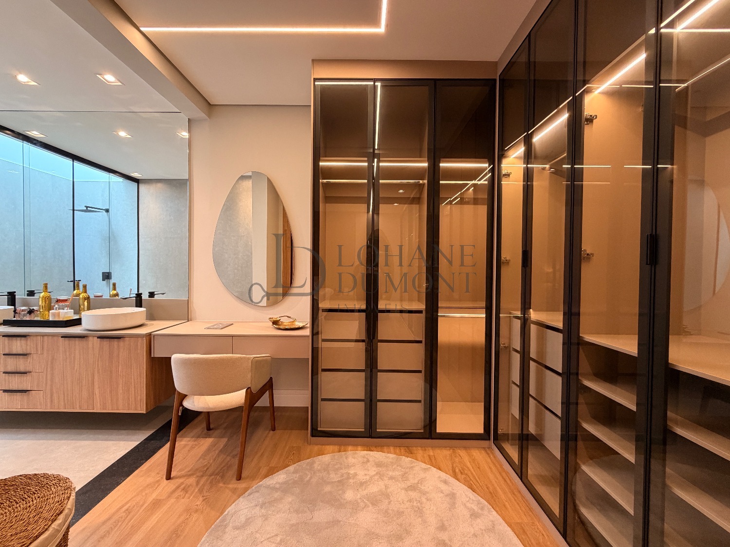 No pavimento superior, a escada é iluminada por uma claraboia que traz luz natural e aconchego aos espaços. São quatro suítes amplas, todas com armários planejados, ar-condicionado instalado e acabamentos de alto padrão. A suíte master se destaca pelo banheiro elegante, com duas duchas, bancada dupla e penteadeira já instalada. Todos os banheiros contam com excelente iluminação natural proveniente das claraboias, reforçando o conforto e a sofisticação do projeto.