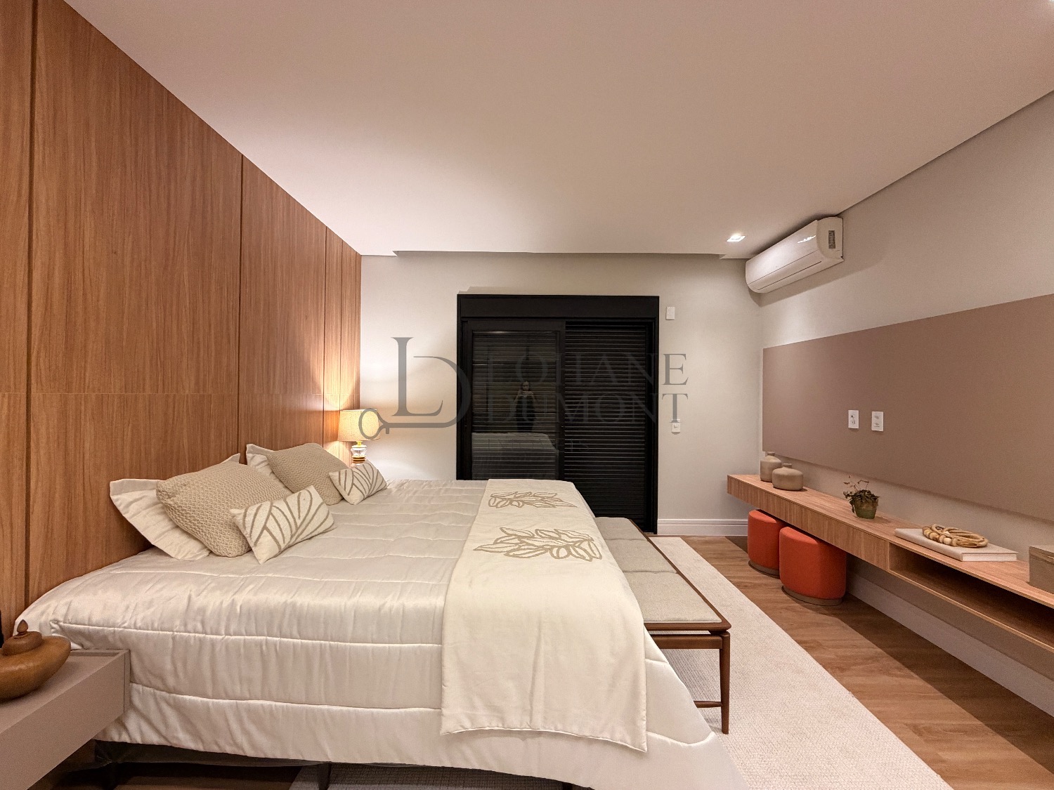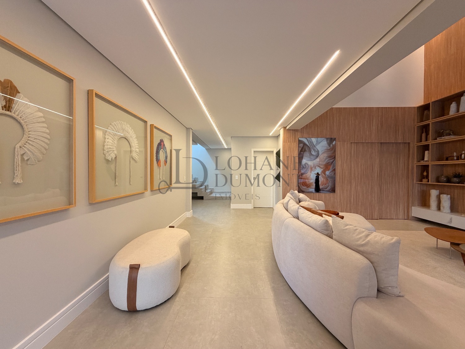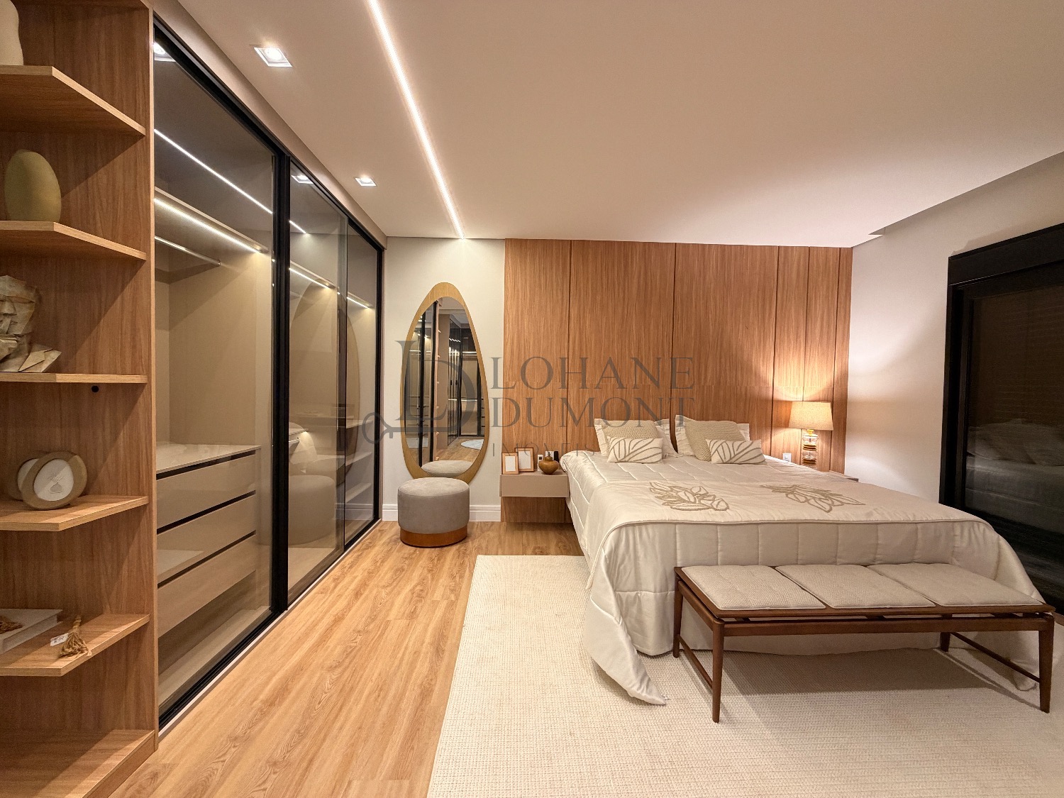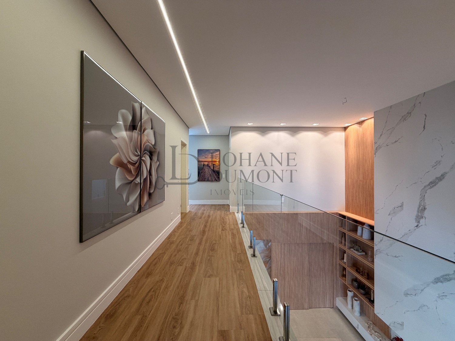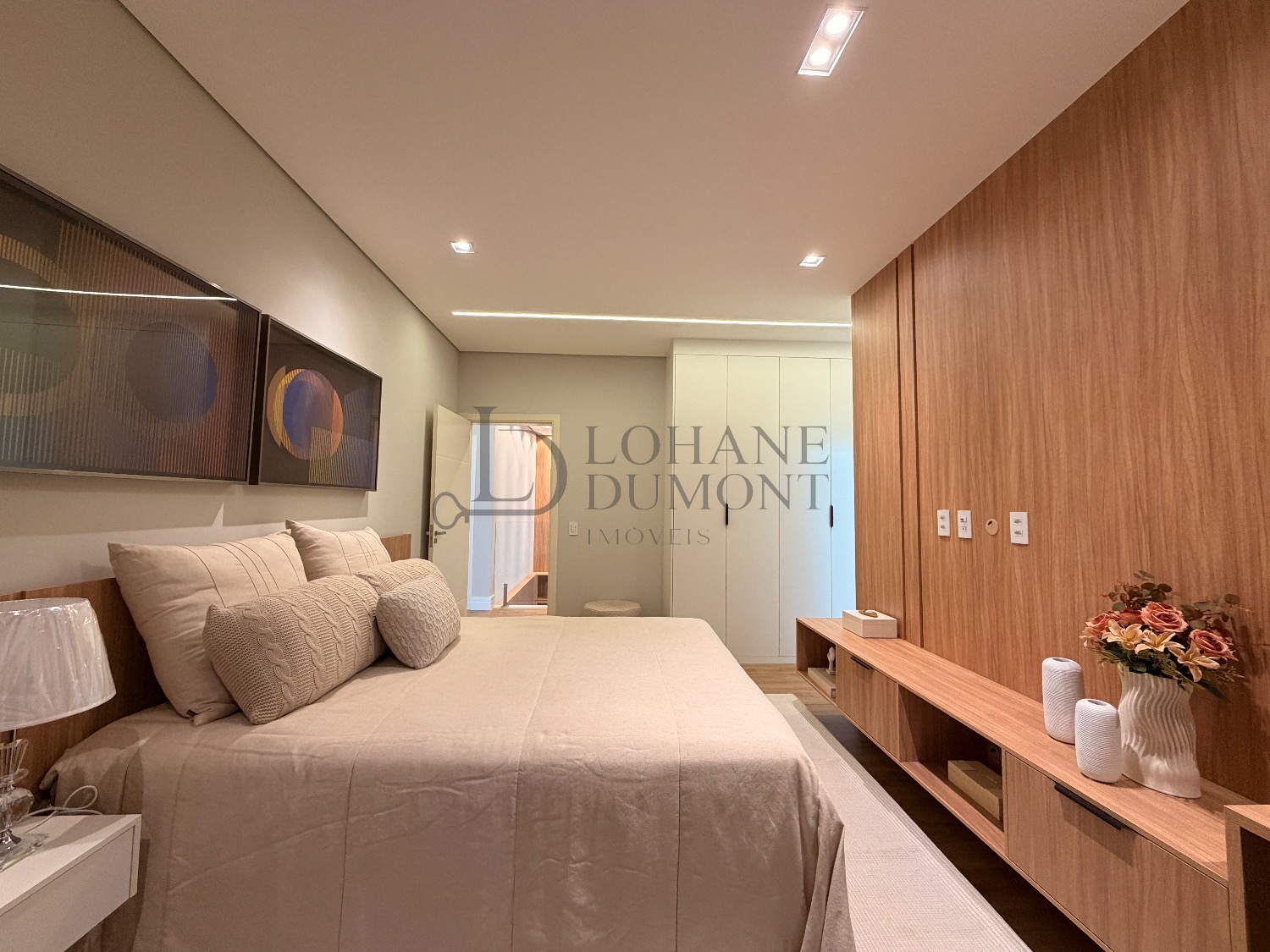 No pavimento superior, a escada é iluminada por uma claraboia que traz luz natural e aconchego aos espaços. São quatro suítes amplas, todas com armários planejados, ar-condicionado instalado e acabamentos de alto padrão. A suíte master se destaca pelo banheiro elegante, com duas duchas, bancada dupla e penteadeira já instalada. Todos os banheiros contam com excelente iluminação natural proveniente das claraboias, reforçando o conforto e a sofisticação do projeto.