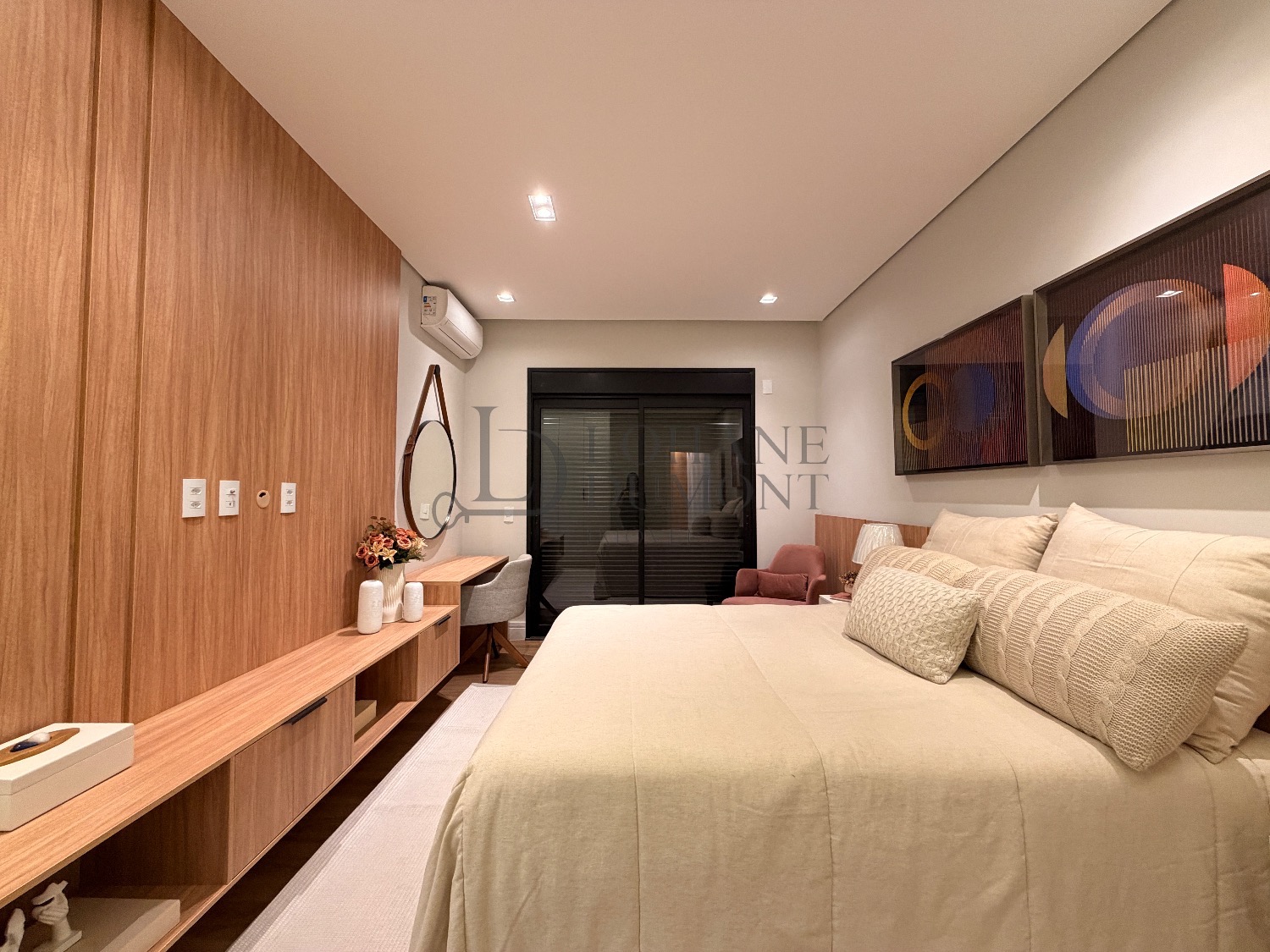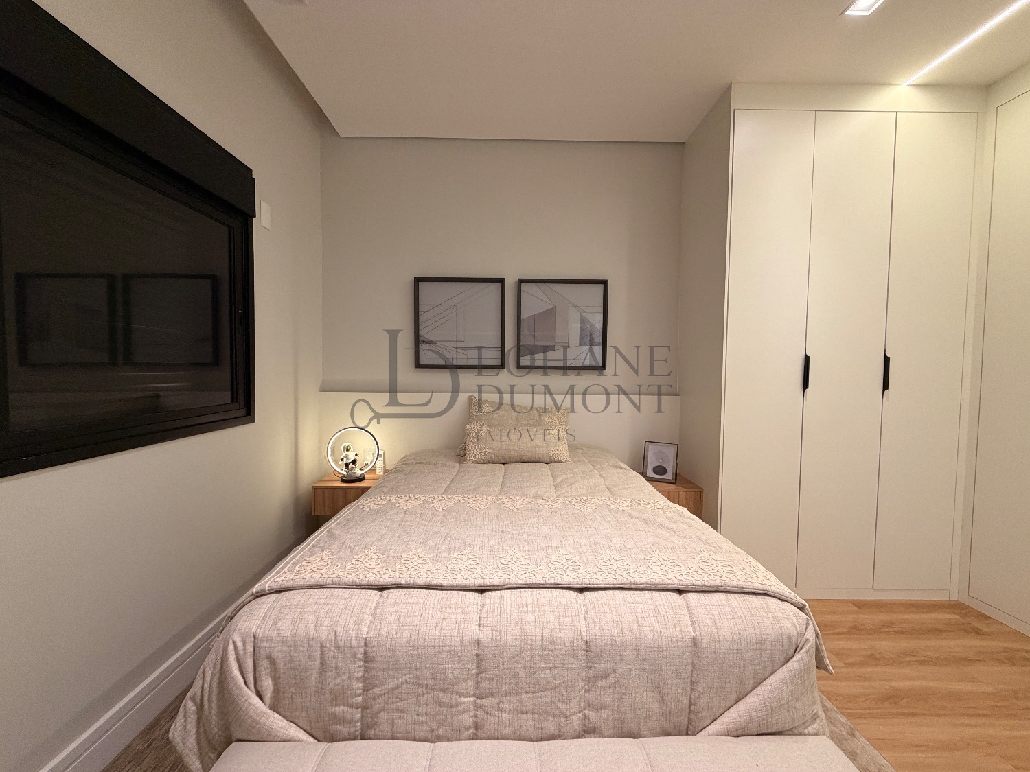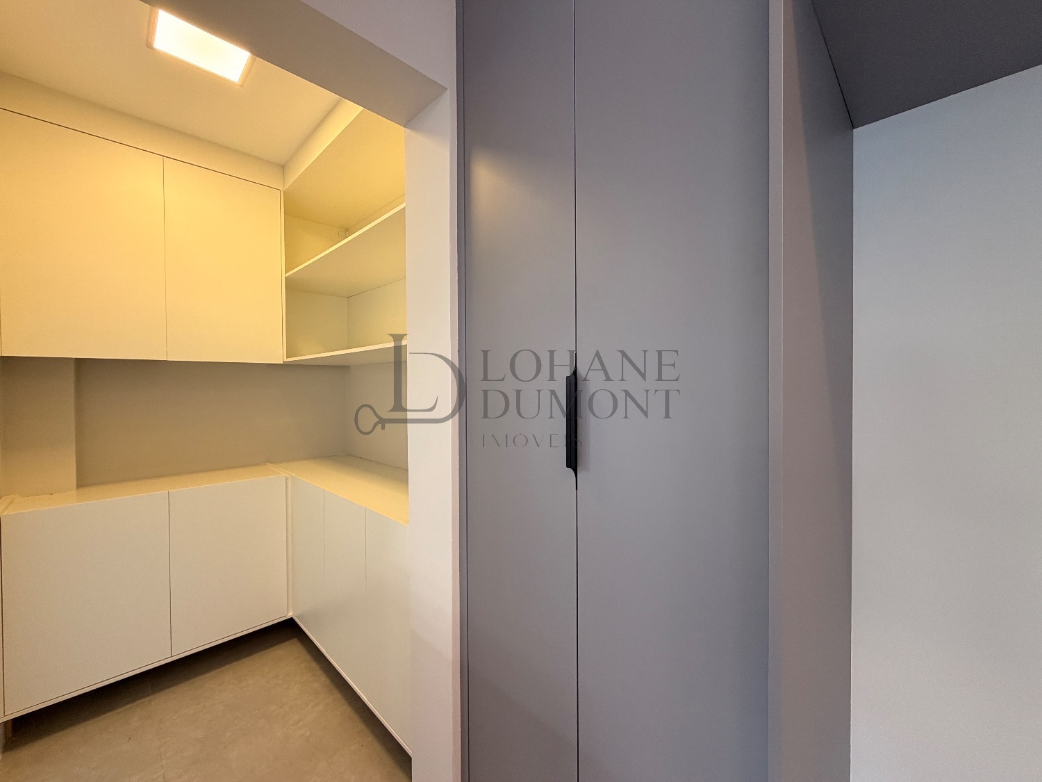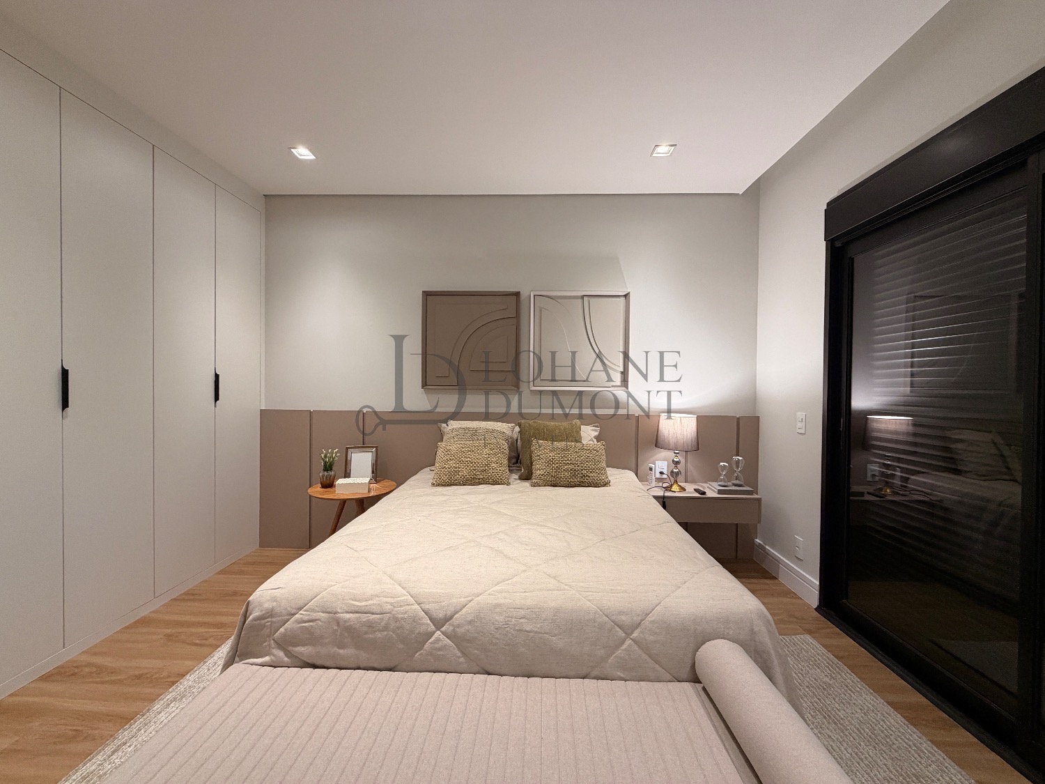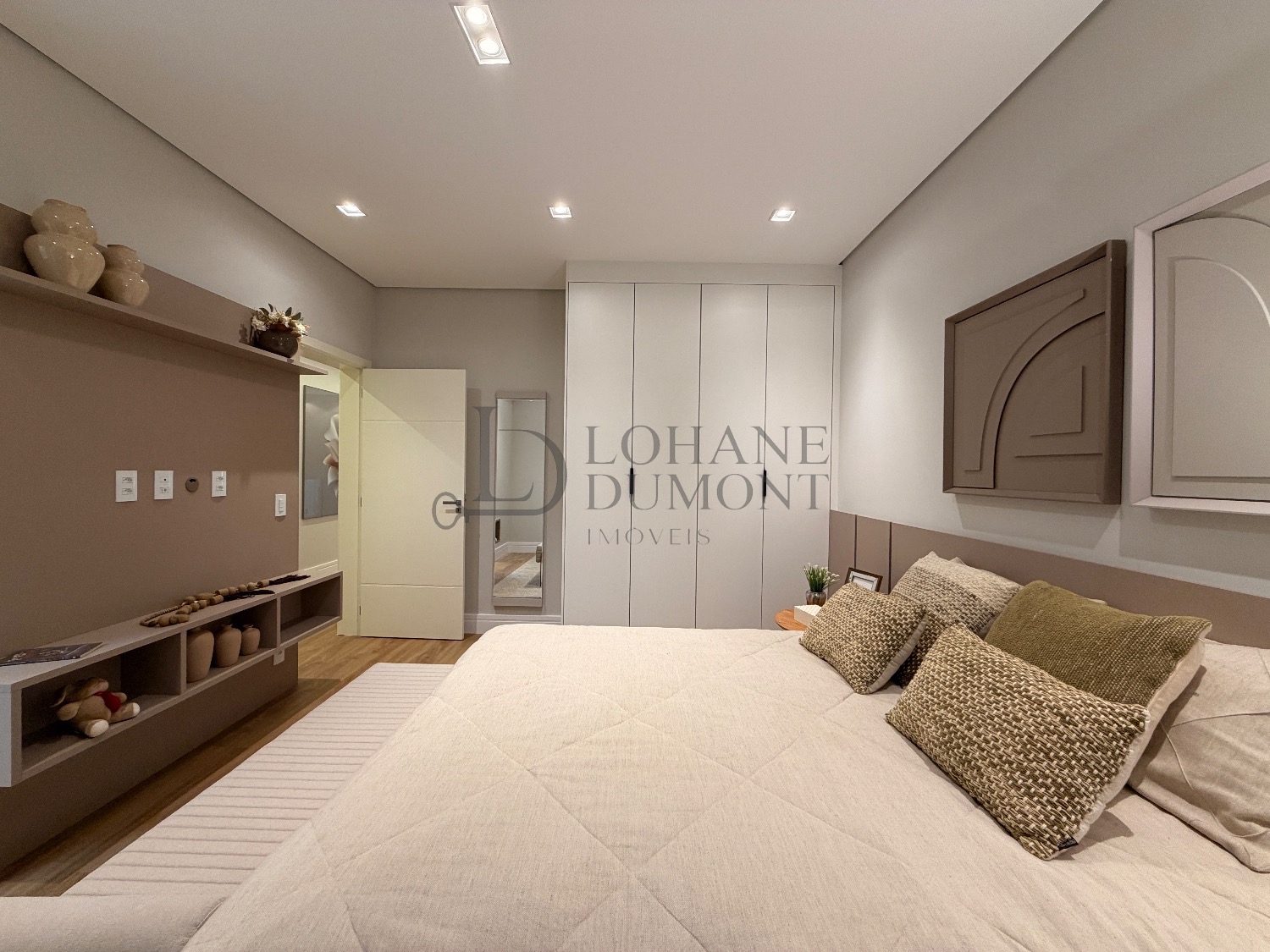 No pavimento superior, a escada é iluminada por uma claraboia que traz luz natural e aconchego aos espaços. São quatro suítes amplas, todas com armários planejados, ar-condicionado instalado e acabamentos de alto padrão. A suíte master se destaca pelo banheiro elegante, com duas duchas, bancada dupla e penteadeira já instalada. Todos os banheiros contam com excelente iluminação natural proveniente das claraboias, reforçando o conforto e a sofisticação do projeto.
