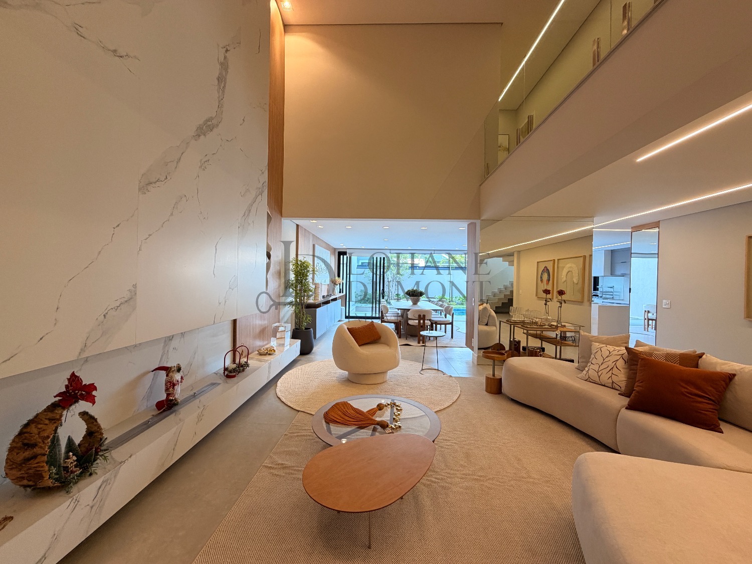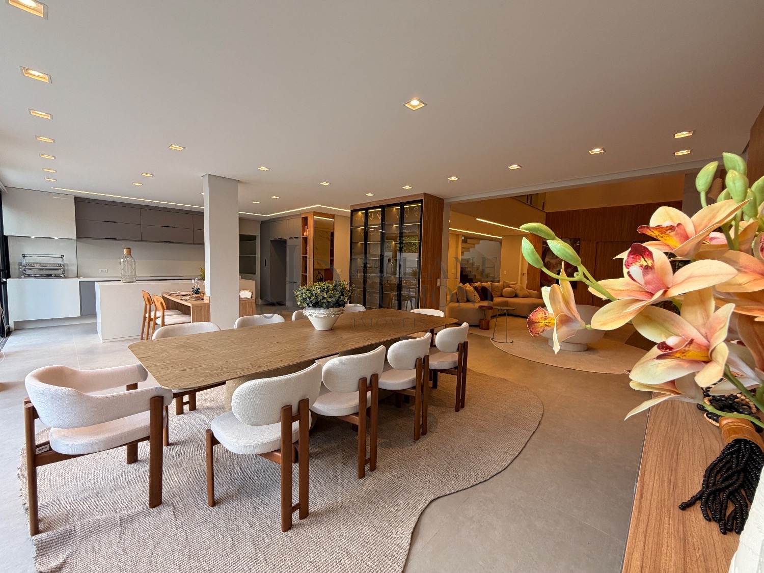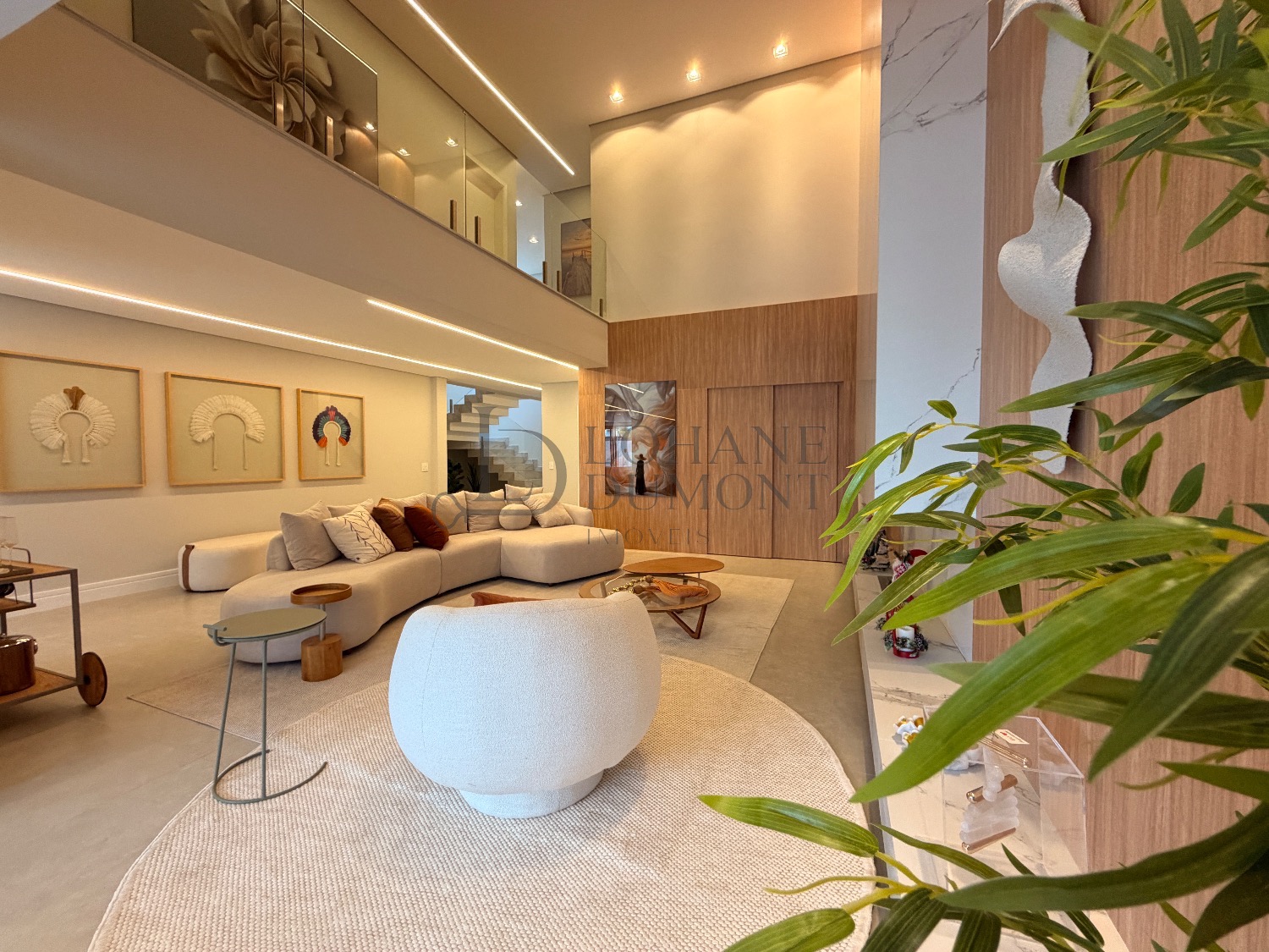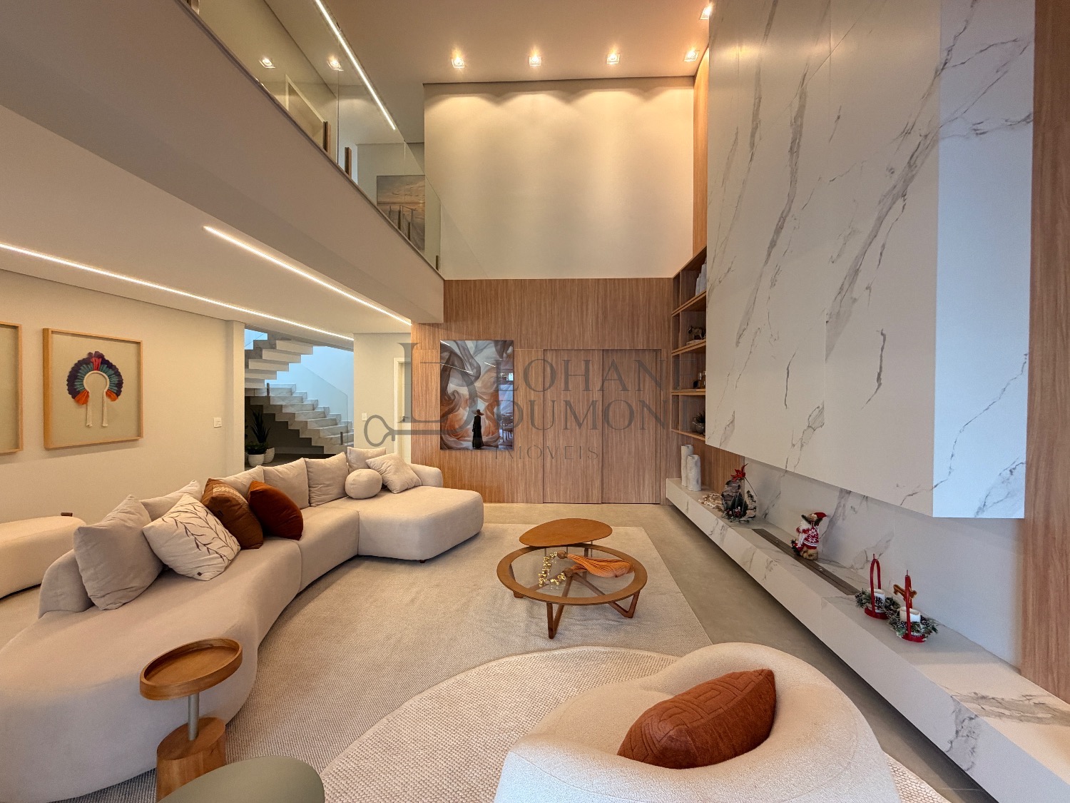 Logo na entrada, o pé-direito duplo imponente cria uma sensação imediata de elegância e amplitude. Os ambientes do térreo foram cuidadosamente integrados, unindo sala de estar, cozinha e espaço gourmet em uma proposta fluida e funcional, ideal para receber. O ambiente é valorizado por uma lareira ecológica em uma parede de aproximadamente 6 metros, que se torna um verdadeiro destaque arquitetônico, além de um cinema privativo já climatizado, perfeito para momentos de lazer e entretenimento.