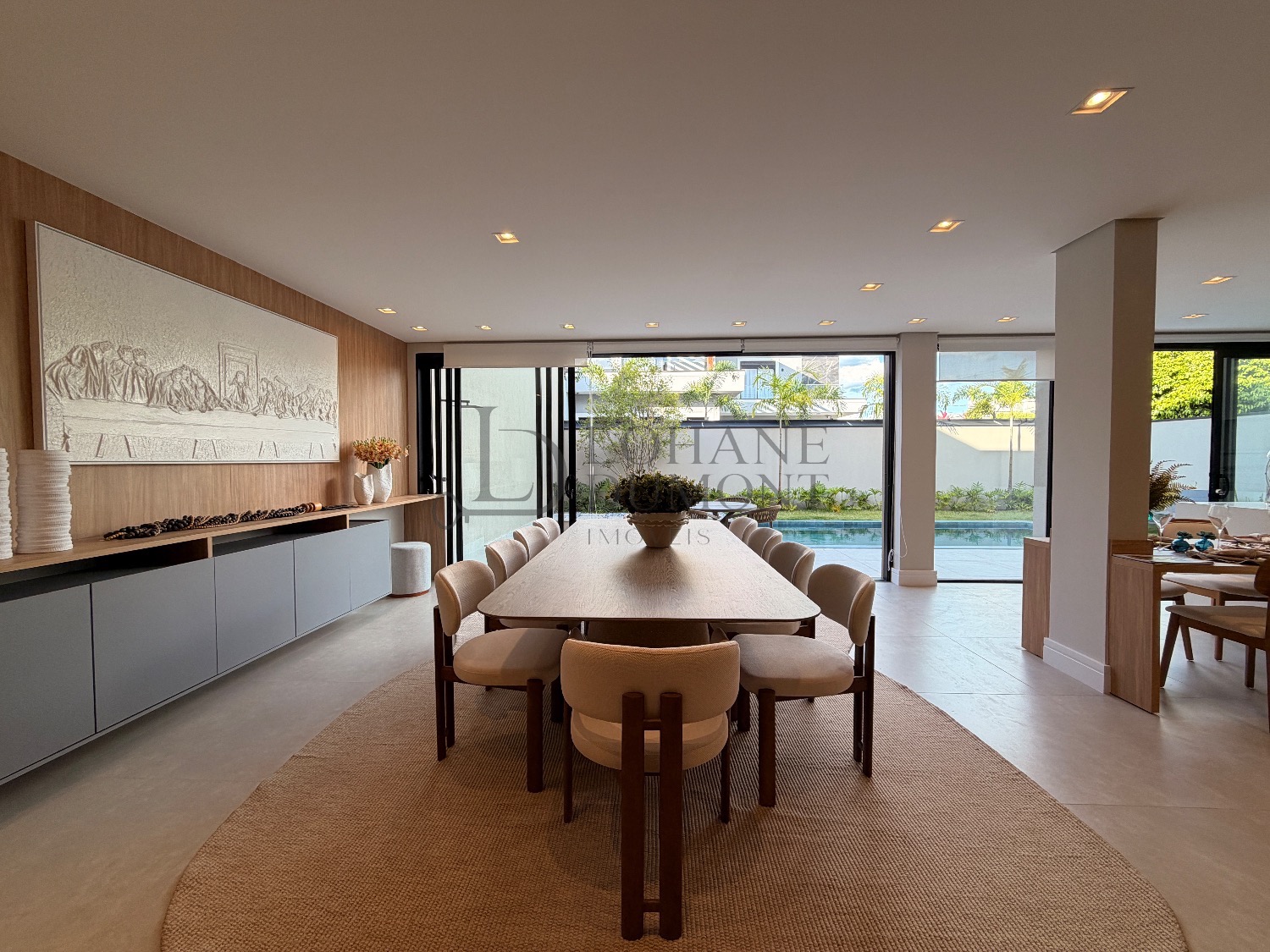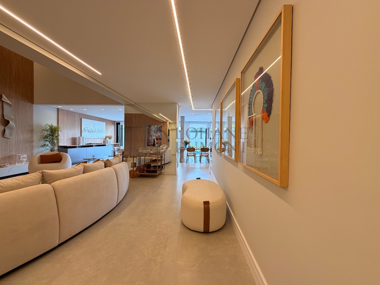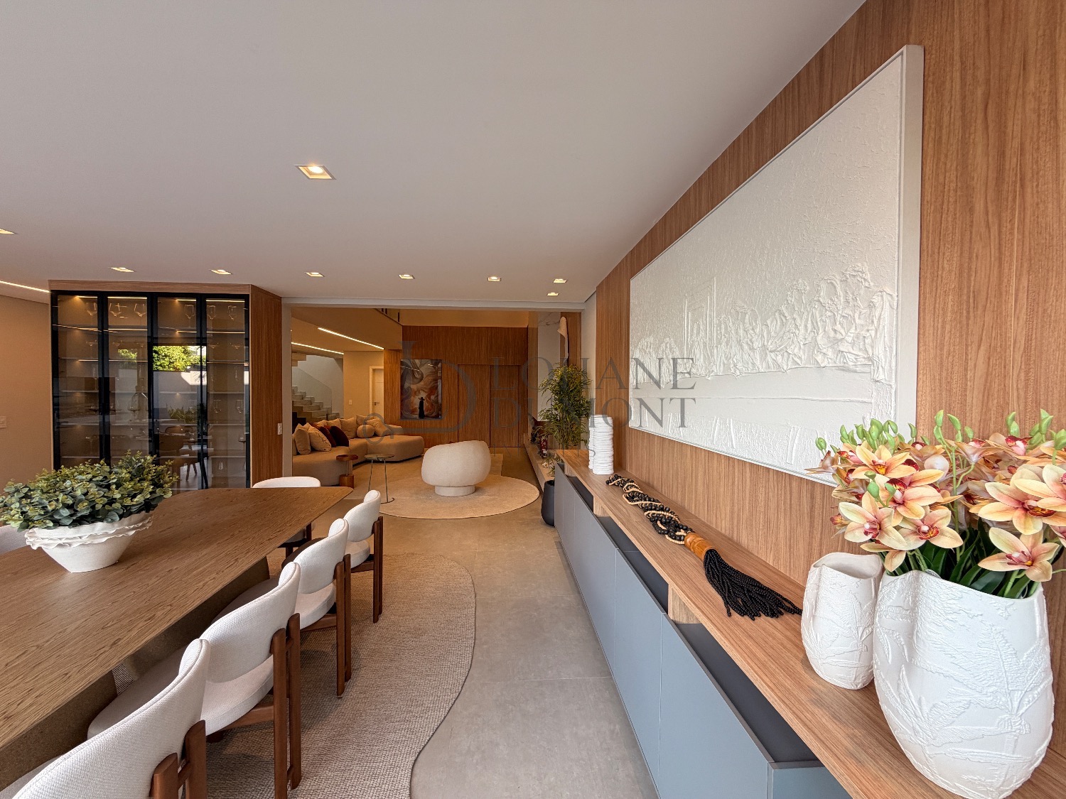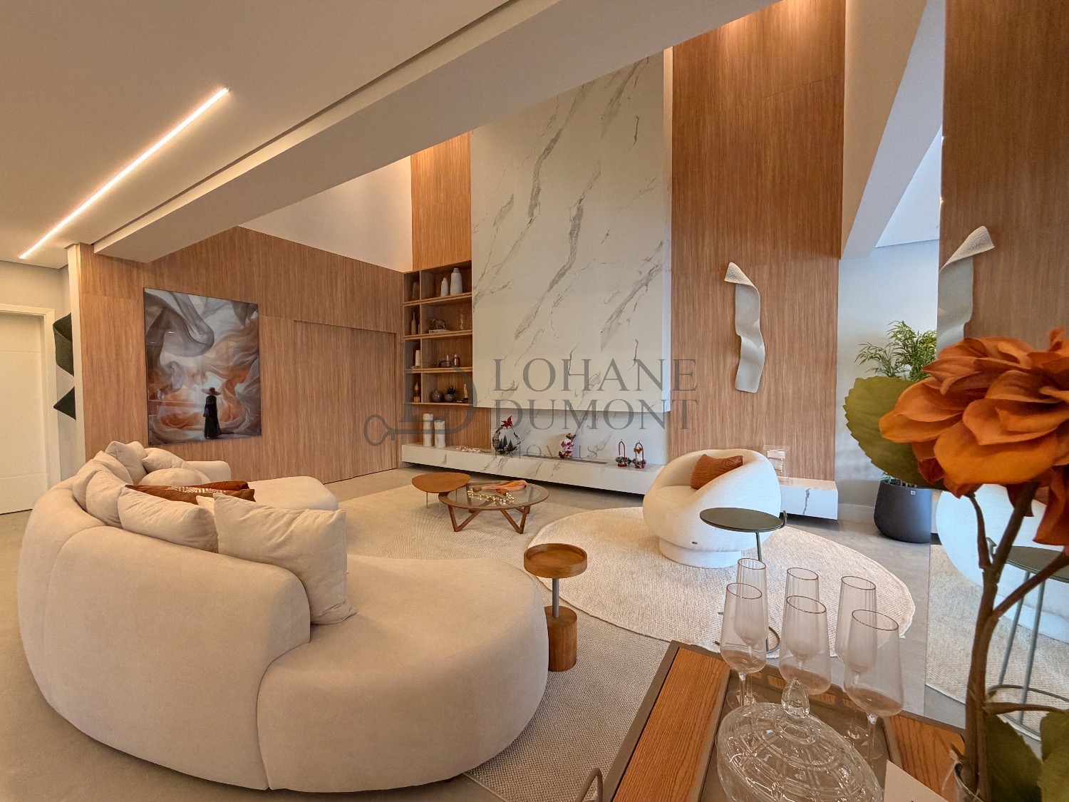 Logo na entrada, o pé-direito duplo imponente cria uma sensação imediata de elegância e amplitude. Os ambientes do térreo foram cuidadosamente integrados, unindo sala de estar, cozinha e espaço gourmet em uma proposta fluida e funcional, ideal para receber. O ambiente é valorizado por uma lareira ecológica em uma parede de aproximadamente 6 metros, que se torna um verdadeiro destaque arquitetônico, além de um cinema privativo já climatizado, perfeito para momentos de lazer e entretenimento.