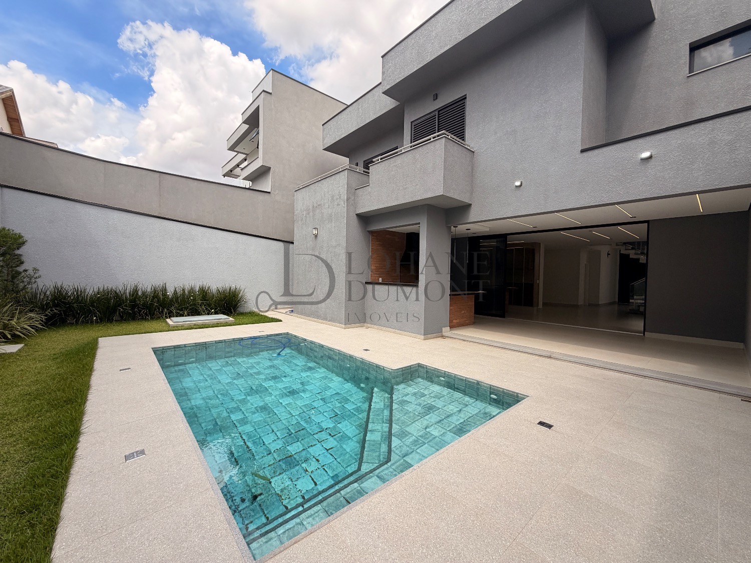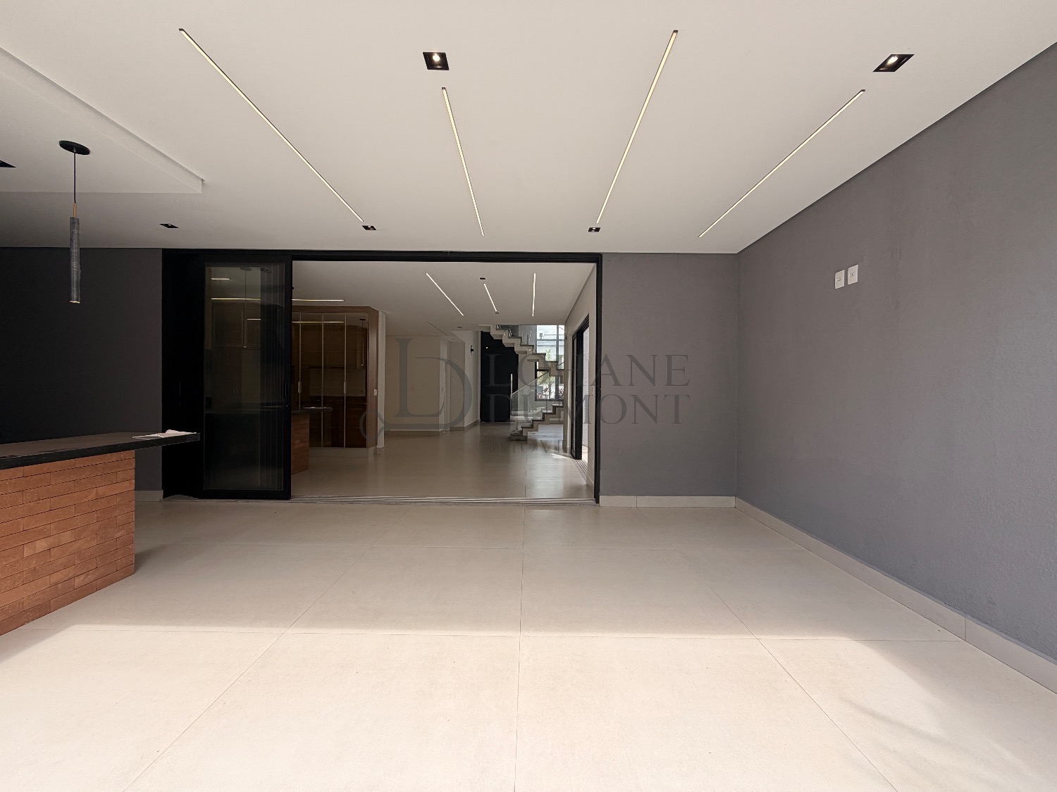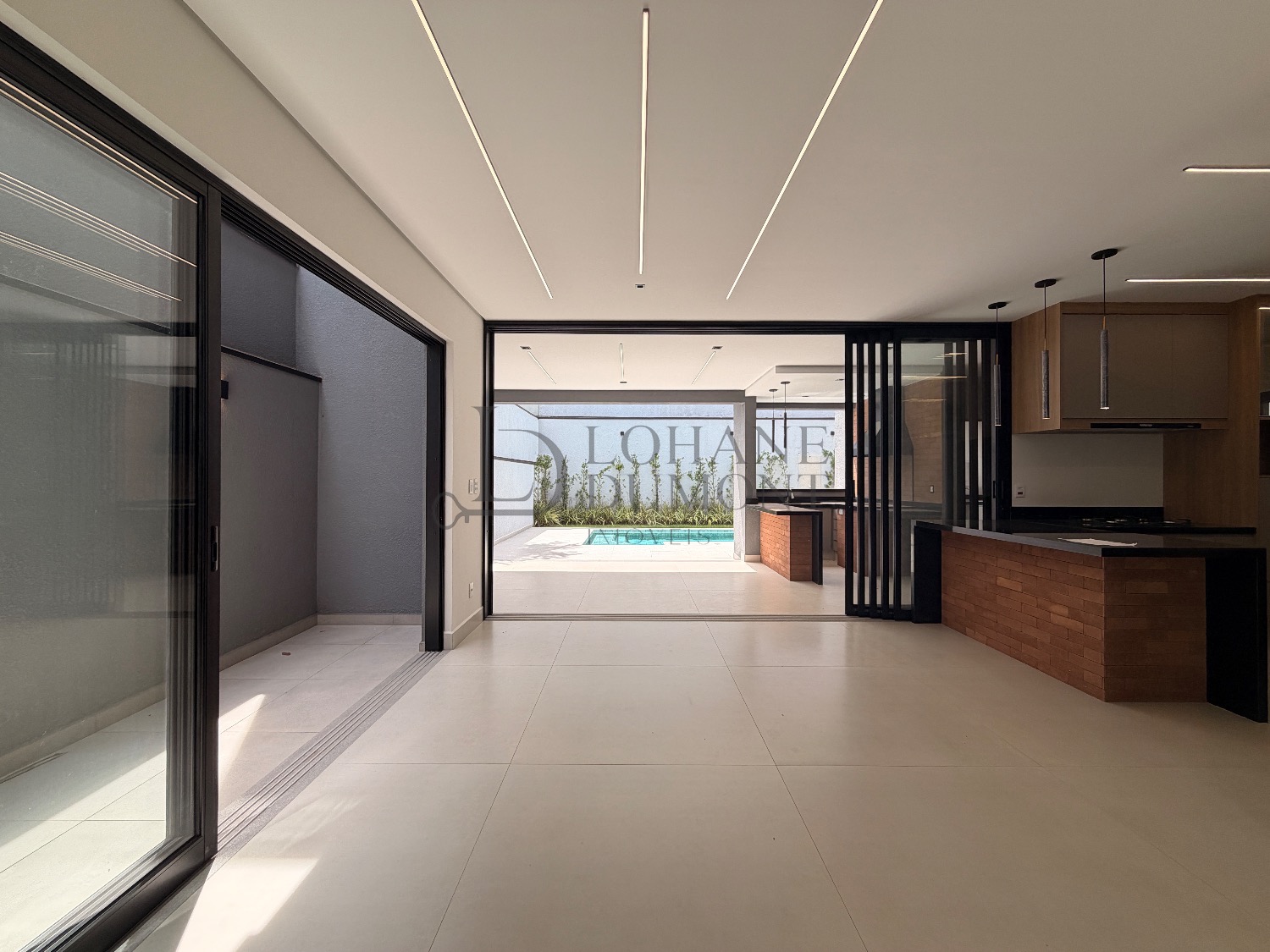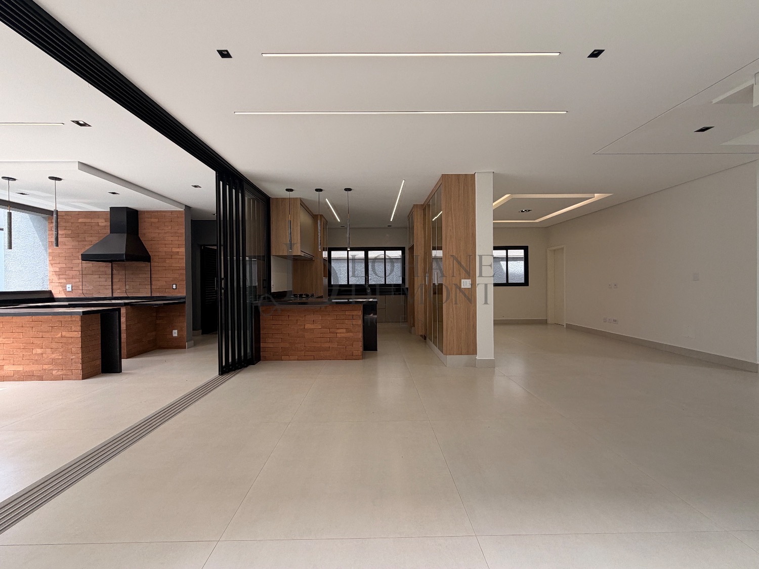 No pavimento térreo, o living para dois ambientes com pé-direito duplo se destaca pela amplitude, luminosidade e integração dos espaços. A casa conta ainda com escritório, cozinha completa, lavabo, área de serviço e despensa, garantindo praticidade e organização no dia a dia. Ainda no térreo, a área gourmet com churrasqueira é perfeita para receber, integrada à piscina, ao quintal e ao banheiro de apoio, criando um ambiente ideal para momentos de lazer e convivência. O imóvel dispõe de quatro vagas de garagem.