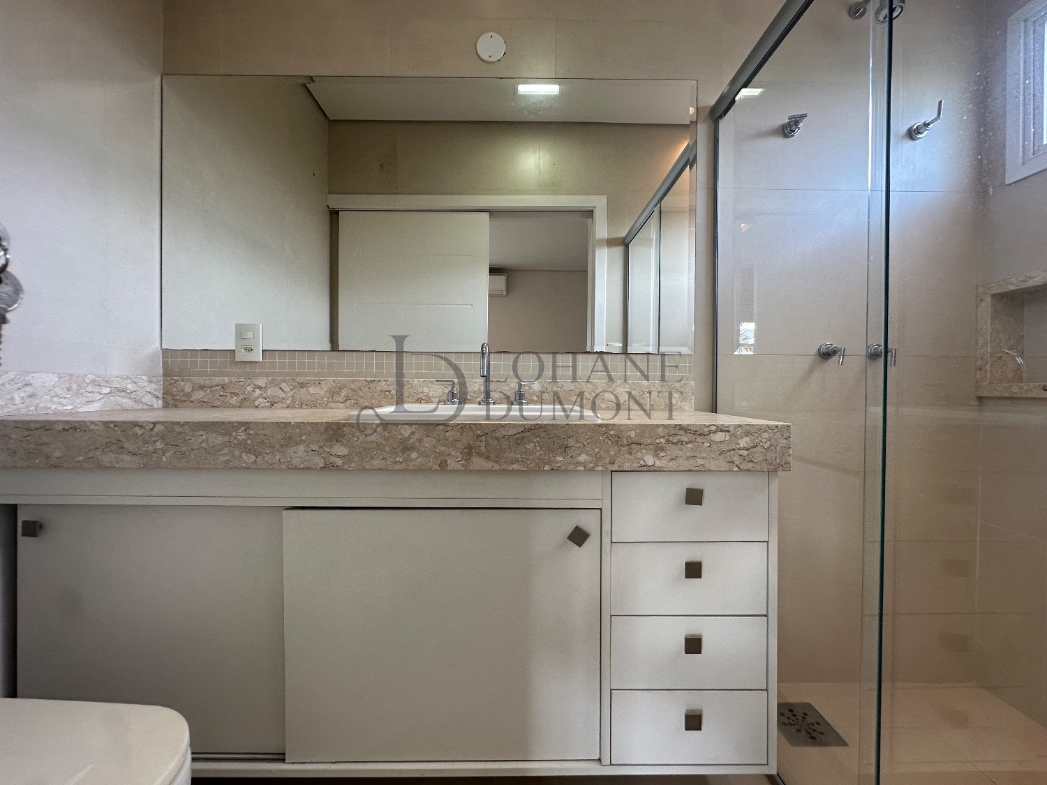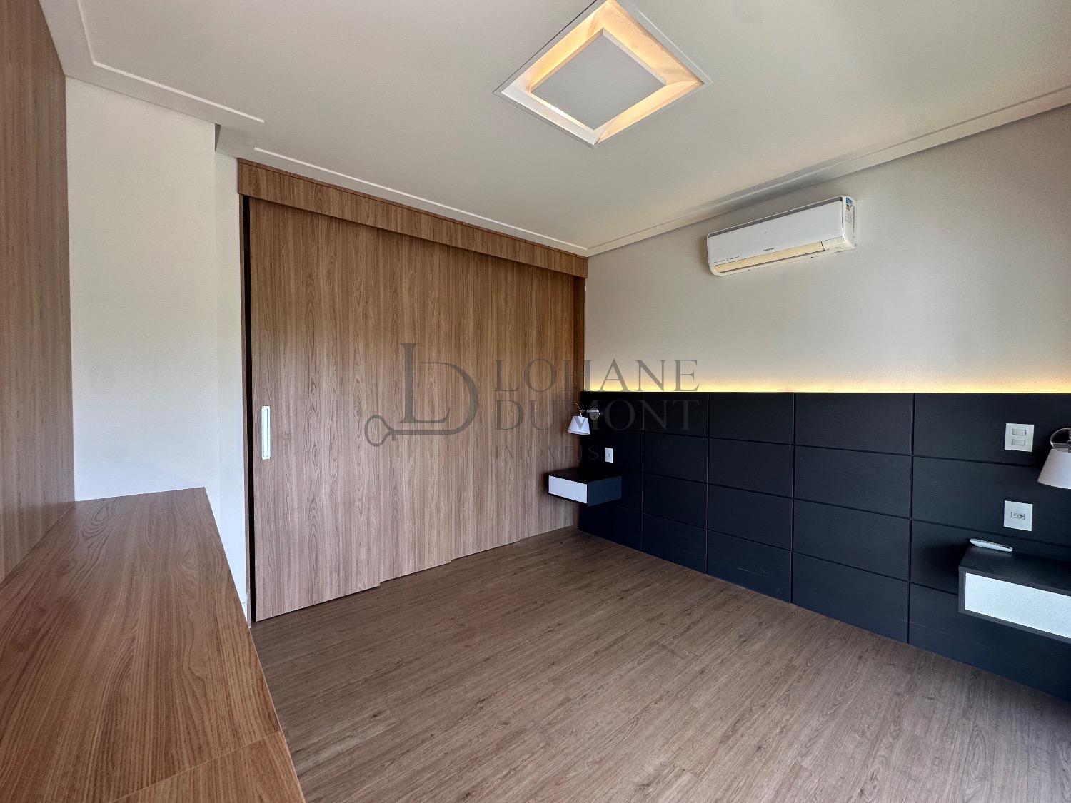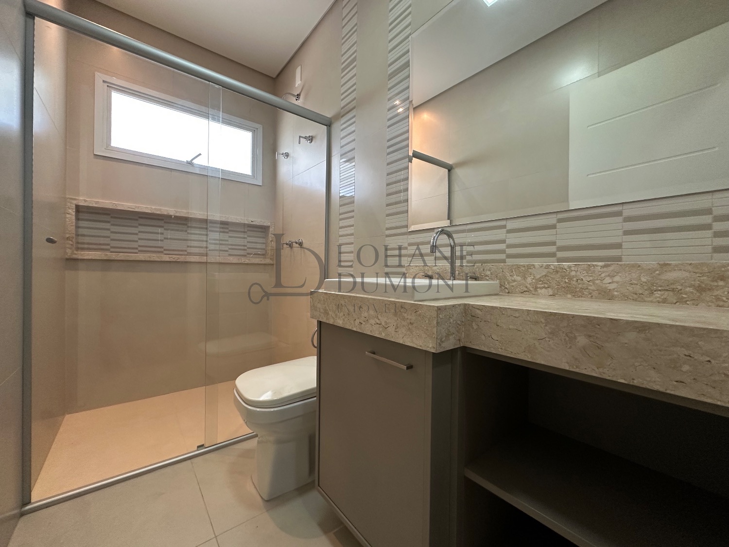 No pavimento superior, são 3 suítes, tendo um diferencial para a master que se destaca pelo banheiro amplo, com marcenaria completa, closet integrado ao ambiente, oferecendo um espaço funcional e confortável, pensado para proporcionar praticidade e comodidade no dia a dia, além de um home theater espaçoso, com saída para uma ampla sacada, que oferece uma vista agradável para área verde externa ao condomínio.