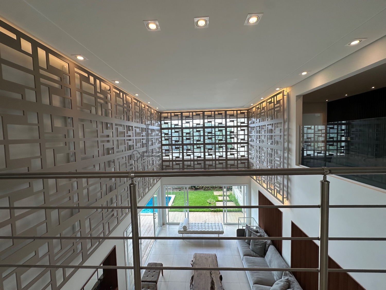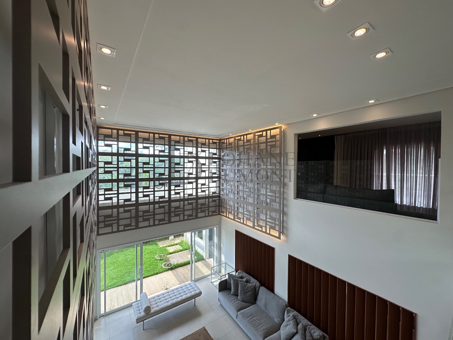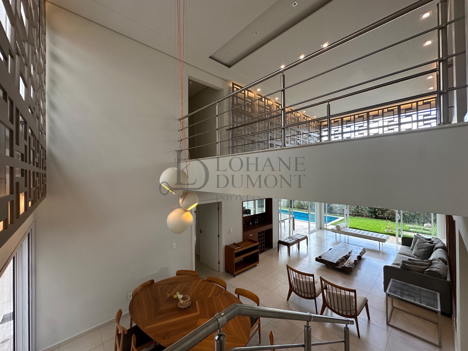 No pavimento térreo, conta com hall de entrada espaçoso com lavabo, sala ampla para dois ambientes com pé-direito duplo, muita iluminação natural e integração com a área externa. Possui suíte térrea, escritório funcional totalmente planejado, com marcenaria sob medida, cozinha completa, sala de jantar, além de área de serviço com armários planejados.