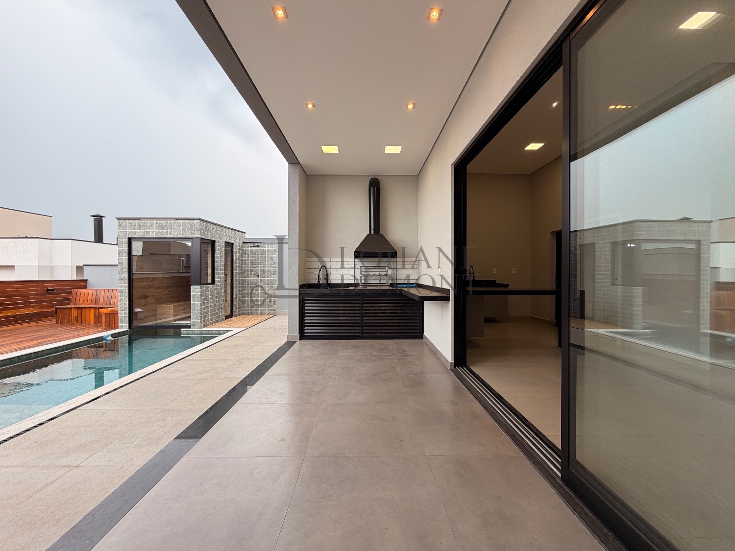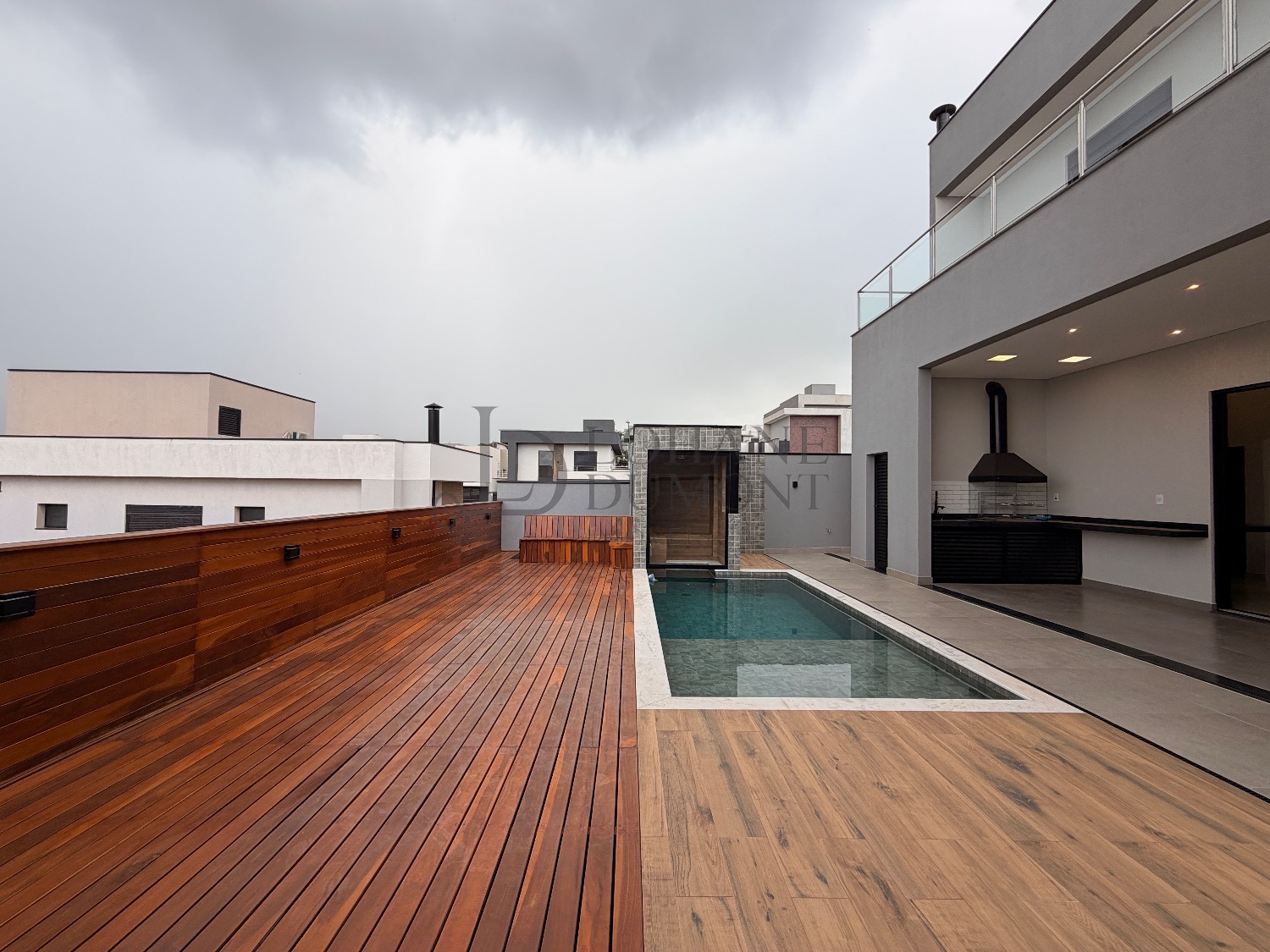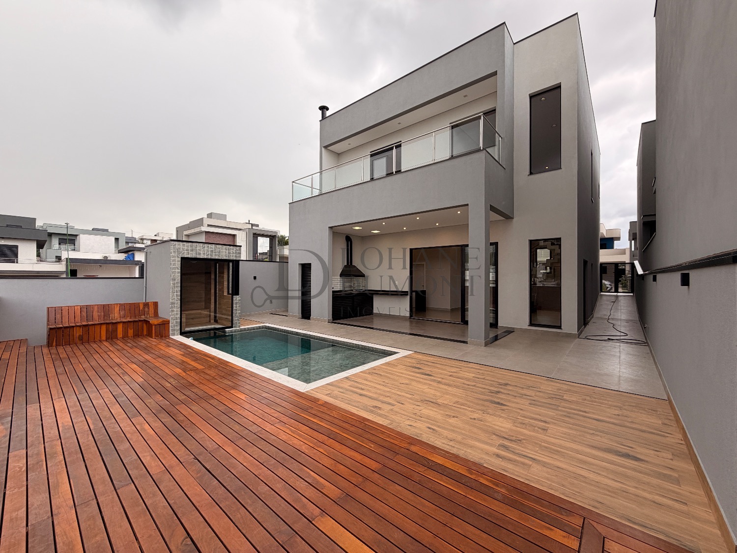 Na área externa, o espaço gourmet com churrasqueira se integra à área de lazer, que inclui piscina, sauna, banheiro externo, quintal e deck de madeira, criando um ambiente perfeito para momentos de descanso e convivência. A casa possui quatro vagas de garagem, sendo duas cobertas, além de aquecimento solar para a residência e para a piscina, preparação para sistema fotovoltaico e um sistema de filtragem que trata toda a água da casa, agregando conforto e eficiência.