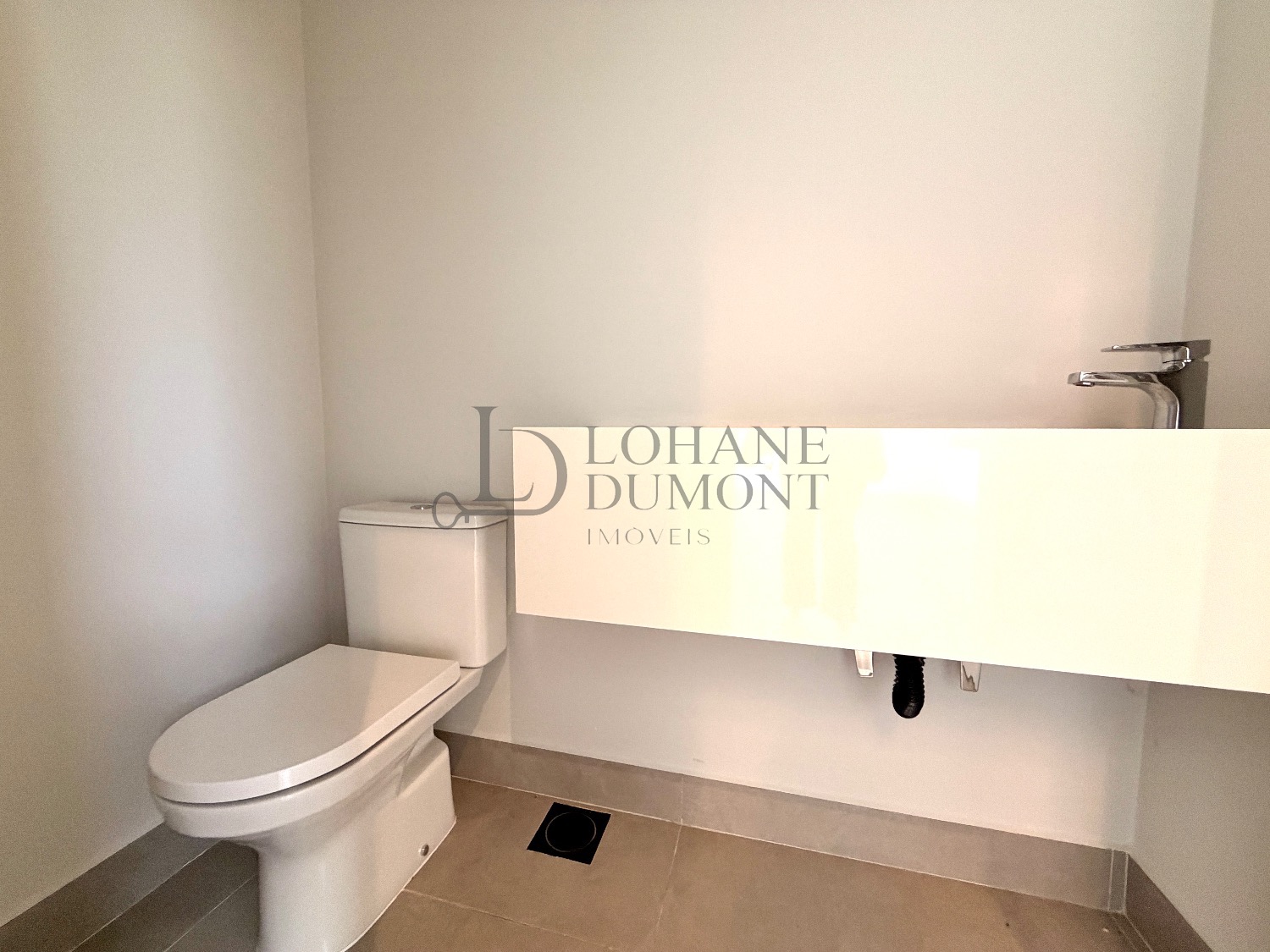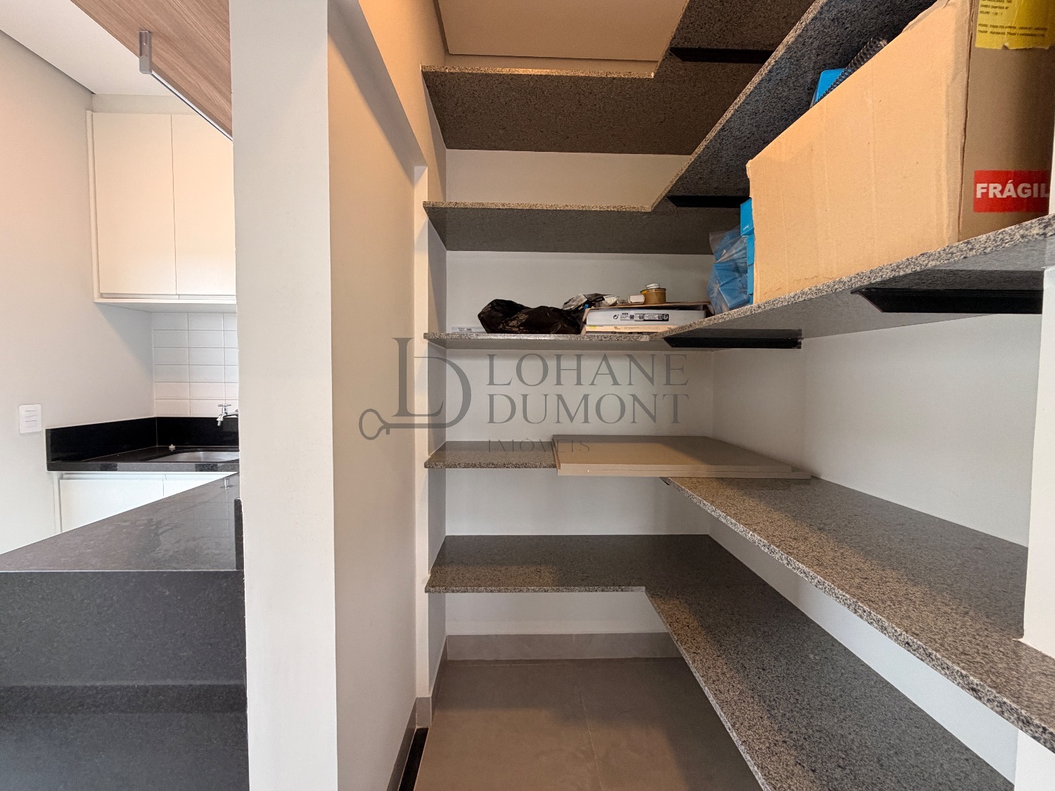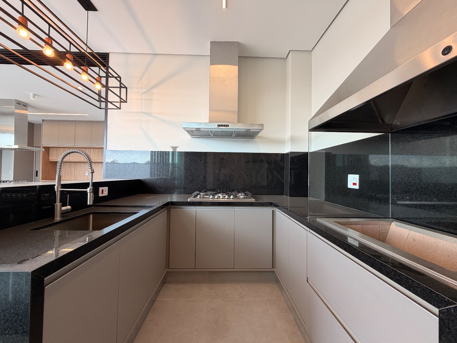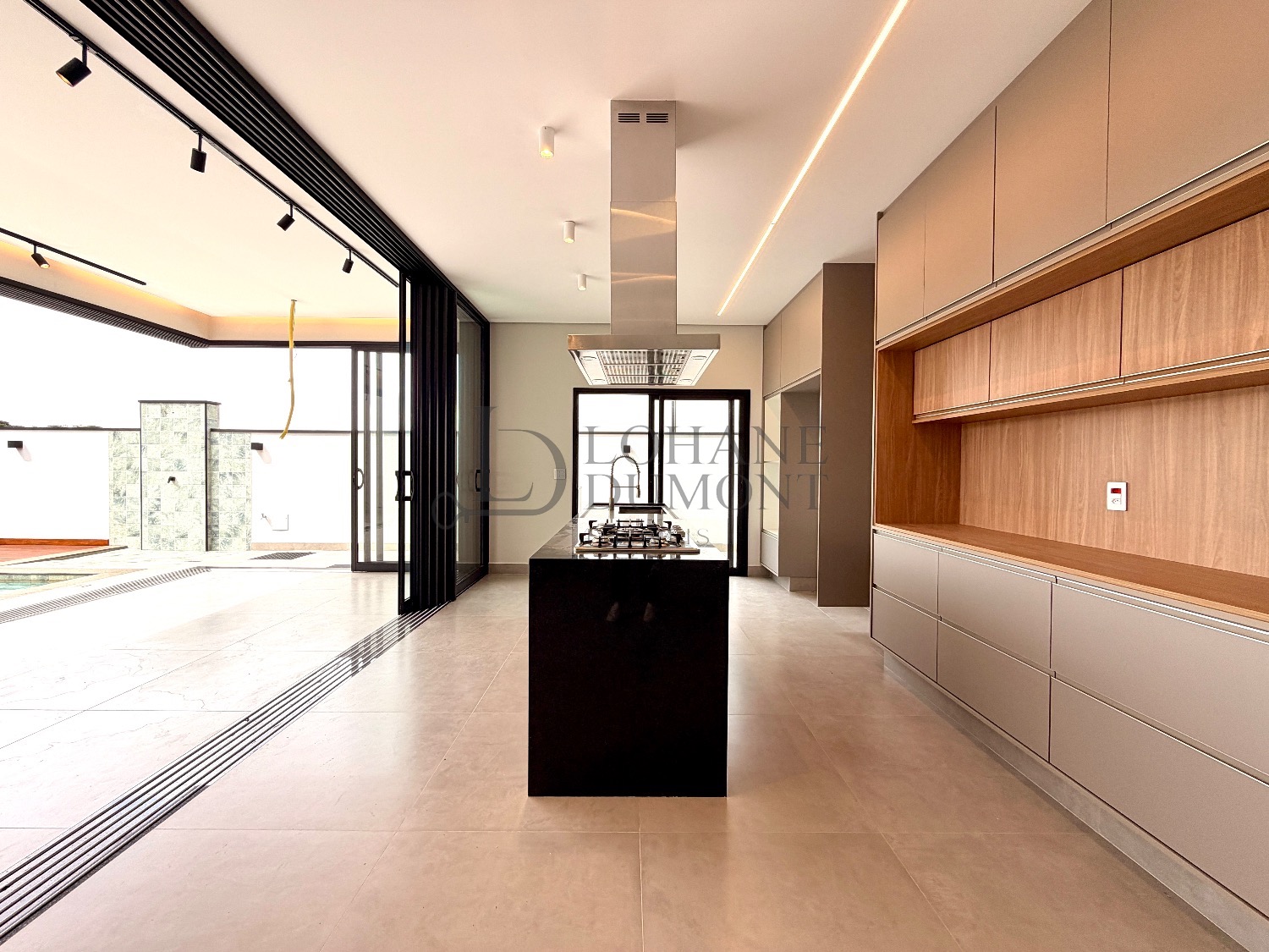 No pavimento térreo, o living para dois ambientes com pé-direito duplo proporciona amplitude e iluminação natural, criando um espaço acolhedor e imponente. A cozinha é completa, equipada com armários planejados, coifa e cooktop já instalados, além de lavabo e área de serviço funcional.