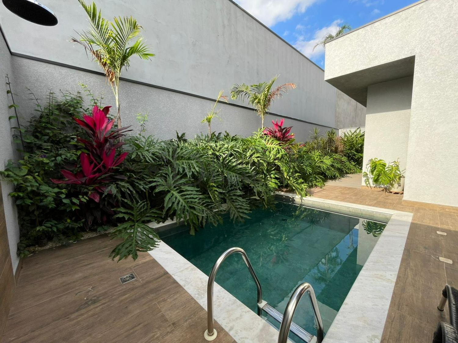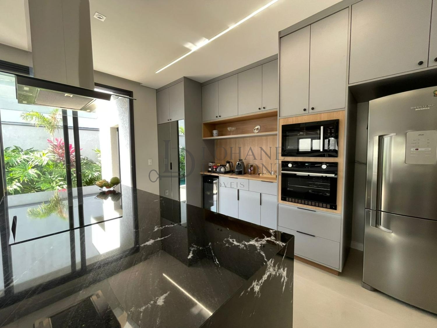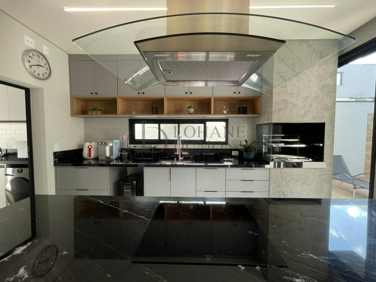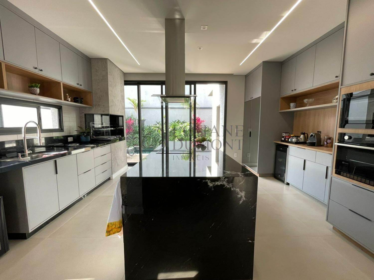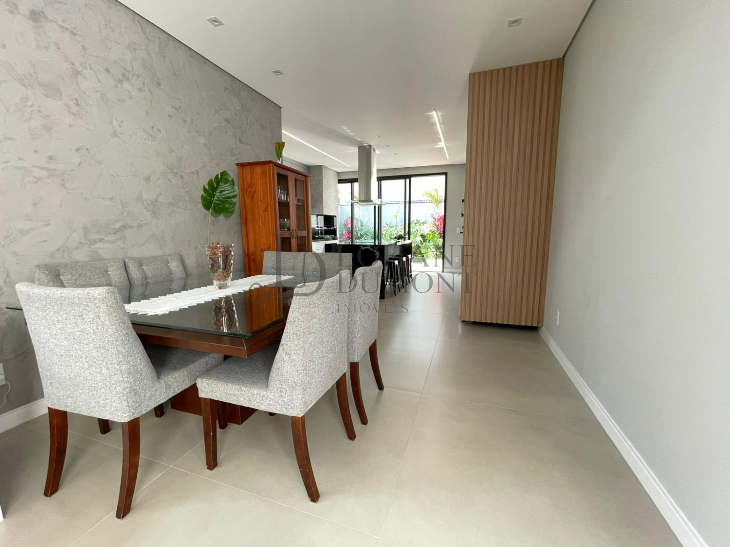 A sala ampla com pé-direito duplo oferece excelente ventilação e iluminação natural, integrando-se à cozinha planejada com ilha central sob medida e ao espaço gourmet com churrasqueira, criando ambientes funcionais e acolhedores para o convívio diário. A área externa dispõe de piscina com banheiro de apoio, lavanderia funcional, depósito e quatro vagas de garagem.