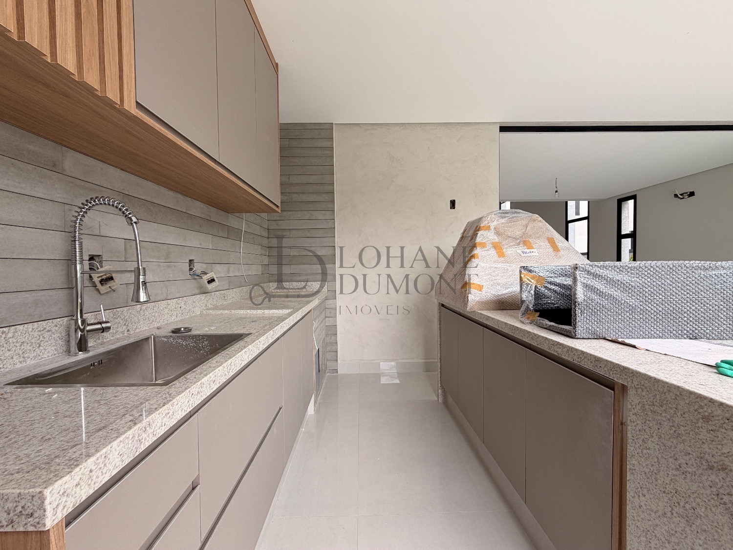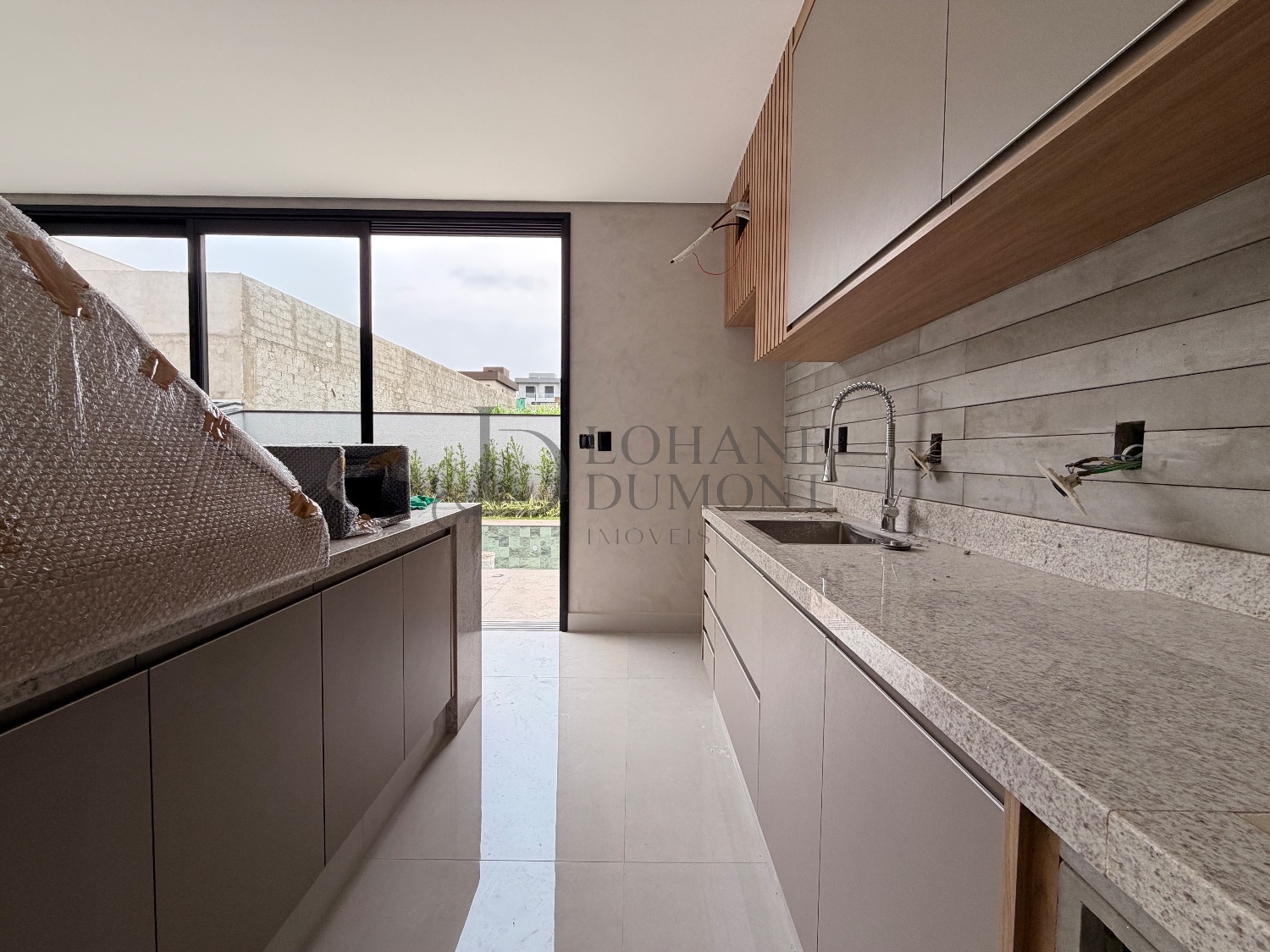 A cozinha ampla integra-se ao espaço gourmet, ambos equipados com armários planejados, cooktop e coifa, podendo ser separados por porta deslizante de vidro, garantindo flexibilidade e praticidade no uso diário. A área de serviço é funcional e bem equipada, com bancada em pedra, tanque inox embutido e armários planejados, além de banheiro de apoio à área de lazer.