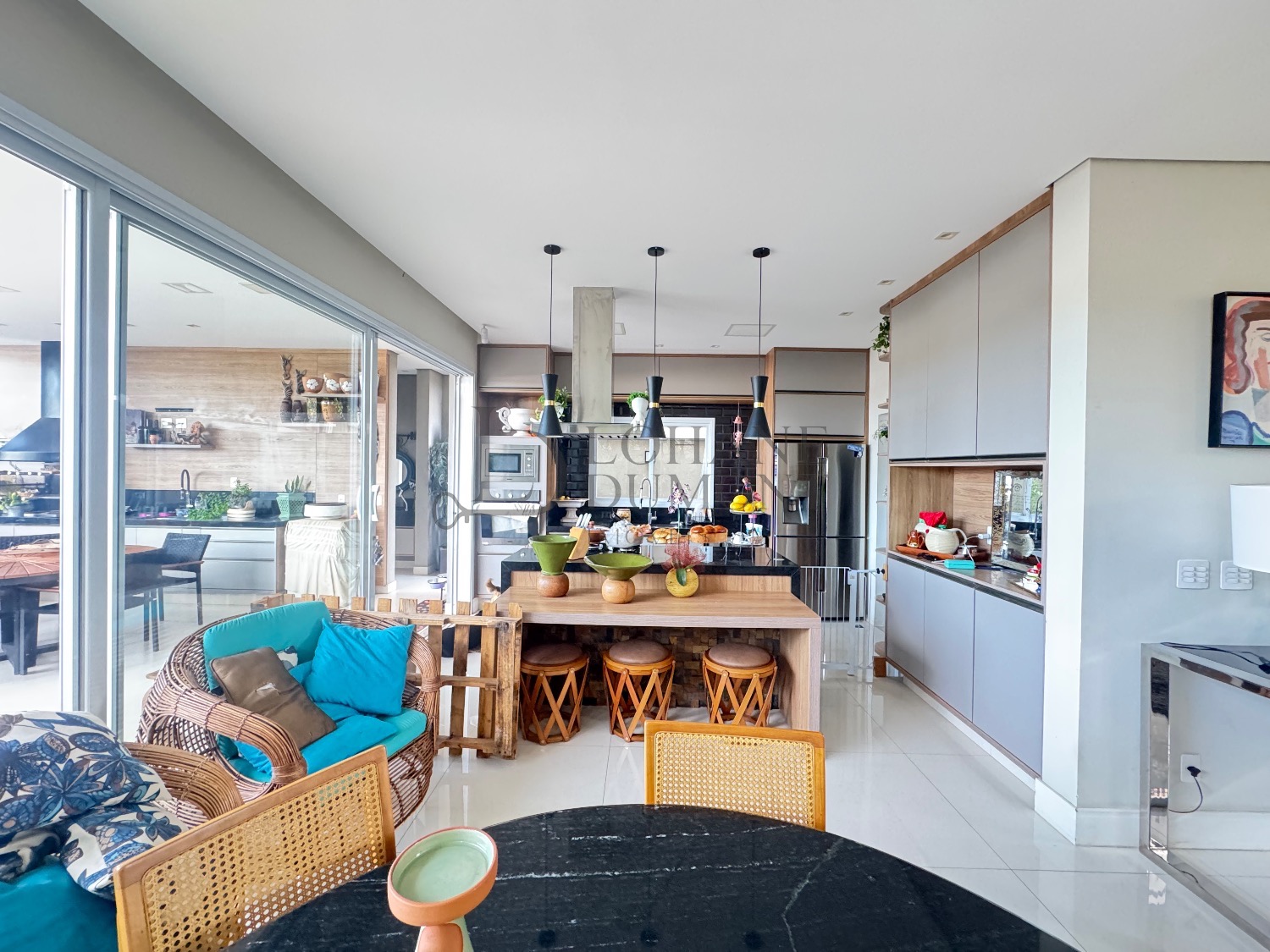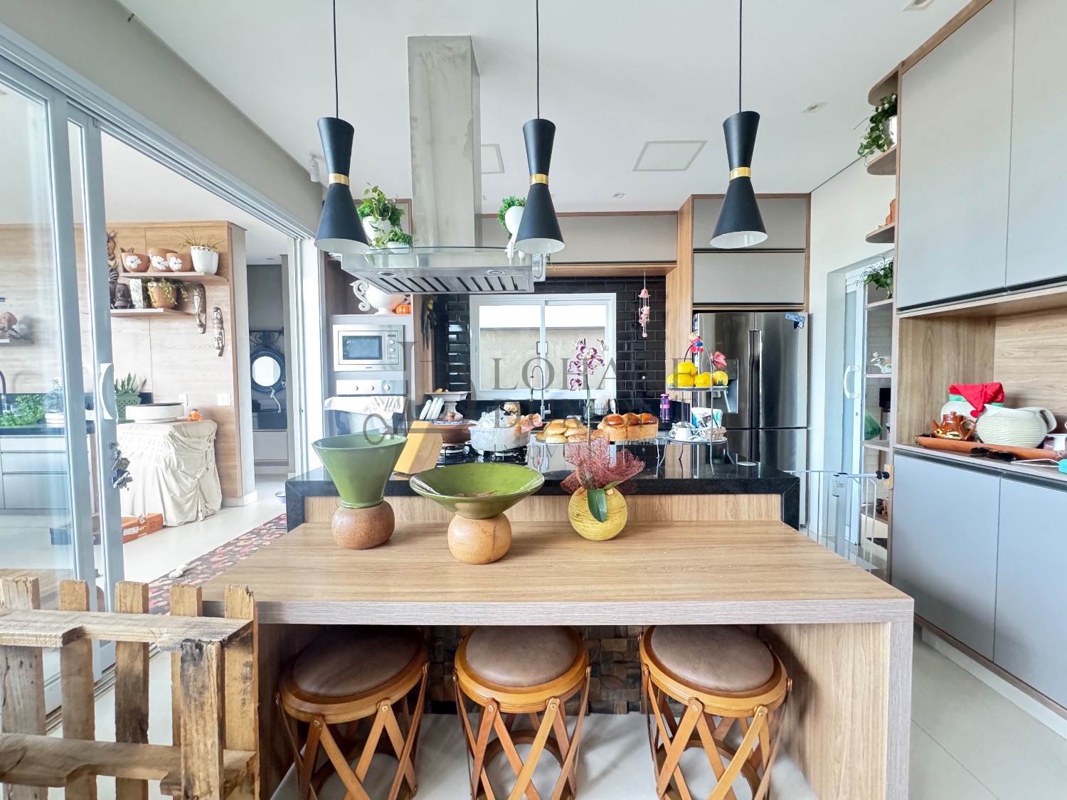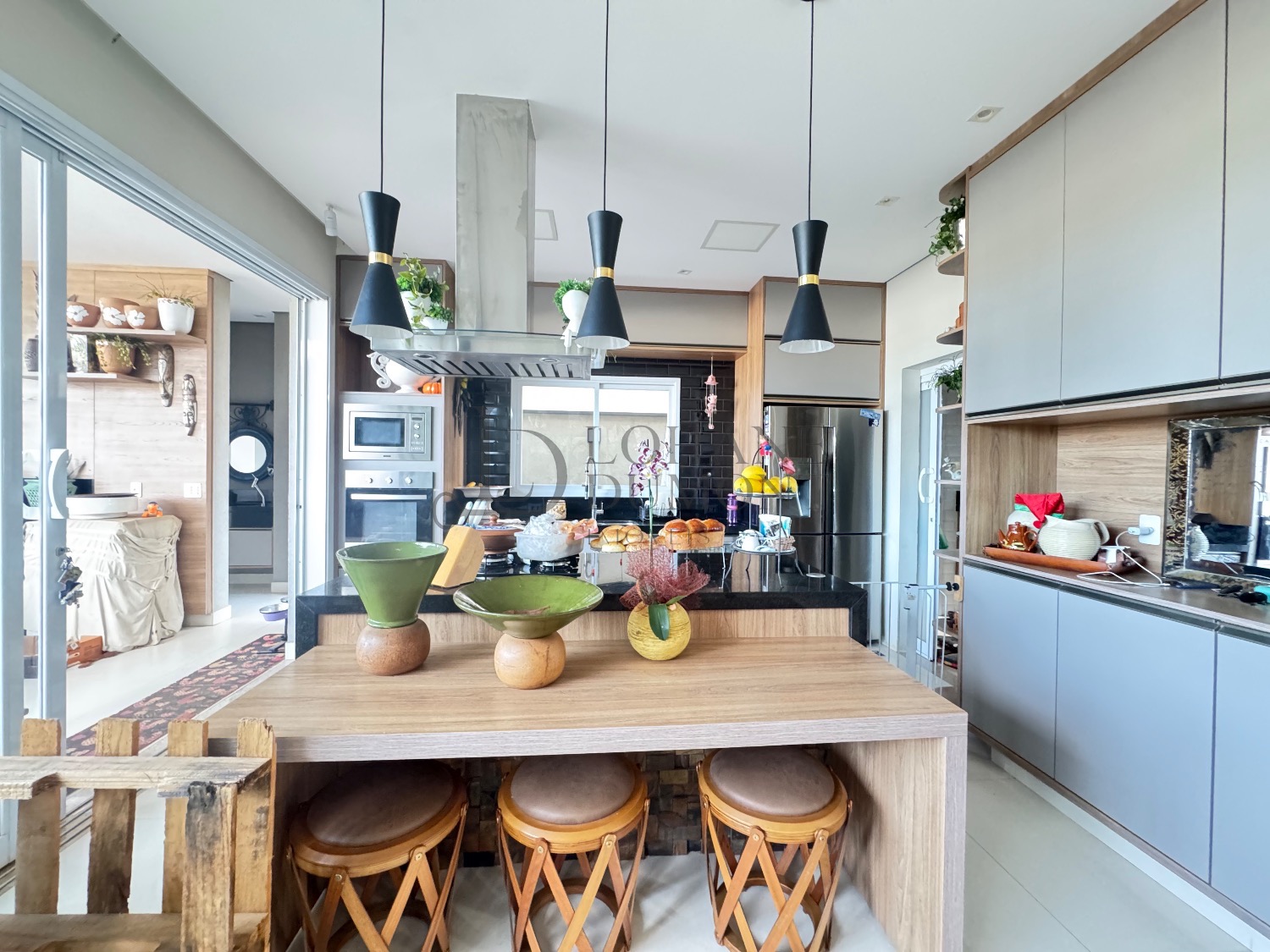 O living possui pé-direito duplo, integrando salas de estar e jantar. A cozinha americana é equipada com armários e eletrodomésticos, e o home theater pode ser revertido em suíte térrea, oferecendo flexibilidade ao layout.