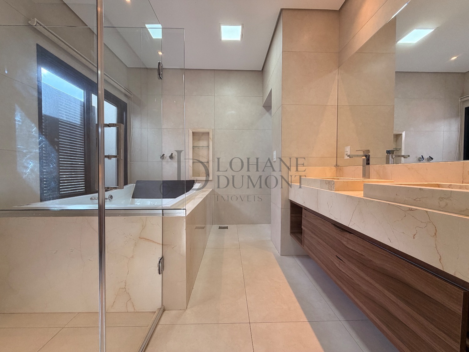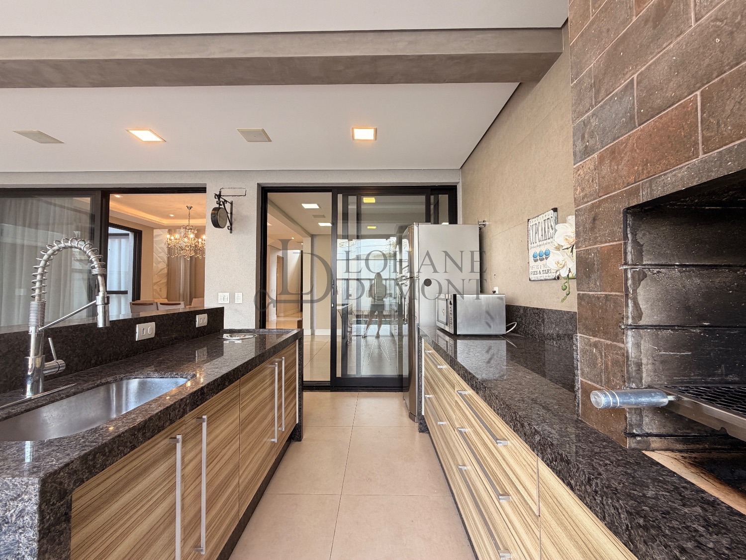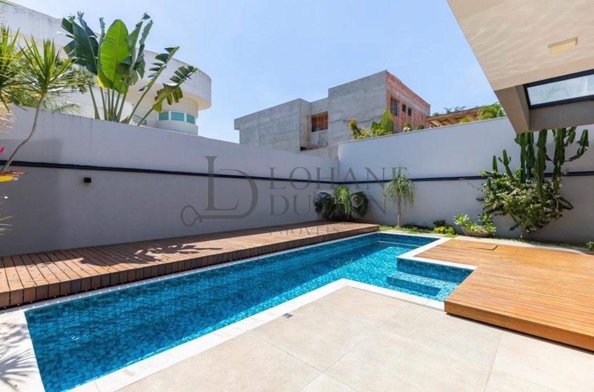 A área externa é sofisticada e funcional, com paisagismo completo e piscina com SPA e hidromassagem, além de deck deslizante sobre trilhos que permite cobrir a piscina quando desejado. A piscina está preparada para aquecimento e conta com iluminação. O imóvel também oferece sistema de aspiração central, aquecimento solar e quatro vagas de garagem, sendo duas cobertas.