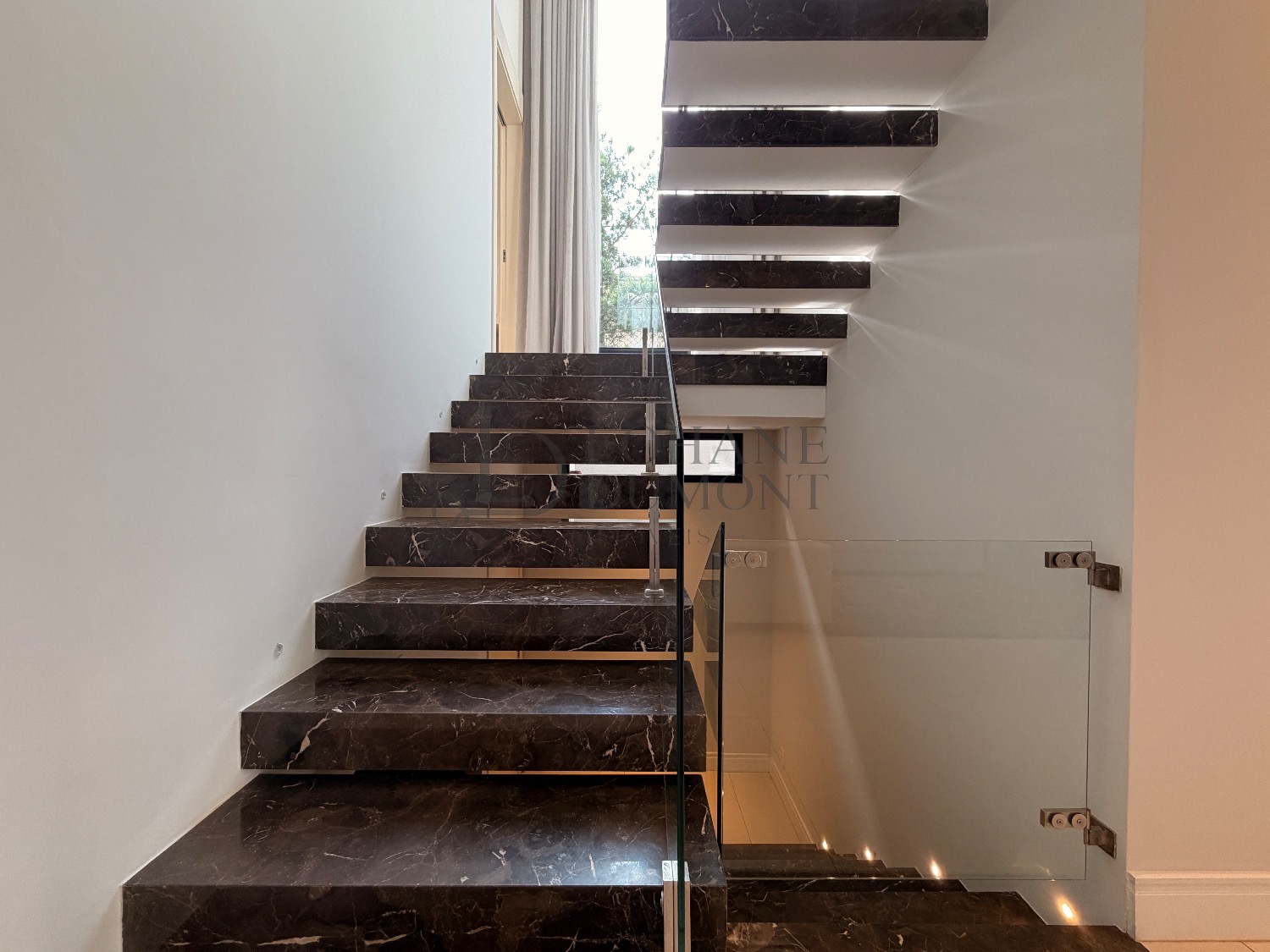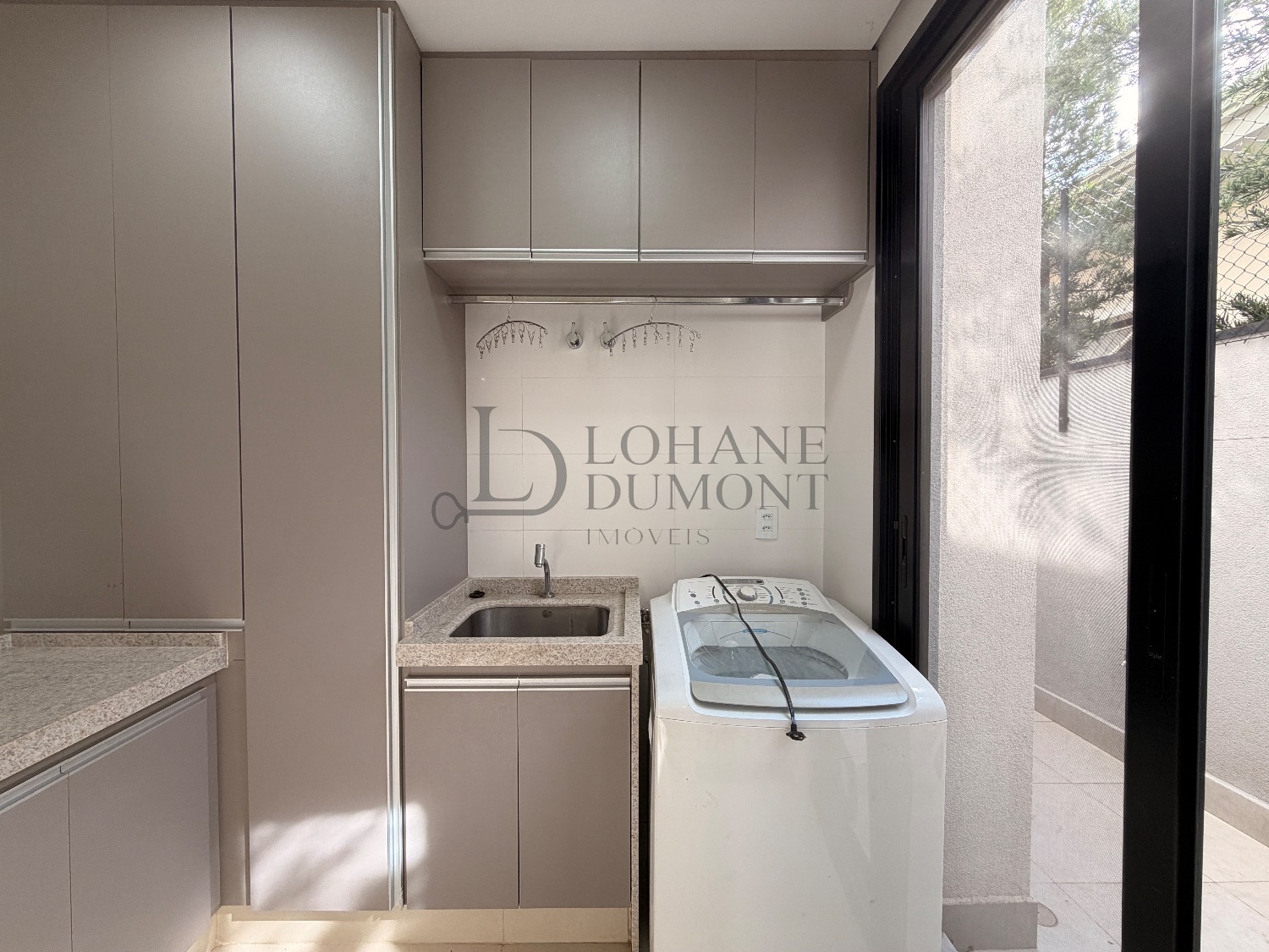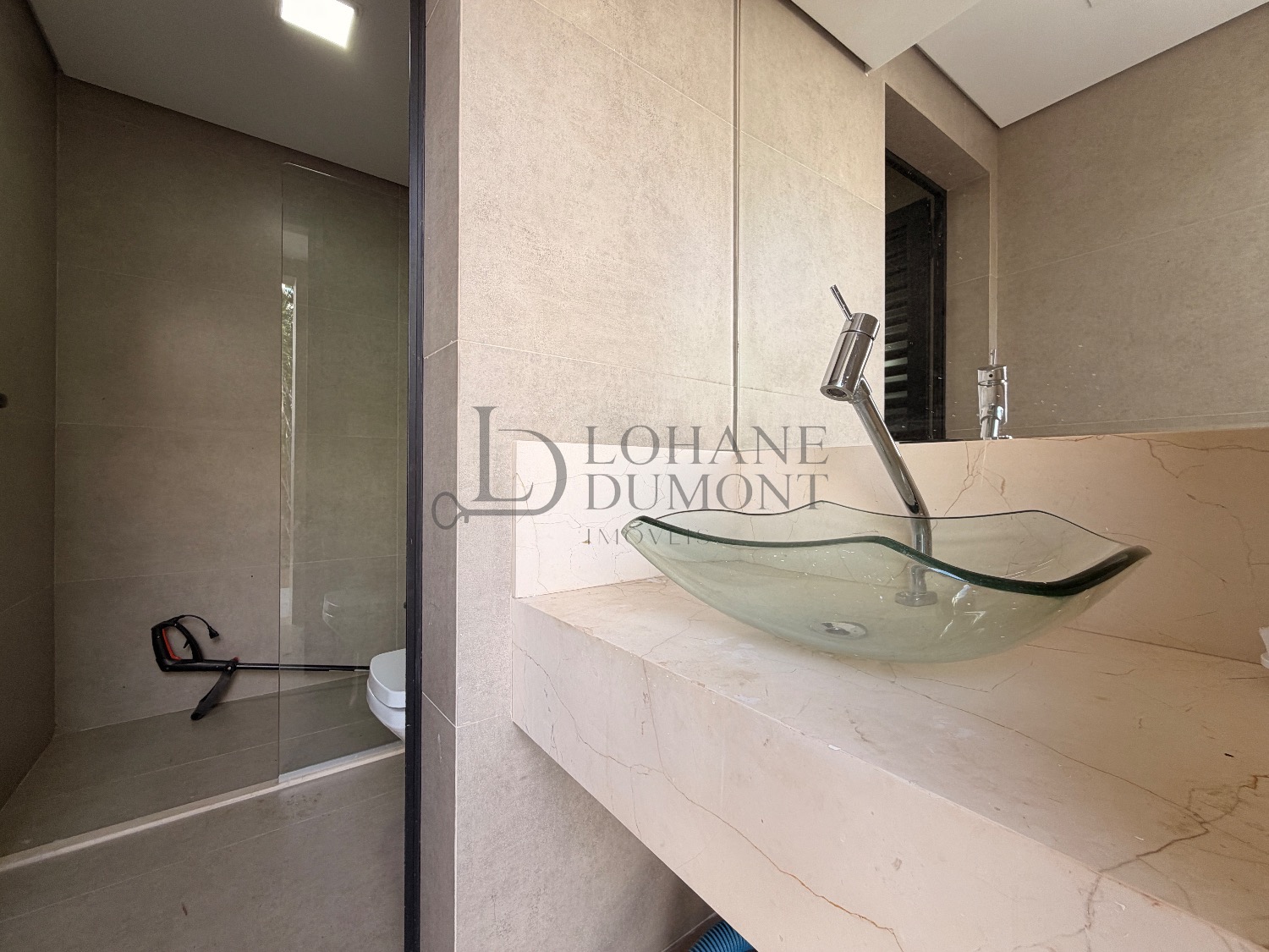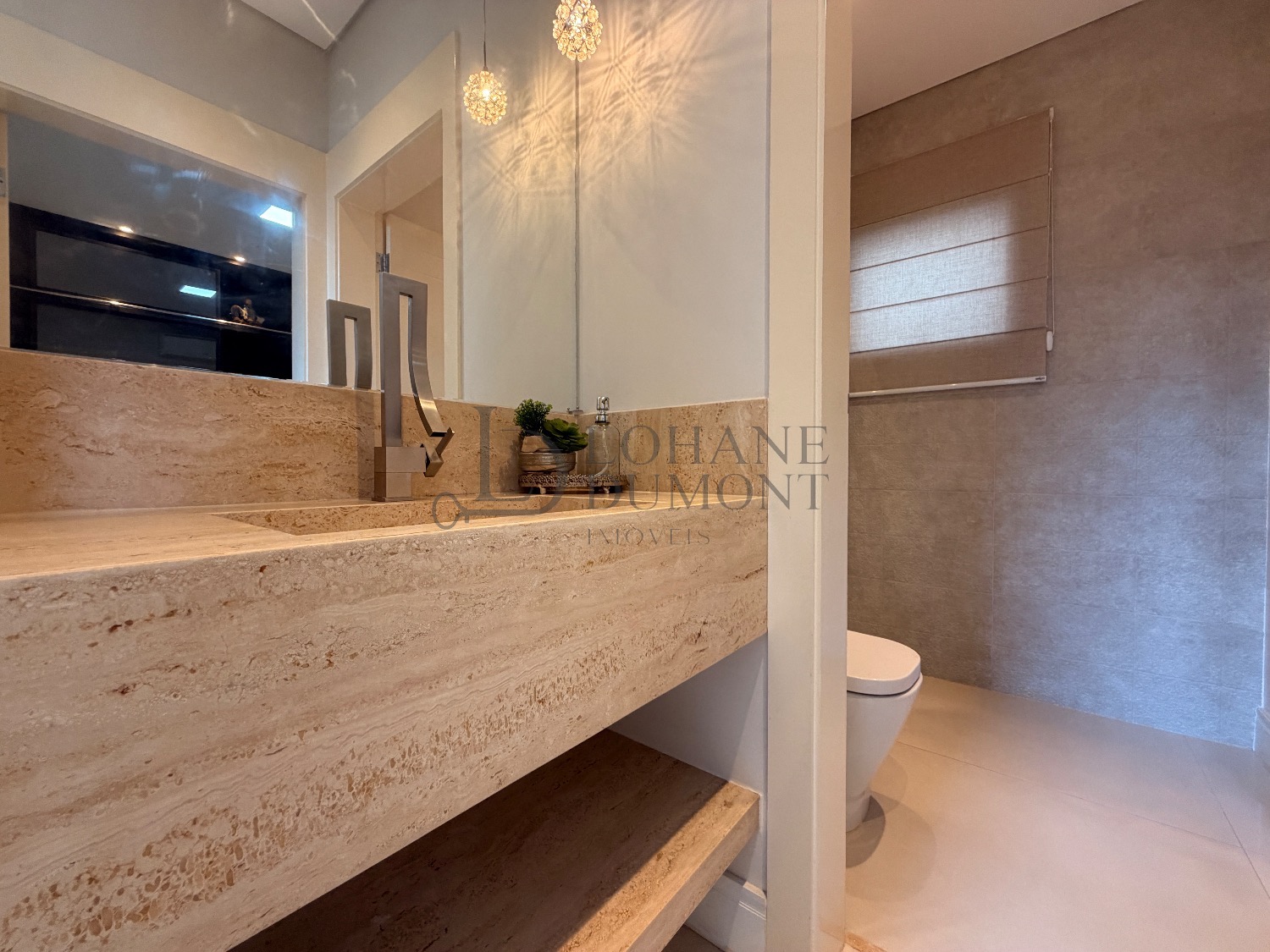 A área social conta com sala de pé-direito alto e um projeto de iluminação completo, integrado a um sistema de som ambiente JBL. Os acabamentos são de extremo bom gosto: banheiros com louças Deca linha Unic, Grohe e Axis; cozinha e área gourmet equipadas com torneiras Kraus (EUA); lavabo em mármore Travertino Romano; escada em mármore Classic Brown e demais banheiros em Crema Menorca.