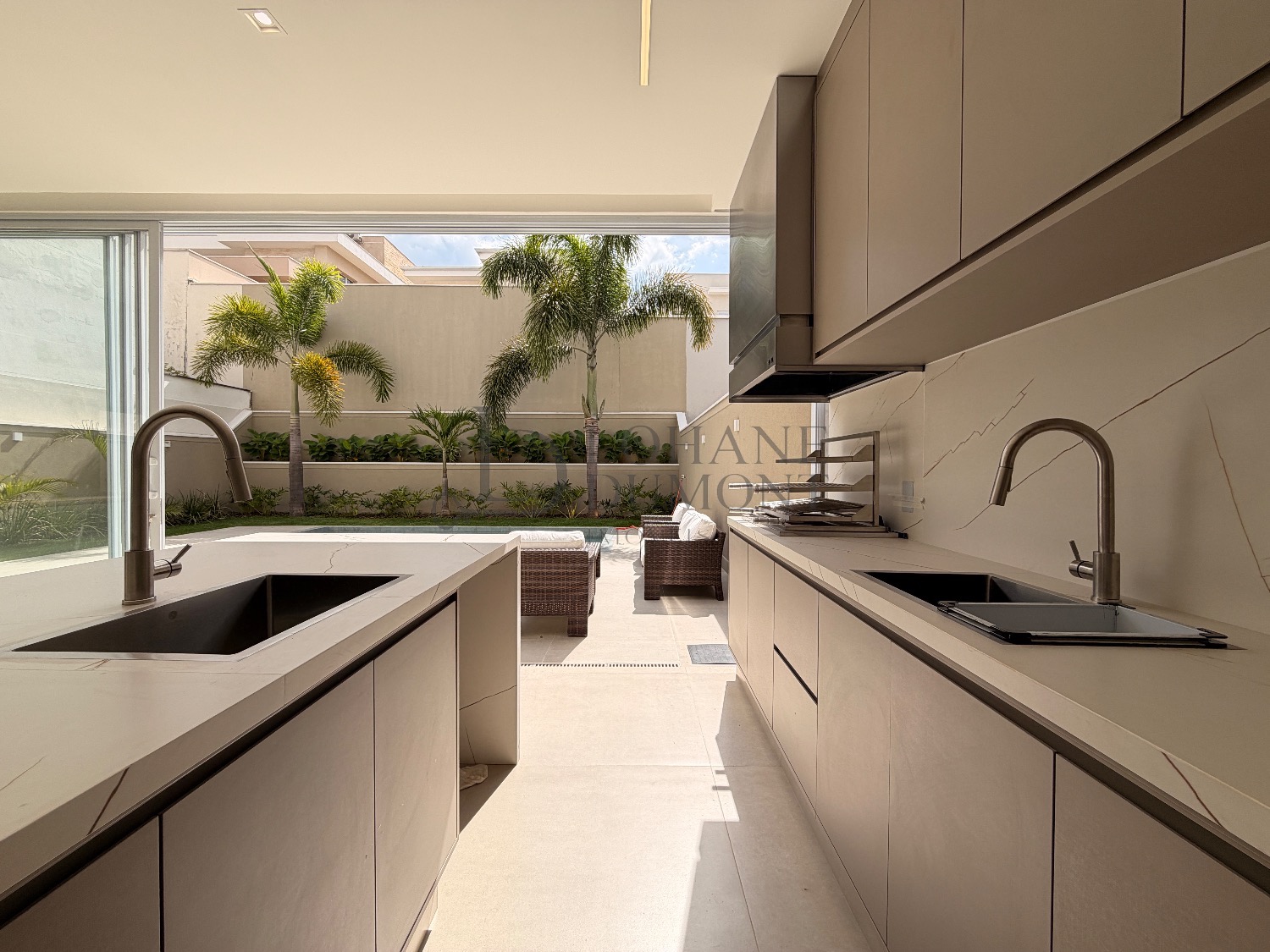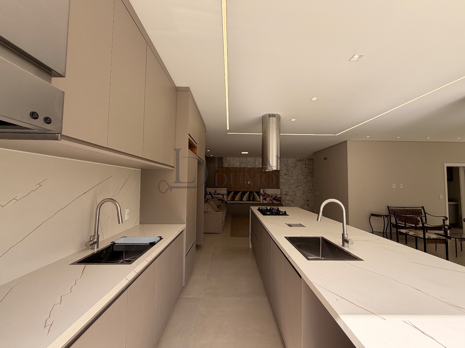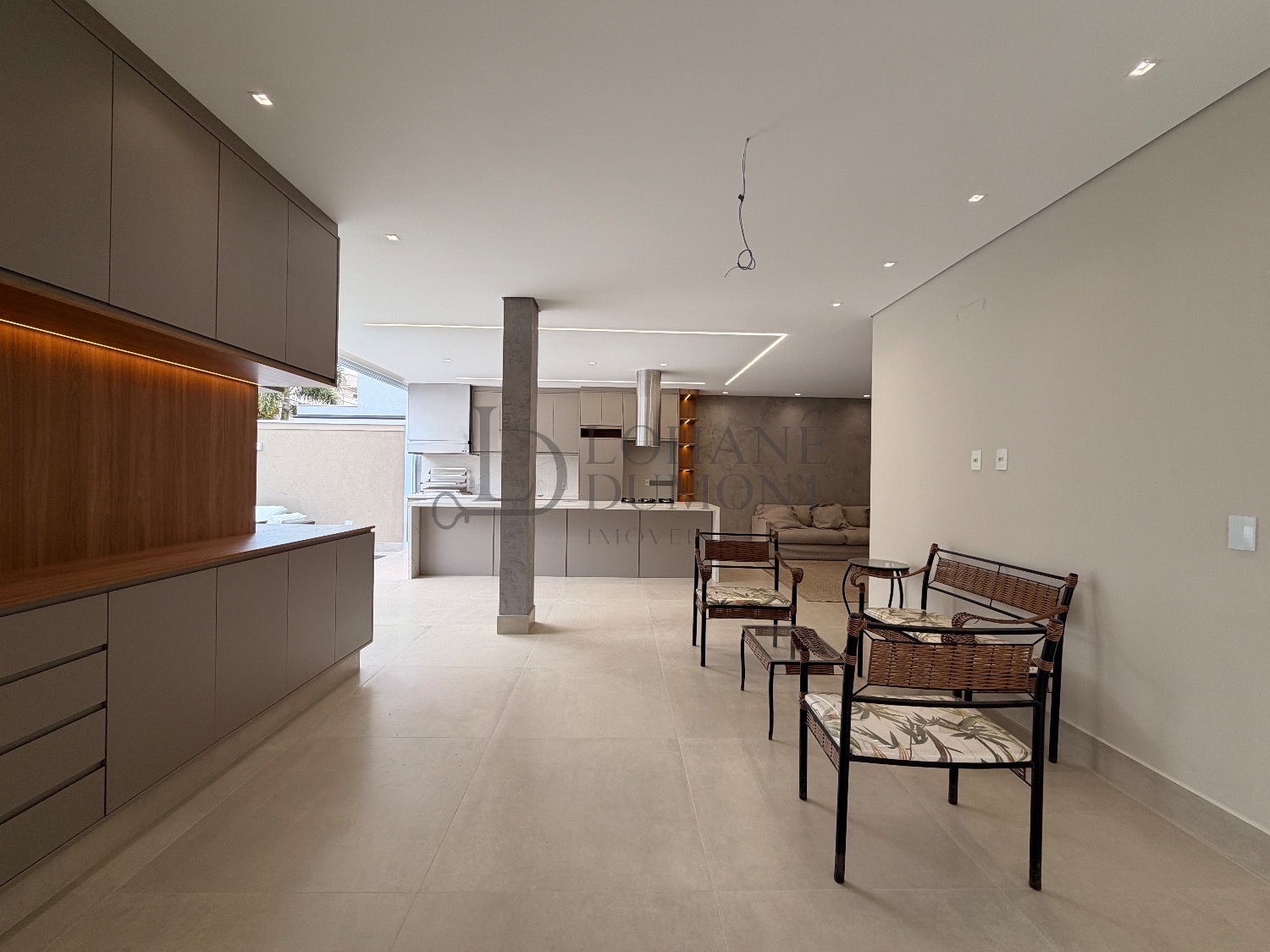 O living, com integração fluida entre estar e jantar, recebe luz natural e se conecta à área externa, criando um espaço ideal para convivência com elegância e conforto. A cozinha planejada, integrada ao gourmet, oferece praticidade e um ambiente agradável para quem aprecia receber com discrição e bom gosto.