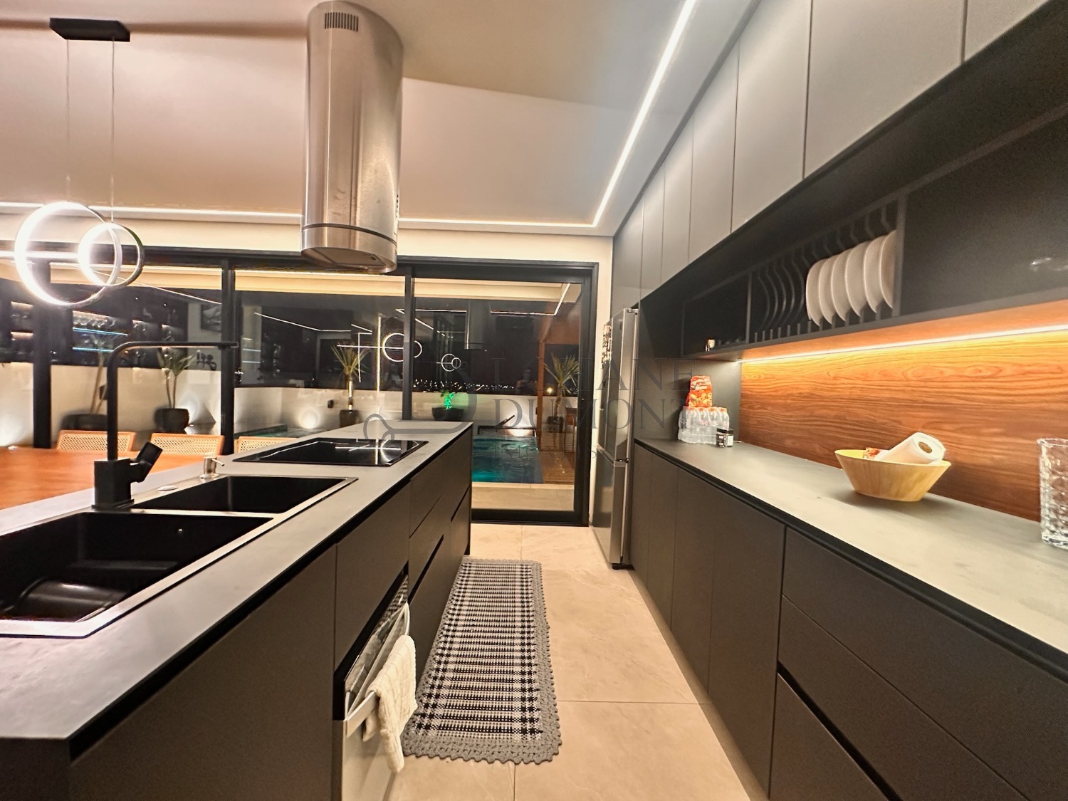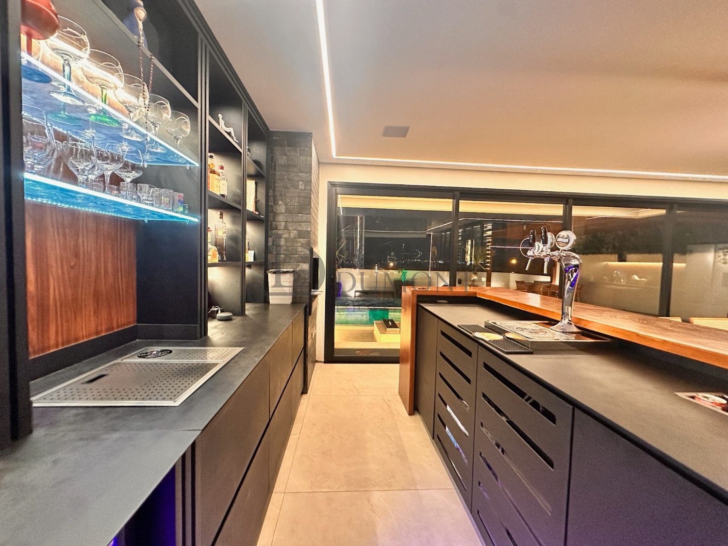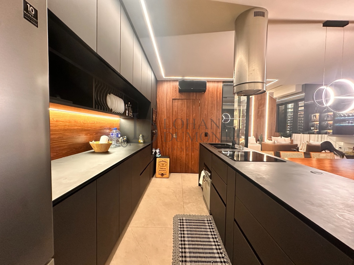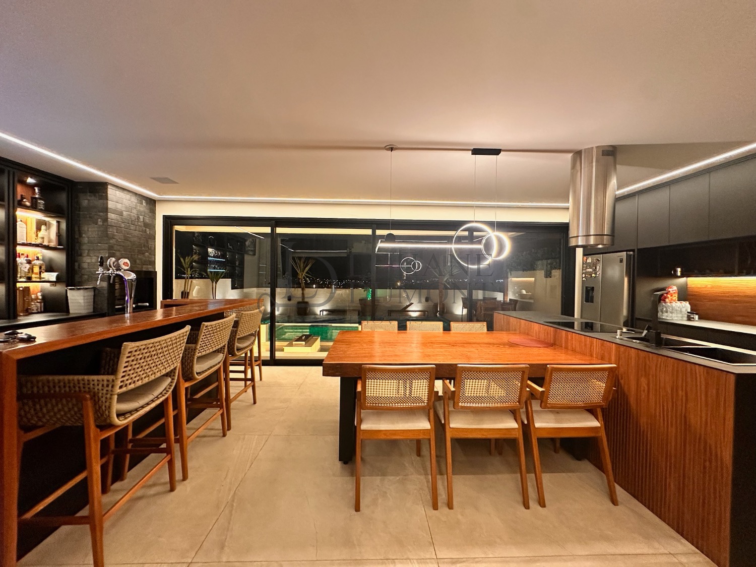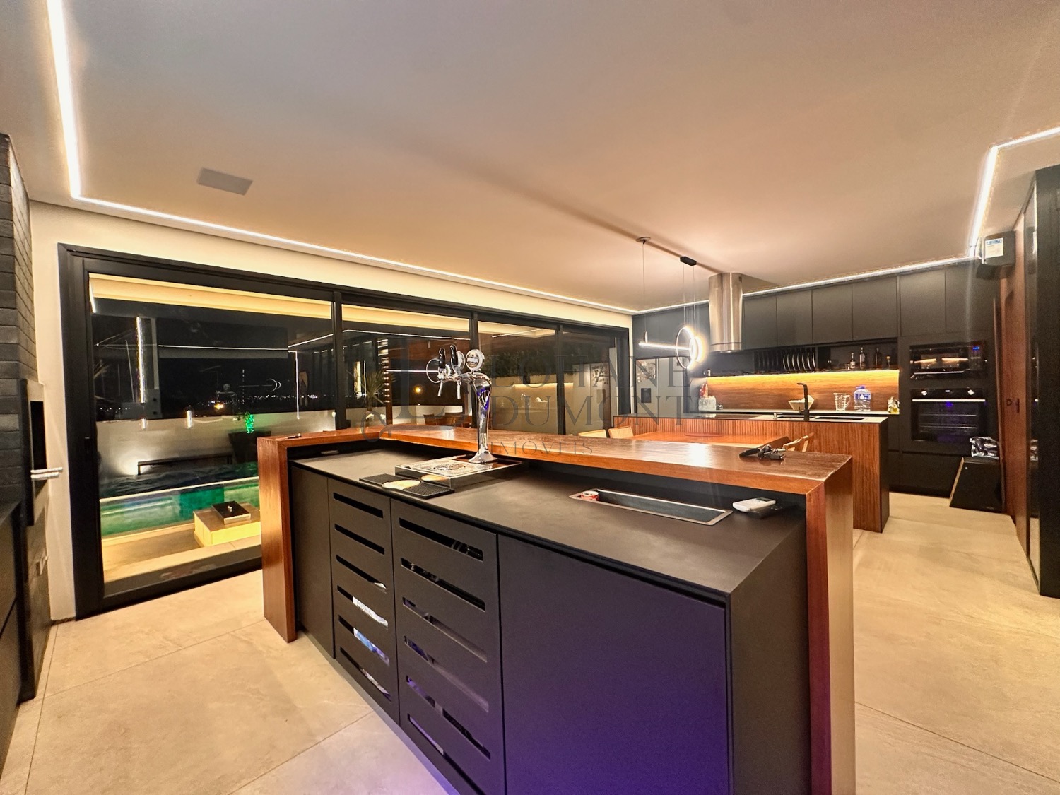 A cozinha se conecta de forma fluida com a área gourmet, permitindo que tudo aconteça ao mesmo tempo: família reunida, amigos circulando e o visual sempre presente. A área gourmet conta com churrasqueira e chopeira instalada.