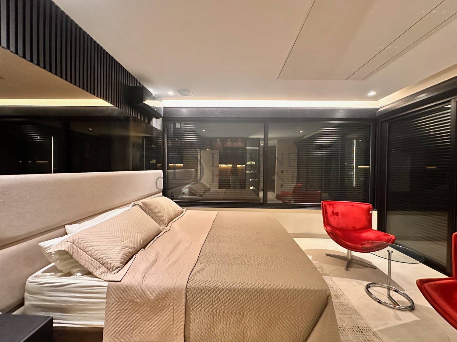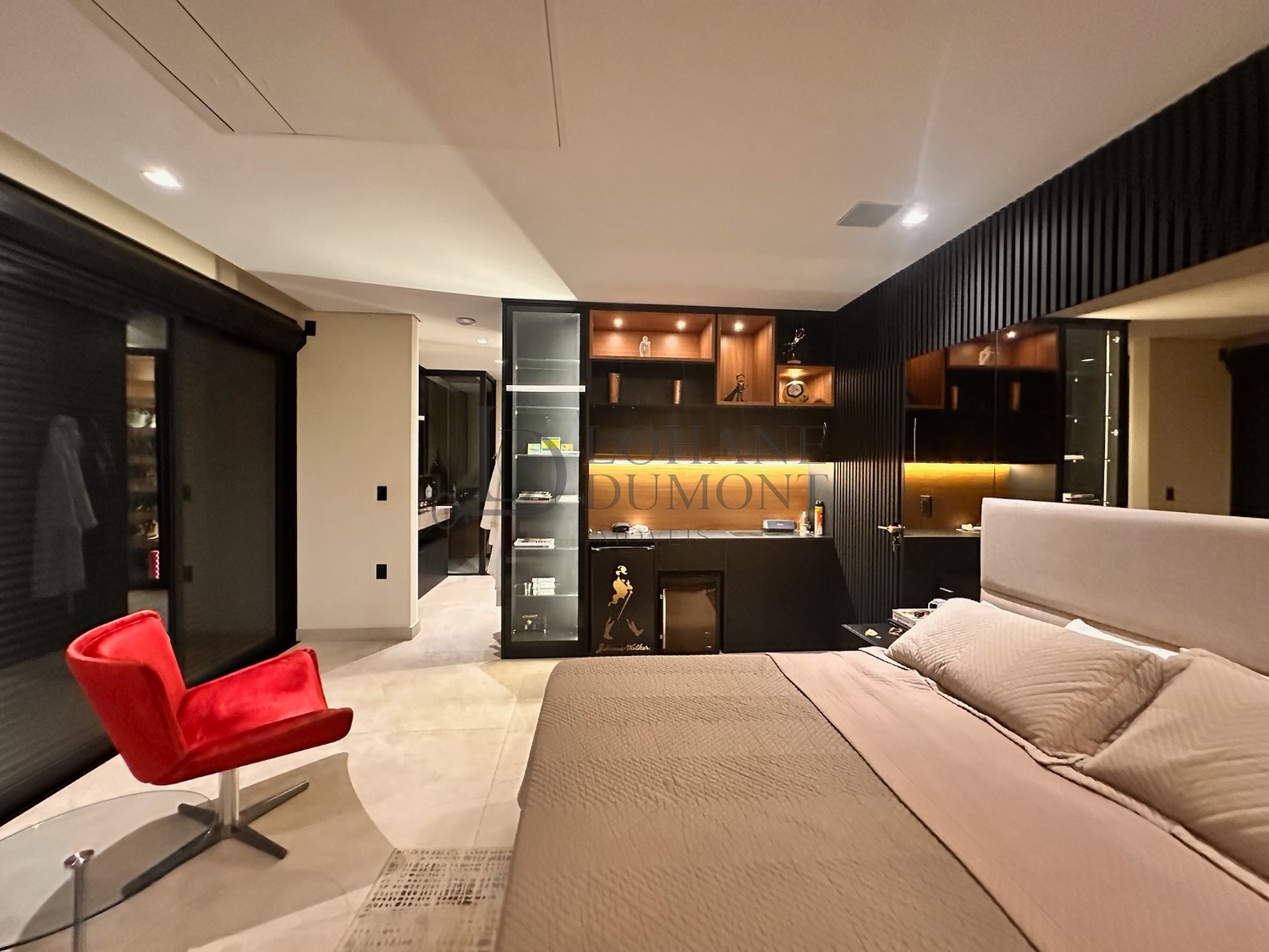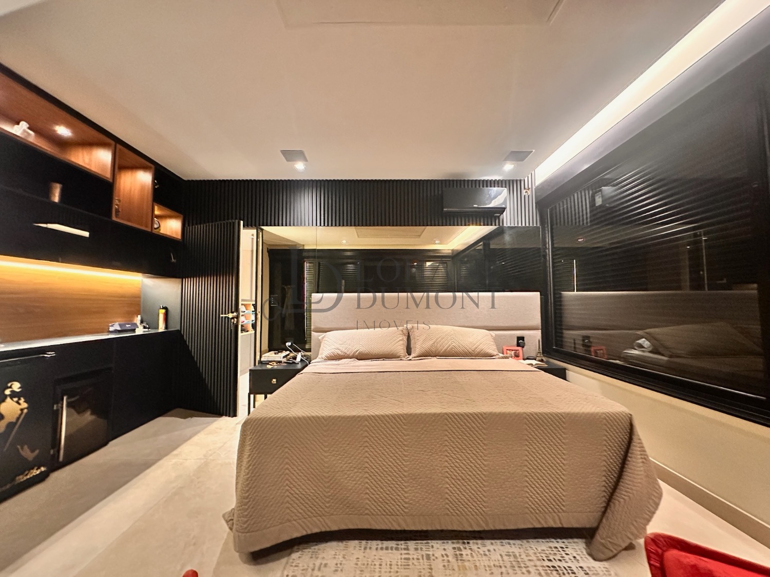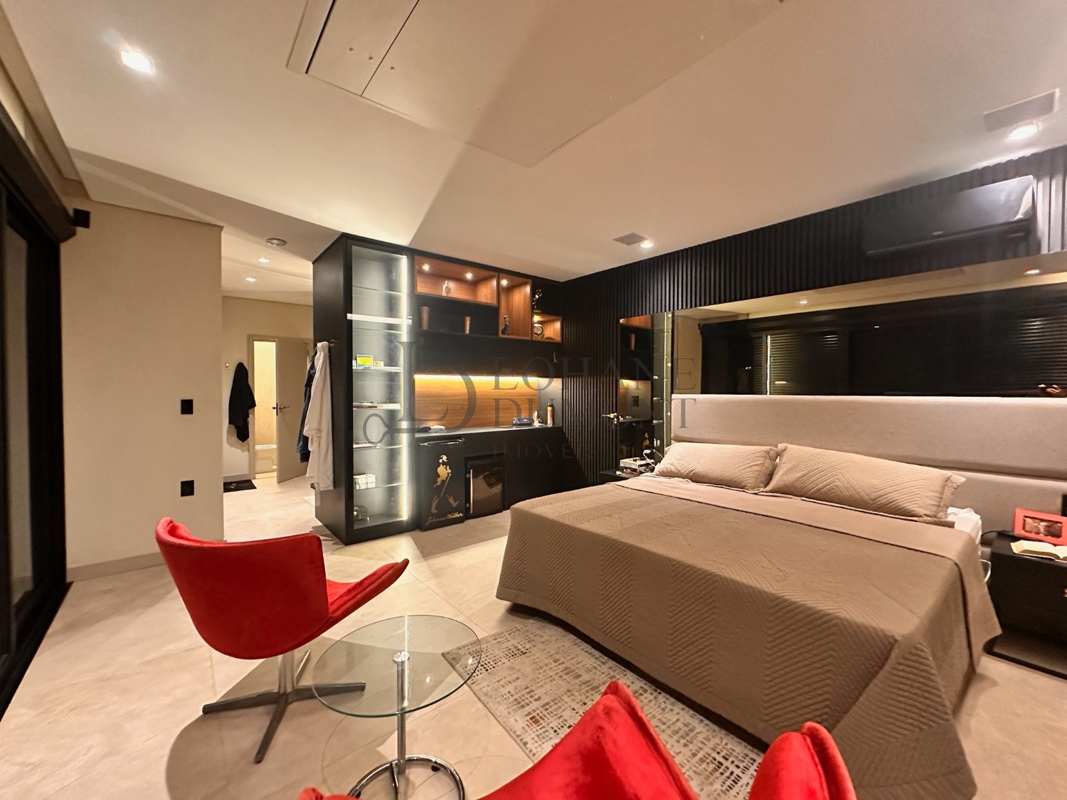 A área íntima conta com três suítes, e a master é um verdadeiro espetáculo. Localizada em posição privilegiada dentro do condomínio, ela oferece uma vista panorâmica que permite contemplar o pôr do sol, o nascer do sol, a lua e as estrelas. Na sacada, a jacuzzi exclusiva cria um refúgio único para momentos de relaxamento e contemplação — um dos grandes diferenciais desta casa.