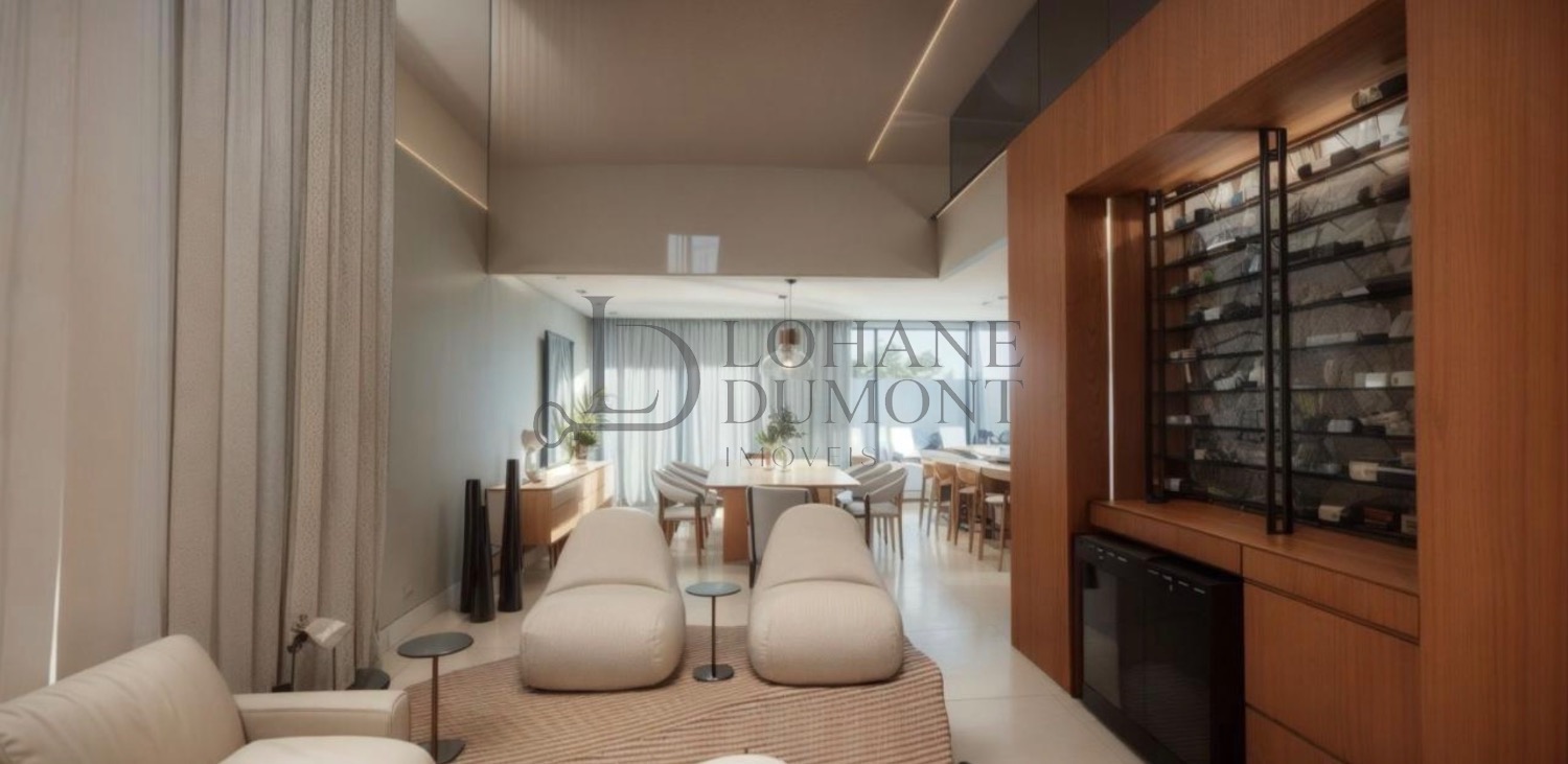 O amplo living é composto por diversos ambientes integrados, incluindo salas de estar e jantar, home theater e lavabo, todos enriquecidos por marcenaria planejada de alto padrão.