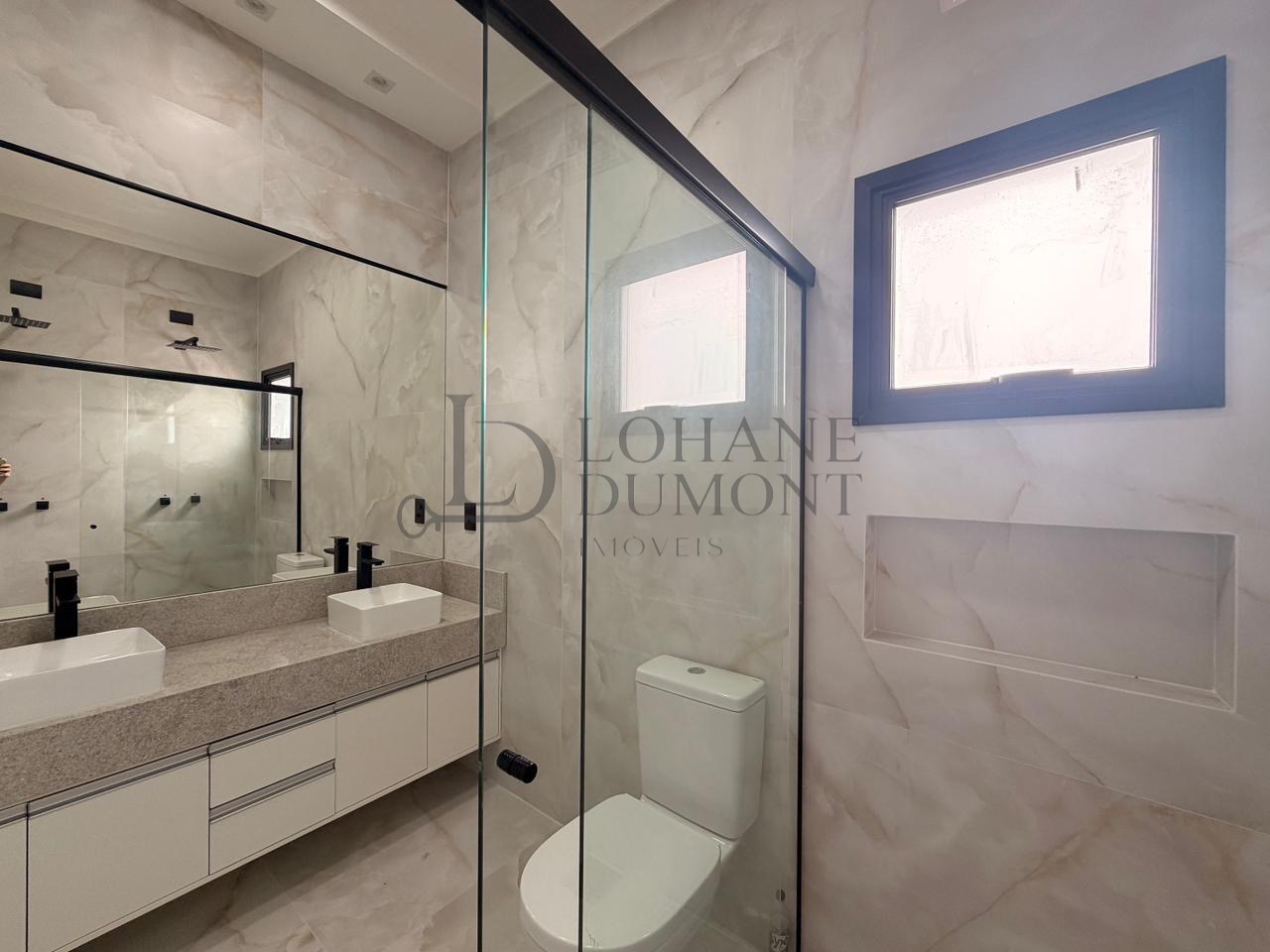 O sobrado conta com três suítes amplas, todas com sacada e persianas automatizadas, oferecendo praticidade e conforto. A suíte master foi pensada para elevar a experiência de morar bem, com closet montado, duas cubas e dois chuveiros, trazendo funcionalidade e exclusividade ao casal. Todos os banheiros são completos, com armários planejados, espelhos, box e metais instalados.