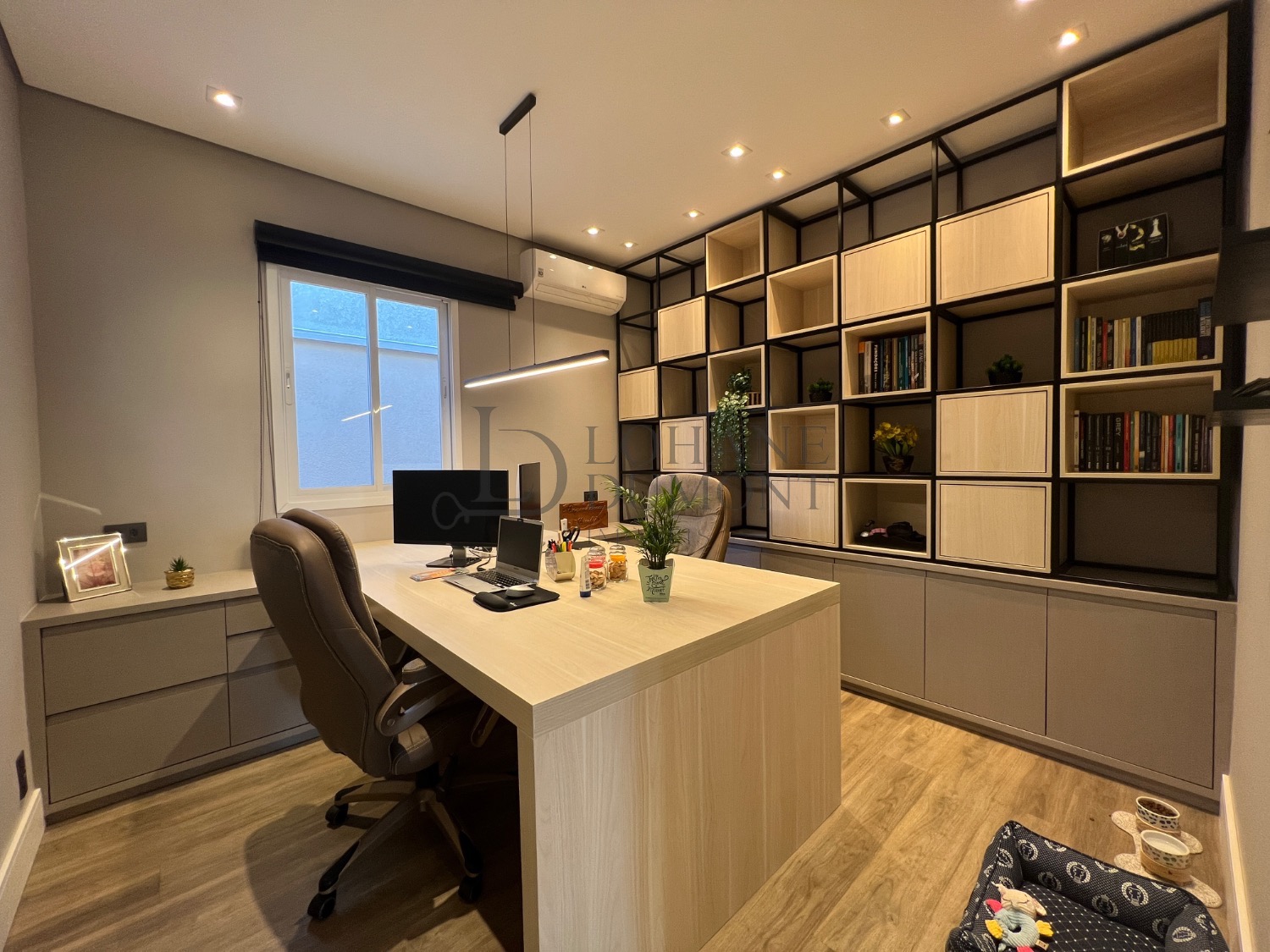 No pavimento térreo, a casa apresenta uma cozinha planejada com armários, integrada a uma ampla sala com pé-direito duplo para dois ambientes, proporcionando excelente iluminação natural e elegância ao espaço. Ainda neste nível, há lavabo e um quarto versátil que pode ser utilizado como home office, home theater ou acomodação para hóspedes.