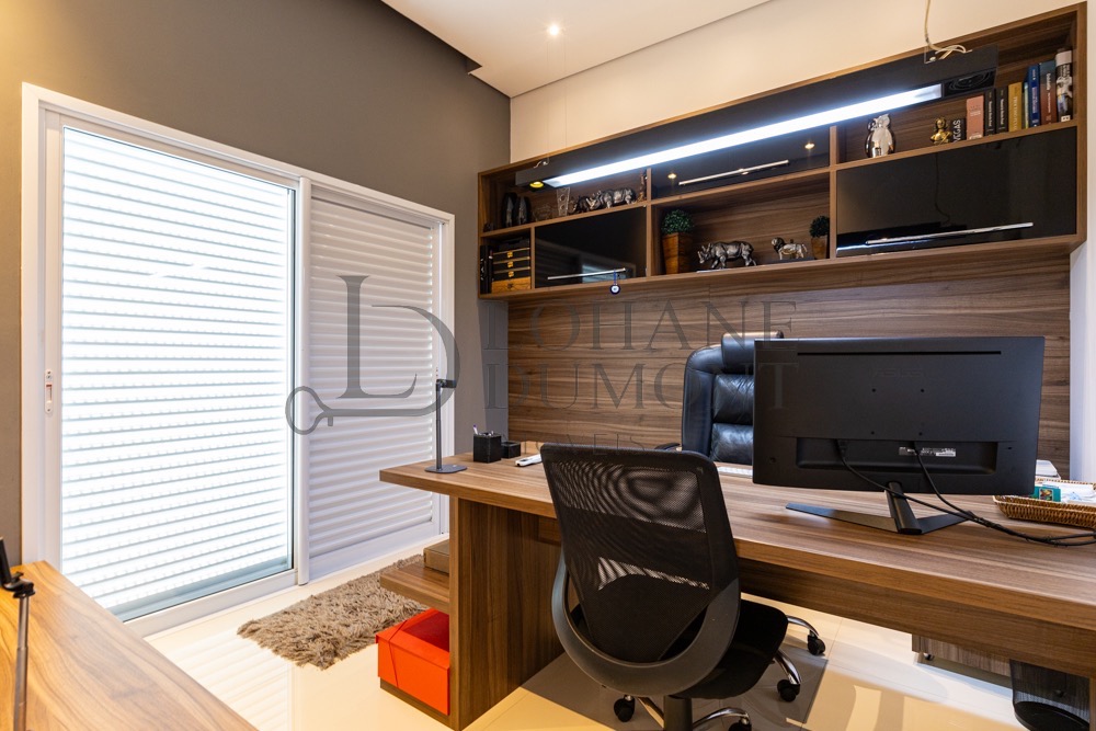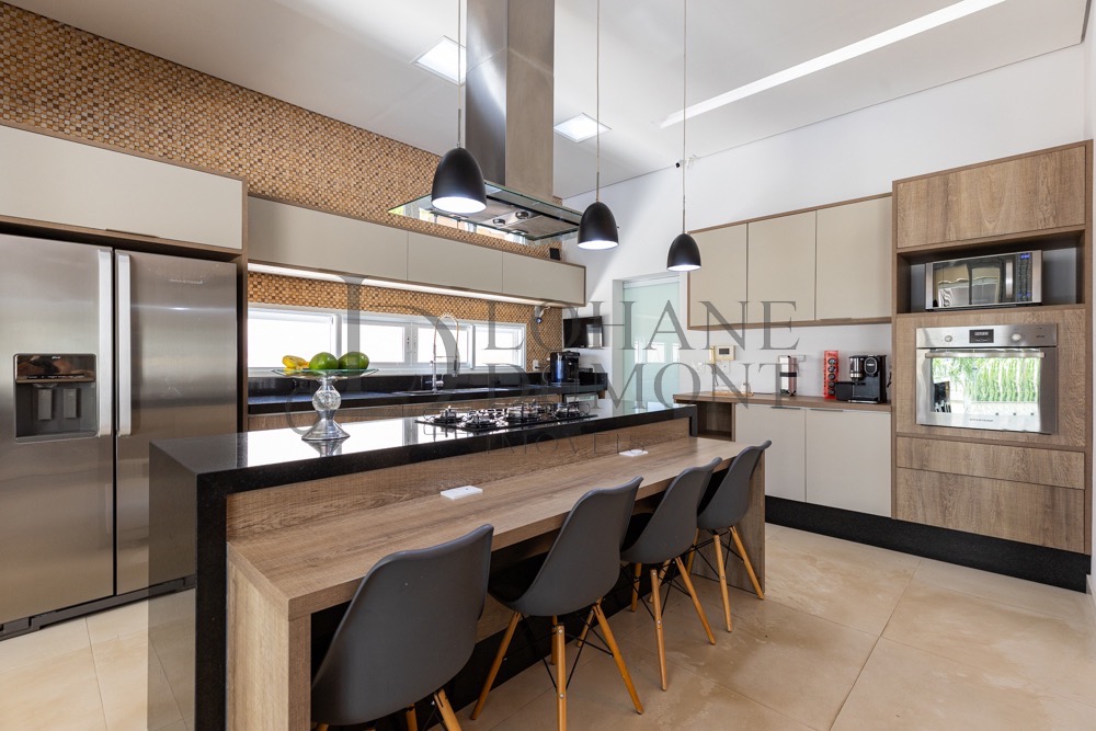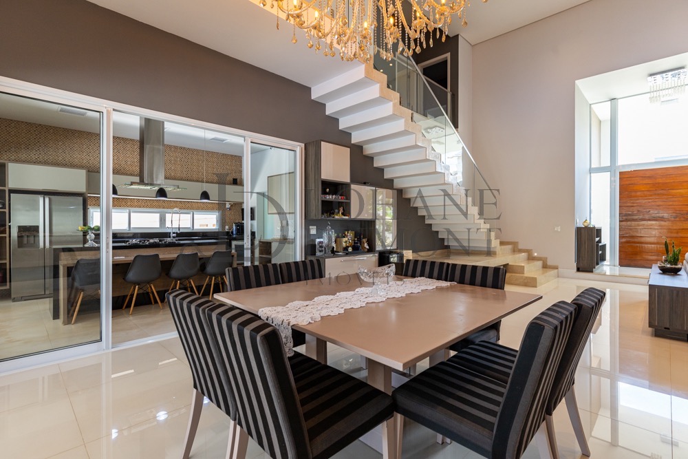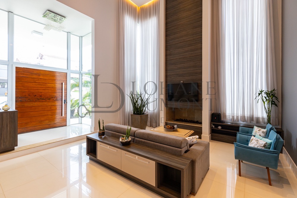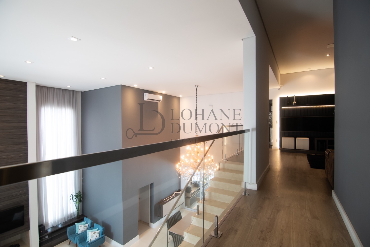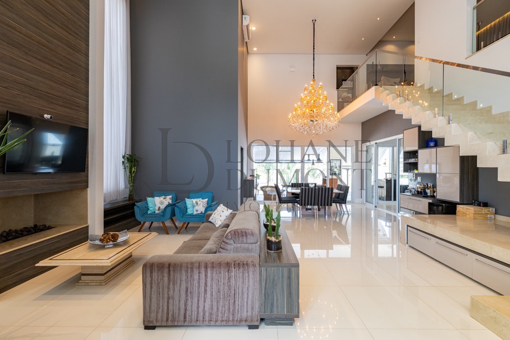 No pavimento térreo, o living impressiona pelo pé-direito duplo e pela lareira, criando um ambiente elegante, aconchegante e com excelente iluminação natural. A planta em conceito aberto integra perfeitamente os espaços sociais, incluindo escritório que pode ser revertido para suíte térrea, cozinha planejada com ilha central e despensa, garantindo funcionalidade e praticidade no dia a dia.