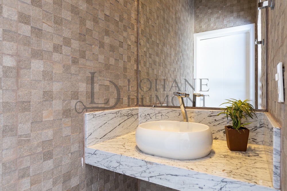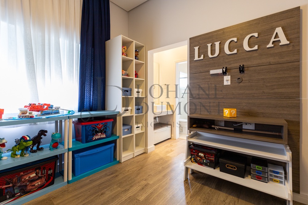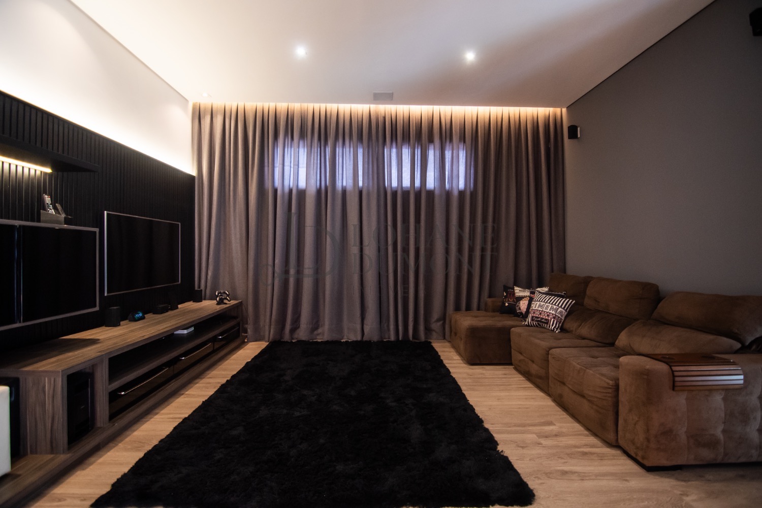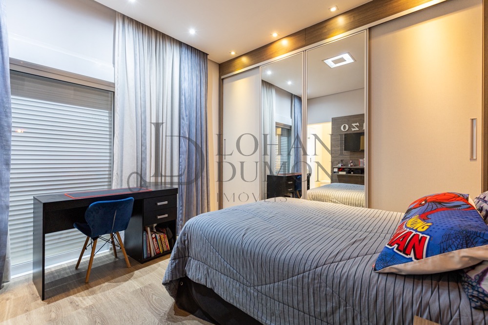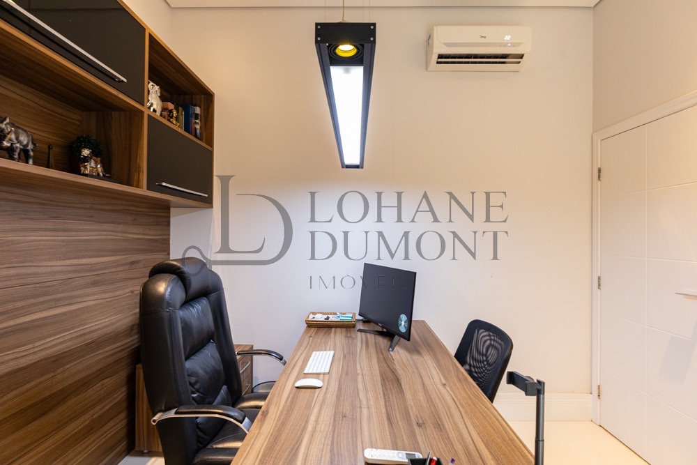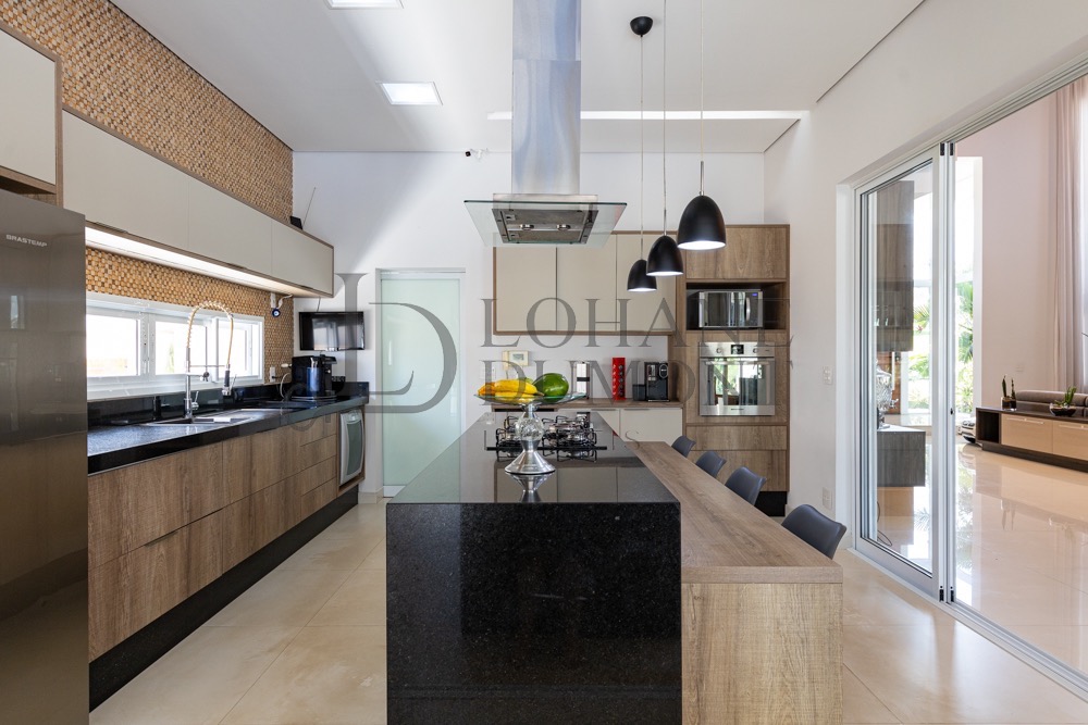 No pavimento térreo, o living impressiona pelo pé-direito duplo e pela lareira, criando um ambiente elegante, aconchegante e com excelente iluminação natural. A planta em conceito aberto integra perfeitamente os espaços sociais, incluindo escritório que pode ser revertido para suíte térrea, cozinha planejada com ilha central e despensa, garantindo funcionalidade e praticidade no dia a dia.