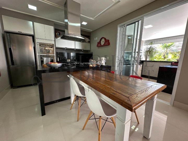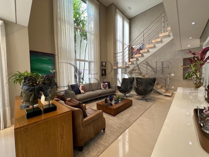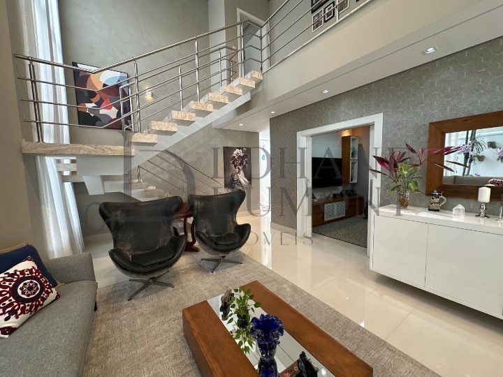 No pavimento térreo, os ambientes sociais se destacam pela harmonia e fluidez. A sala de estar espaçosa se integra à sala de TV, criando um ambiente acolhedor e sofisticado. A cozinha planejada alia design e funcionalidade, conectando-se de forma elegante ao espaço gourmet com churrasqueira, cenário perfeito para receber amigos e familiares com conforto e estilo.
