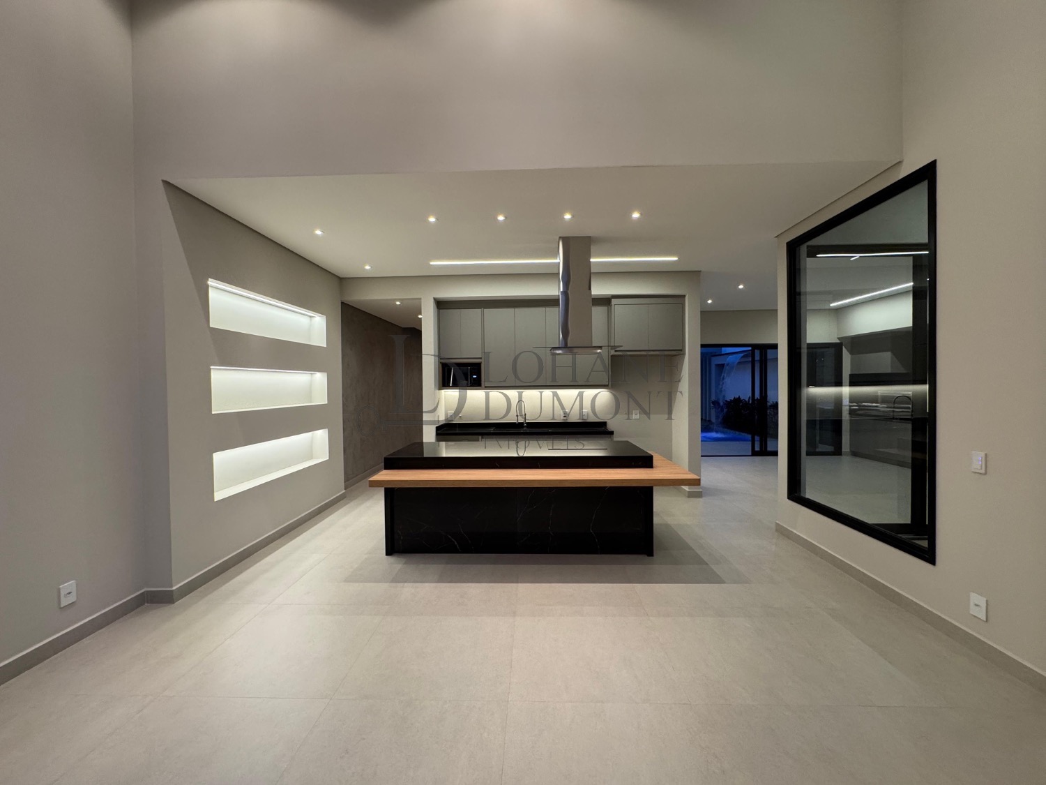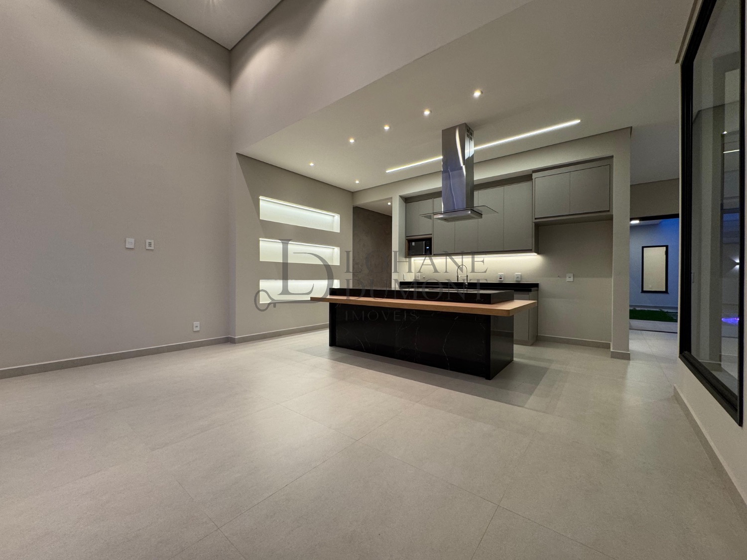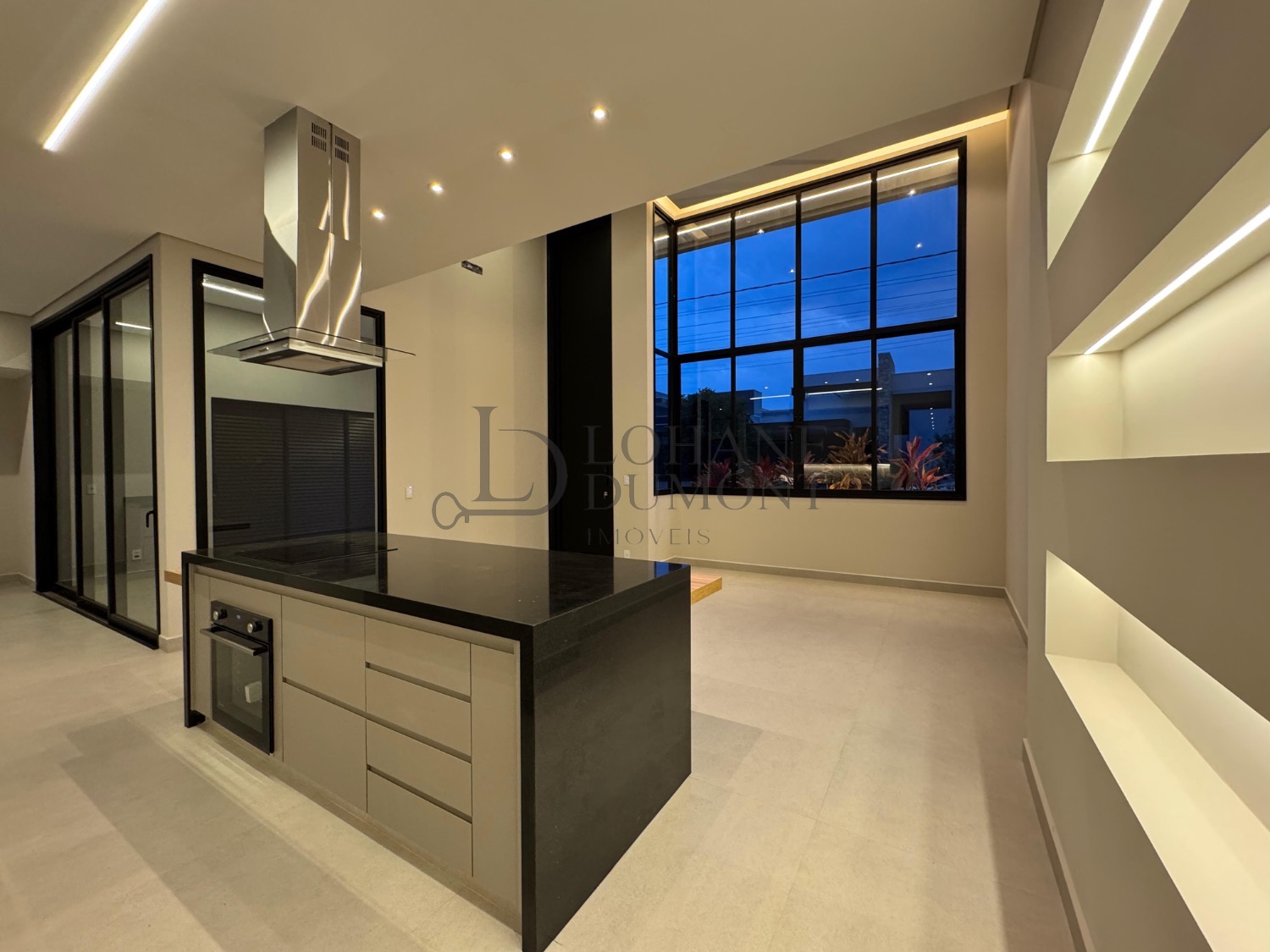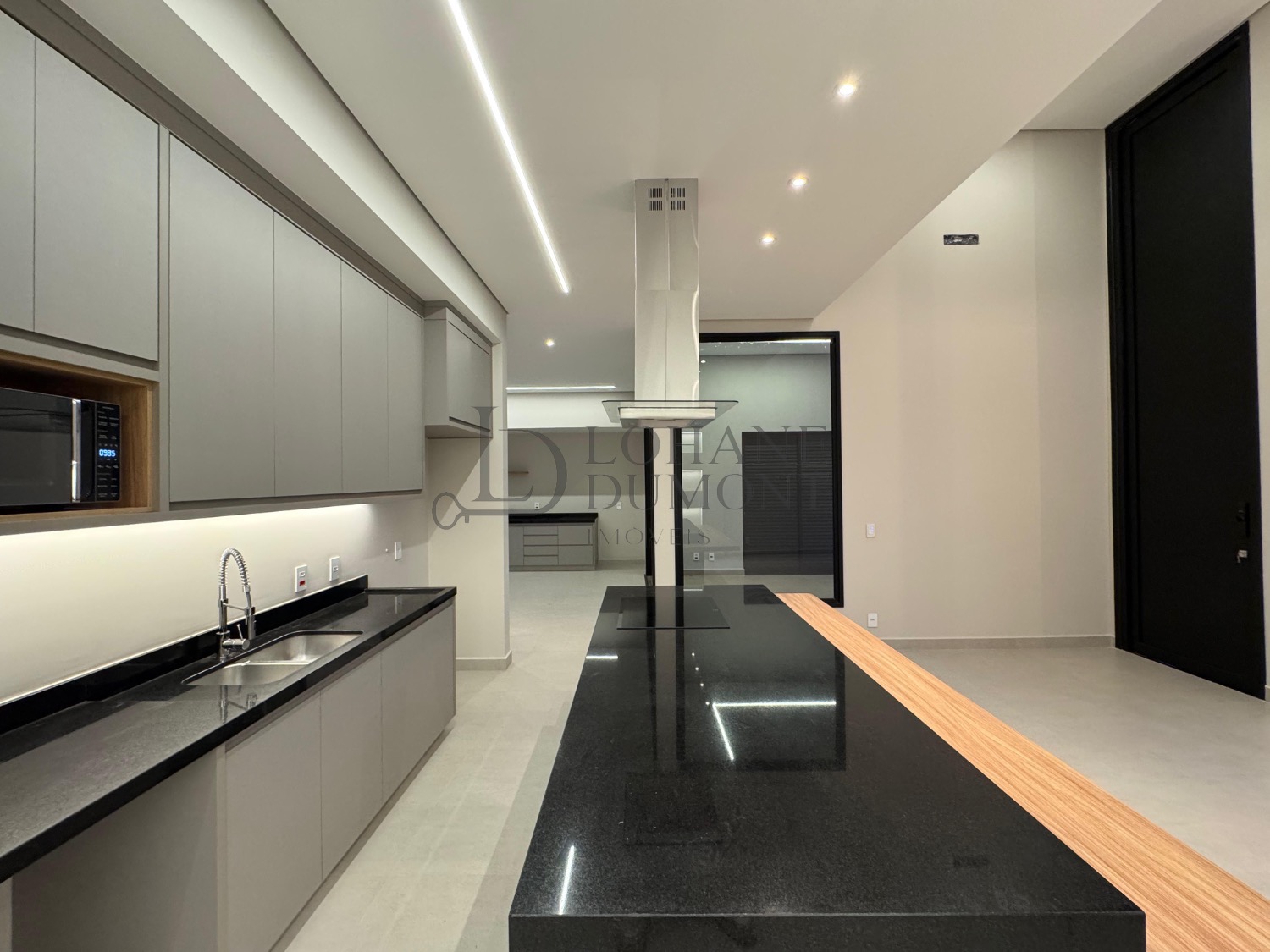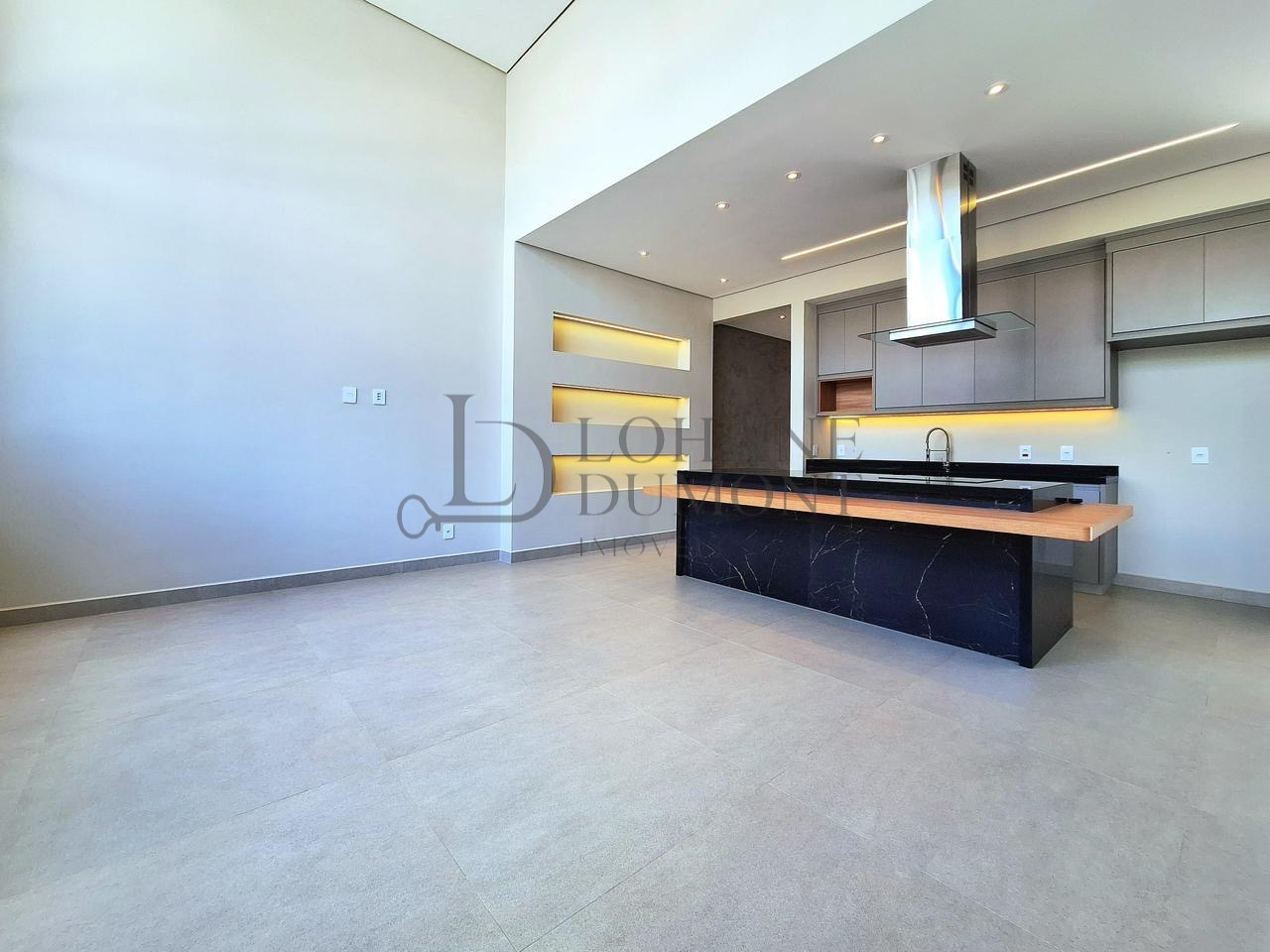 A cozinha, equipada com ilha, fogão cooktop e torre quente, integra-se harmoniosamente aos ambientes, reforçando a proposta de convivência e elegância.
