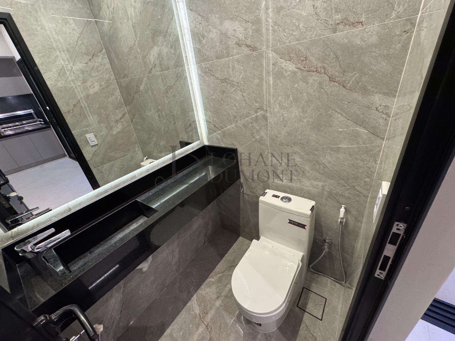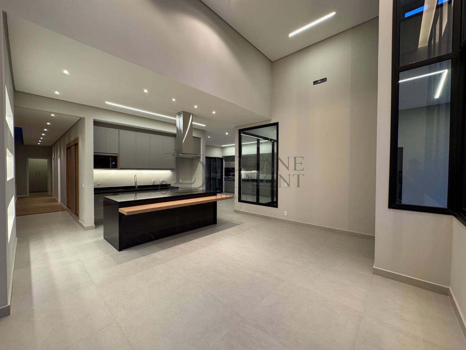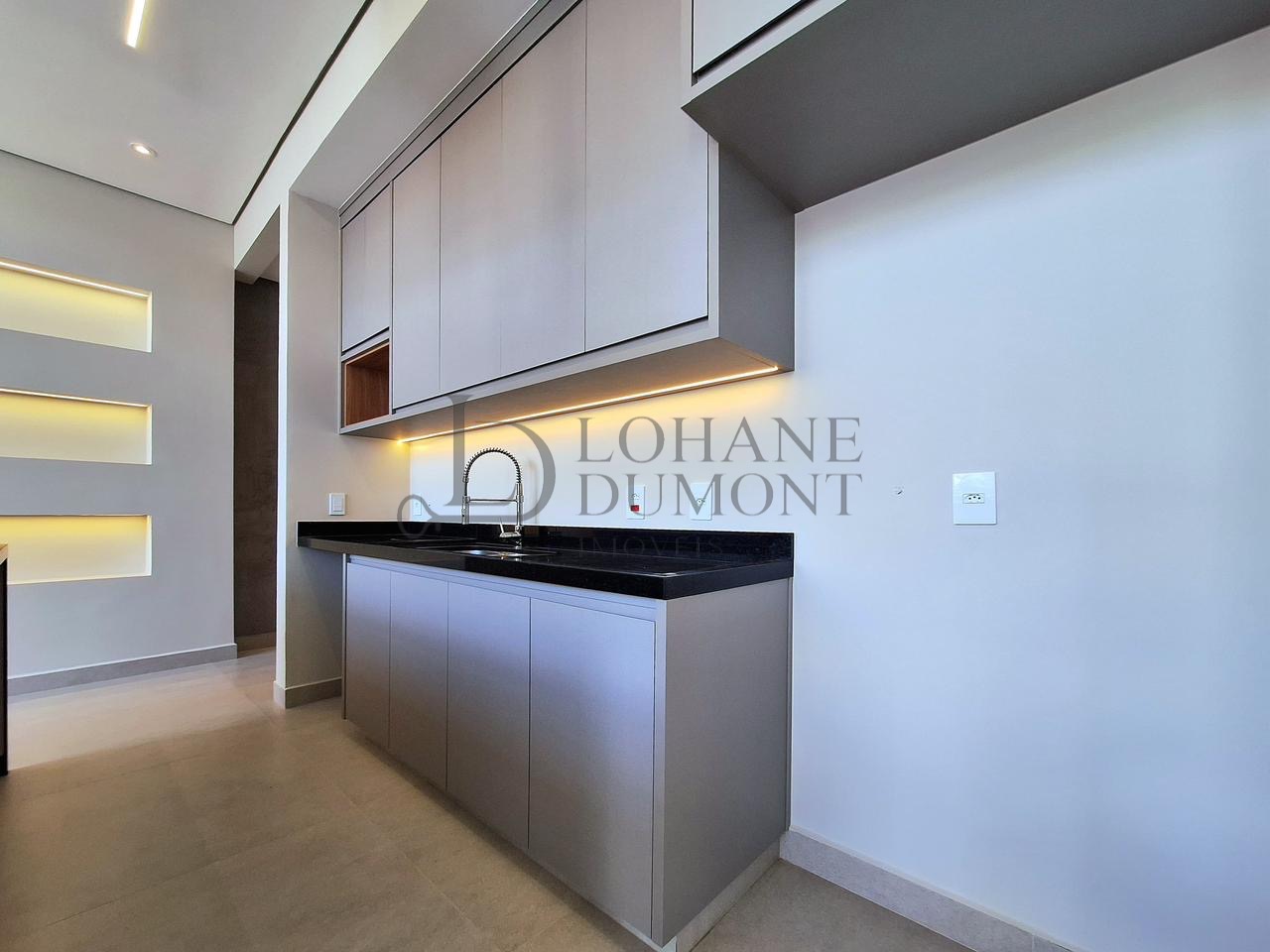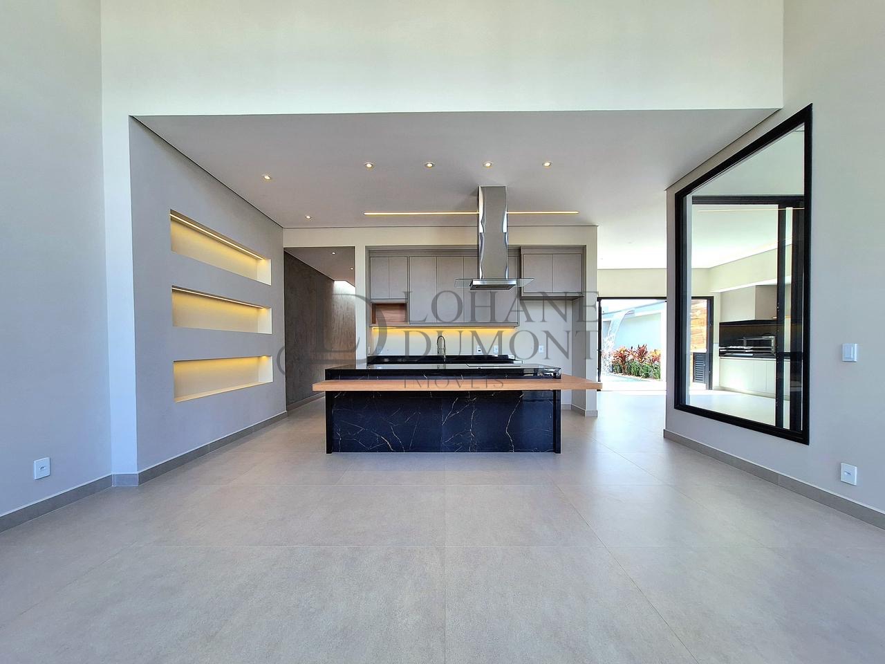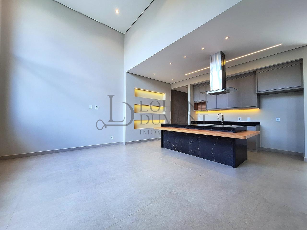 A cozinha, equipada com ilha, fogão cooktop e torre quente, integra-se harmoniosamente aos ambientes, reforçando a proposta de convivência e elegância.